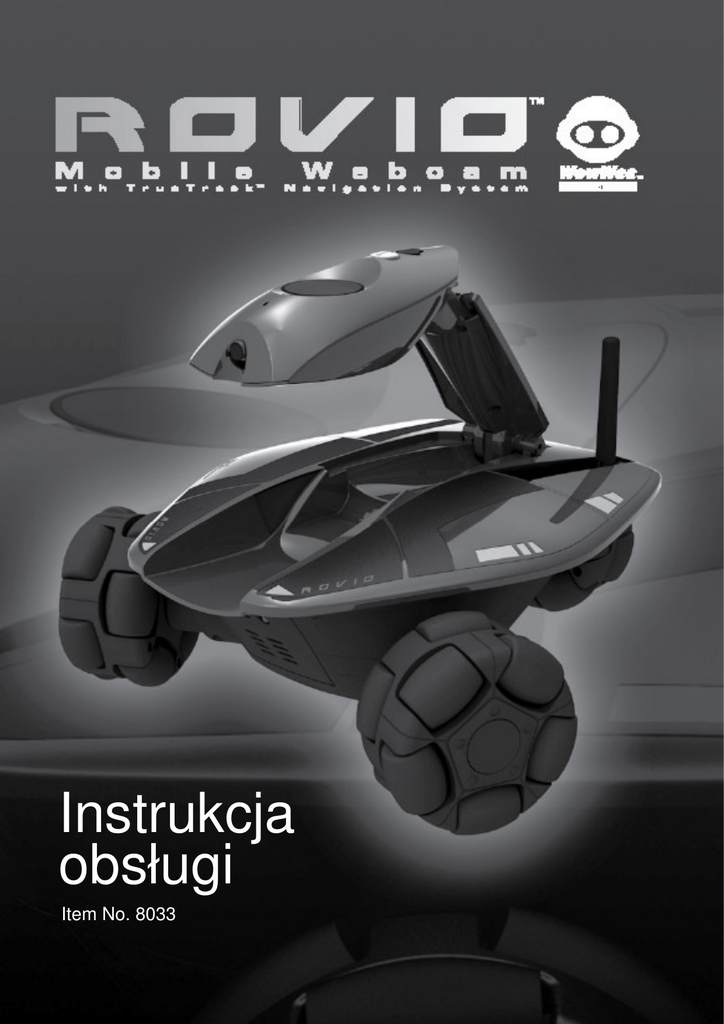 Instrukcja obsługi Item No. 8033 Spis treści Rozdział 1 Ogólnie o Rovio 6 Wprowadzenie 6 Zawartość opakowania Rovio. Opis .7 8 Rozdział 2 Pierwsze kroki 12 Potrzebny sprzęt 12 Akumulatory i zasilanie Wymagania dot. zasilania i akumulatorów Instalowanie akumulatora do Rovio Ustawianie stacji do ładowania 12 12 12 13 Ustawienie stacji Składanie stacji dokującej Rozkładanie stacji dokującej Ładowanie akumulatora Rovio instalacja oprogramowania Rovio 13 14 15 16 16 Rozdział 3 Konfiguracja.Rovio 18 Wymagania systemowe 18 Instacja oprogramowania.Rovio 19 PC . Macintosh Deinstalacja oprogramowania .Rovio . 28PC.users Mac.users. .19 23 28 28 Contents Rozdział 4 Użycie Rovio. Emitery TrueTrack. Wskaźnik zasilania LED Ekran użytkownika Rovio. Funkcje obsługiwane przez przeglądarkę internetową Opis interfejsu Komendy 30 30 31 31 . . . 32 33 34 Rozdział 5 Dostęp do Rovio przez lokalną sieć WiFi 48 Dostęp do.Rovio przez.Internet 49 Automatyczne ustawienia przekazywania portu 49 Wyłączanie.UPnP.on.Rovio Ręczne ustawienia portu .(zaawansowane) 49 50 Używanie nazw domen na.Rovio 51 Tworzenie, zapis i odtwarzanie ścierzek. 52 Tworzenie ścieżek Zmiana nazwy ścieżki .paths Odtwarzanie ścierzek 52 .52 53 .Ścierzki . 53 Rovio.jako kamera internetowa 53 Aktualizacja oprogramowania.Rovio. 54 .Powrót do domyślnych ustawień Rovio. 55 Odtwarzanie oprogramowania . . Odtwarzanie sprzętu. . . .55 .55 3 Contents Proste naprawy 56 Troska o Rovio 58 Środki ostrożności Bezpieczeństwo 58 58 Korzystanie z Rovio 58 Załączniki Załącznik A Kompatybilność Rovio Załącznik.B Terminologia Załącznik.C Ostrzeżenia Załącznik.D Specyfikacja. Załącznik .E Prawa autorskie i powiadomienia 4 60 60 61 61 62 62 63 63 64 64 Rozdział 1 Opis Opis Opis Wystaczy kilka minut by przeczytać ten podręcznik i nauczyć się prawidłowej konfiguracji Rovio . Wprowadzenie Rovio.to wyposażona w Wi-Fi.ruchoma kamera internetowa pozwalająca na zdalną obecność. Interakcje za pośrednictwem kamery, mikrofonu, itp. Praktycznie każde urządzenie wyposażone w dostęp- do Internetu pozwala Ci korzystać z twojego Rovio z dowolnego miejsca świata! Rovio jest prosty w obsłudze intuicyjny interfejs pozwala na nawigacje oraz zapis i odtwarzanie ścieżek. za pomocą systemu .emiterów TrueTrack™.Rovio sam zapamięta drogę! System automatycznego dokowania pozwala Rovio’sna samodzielny powrót do ładowarki. I uzupełnienie zasobów energii 6 Opis Zawartość opakowania W opakowaniu znajduje się 1.x.stacja dokująca z wbudowanym emiterem .TrueTrack™.. 1.x.maszt 1.x.Rovio™ Rovio™ Quick Start Guide Congratulations and welcome to the world of WowWee™ Technologies! This Quick start guide will help you get your Rovio™ up and running. For more information about za pomocą your Rovio, refer to the Rovio User manual. You can also visit the WowWee Support site at www.wowwee.com/support/rovio for the latest downloads, video tutorials, troubleshooting tips and Rovio online help. Checklist To get started, you will need: □ □ □ □ □ □ □ □ □ Rovio Charging ładowarka (w/ TrueTrack™ Beacon) Charging ładowarka mast Akumulatorpack AC/DC power adapter USB cable Phillips screwdriver (not included) Rovio Software Rovio Quick start guide You will also need to know: □ Your wireless router’s network ID (SSID) □ Your router’s encryption key (password), if you use one Here are the steps you will go through: 1.x.6.V.3000.mAH. akumulator NiMH.. 1. Setting up the charging ładowarka 2. Charging the akumulatorpack 3. Configuring your Rovio 4. Accessing Rovio’s interface User manual Item No. 8033 A 1.x.Jak zacząć podręcznik 1.x.8.V.AC/DC. zasilacz 1.x.Instrukcja obsługi 1.x.kabel USB. 7 Opis Rovio Rovio – jedym zdaniem Rovio. Łącze USB Szyja Włącznik zasilania Z wskaźnikiem LED. Antena Czujnik systemu nawigacji TrueTrack. Mikrofon Kamera Wskaźniki LED Czujniki podczerwieni . Światła przednie Wielokierunkowe koła Głośnik Rovio od dołu Pojemnik na akumulator Styki ładowania 8 Opis Rovio at a glance Stacja dokująca – akumulator Maszt ładowarki Emiter TrueTrack Metal.rim Styki ładowarki czujnik LED. Widok ładowarki od tyłu Ładowarka Wtyczka zasilania 8.V.AC/DC.adapter (zasilacz) 9 Ogólnie Rovio jednym zdaniem 10 Rozdział 2 Rozpoczynamy Rozpoczynamy Potrzebny sprzęt Rozpoczynamy This.section.describes.how.to.get.your.Rovio.up.and.running ..This.includes: •. Wymagany sprzęt •. Akumulator i zasilanie •. Ustawienia ładowarki •. Instalacja oprogramowania Rovio. Wymagany sprzęt Potrzebujesz wkrętaka.Phillips..(nie ma w zestawie) . Akumulator i zasilanie Ten rodział opisuje akumulator i zasilanie..Rovio oraz ładowarkę.z wbudowanym emiterem. TrueTrack. Wymagania dot. akumulatora i zasilania Rovio Rovio.wykorzystuje akumulator.6.V.NiMH..(jest w zestawie) Zobacz.rozdział instalowanie akumulatora na stronie.12 . Ładowarka i emiter TrueTrack™ Ładowarka z wbudowanym emiterem.TrueTrack™.potrzebuje zasilanie z .zasilacza 8V.AC/DC .. Zobacz.rozdział.ustawienia ładowarki.na.stronie.13 . Instalowanie.akumulatora Rovio’s. Zanim.rozpoczniesz korzystanie z .Rovio,.musisz zainstalować i naładowac akumulator. .. 1 .. Na spodzie Rovio znajdź klapkę pojemnika na akumulator i otwórz ją .. 2 .. Za pomocą śrubokręta .Phillips (nie ma w zestawie).odkręć śrubki od pokrywki i odsuń ją. . 3 .. Znajdź złączkę zasilania i wepnij wtyczkę akumulatora..Włóż akumulator do pojemnika 12 Rozpoczynanie Ustawienia ładowarki 4 .. Zakryj pokrywkę i zakręć śruby za pomocą.the.śrubokręta Nie zakręcaj zbyt mocno! .. .. Ustawienia ładowarki Ten rodział opisuje prawidłowe ustawienie i pracę.ładowarki Rovio. Lokalizacja Kiedy otworzysz opakowanie z.Rovio to znajdziesz ładowarkę rozłożoną na dwie części. Należy je złożyć a następnie ustawić emiter.TrueTrack. Zobacz rozdział „Składanie ładowarki na stronie .14 . By umożliwi