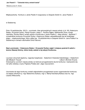 Jan Paweł II - "Człowiek który zmienił świat" Wpisany przez S. Sulisz Międzyszkolny Konkurs o Janie Pawle II rozgrywany w Zespole Szkół im. Jana Pawła II w Stobiernej. Dnia 10 października 2012 r. uczniowie klas gimnazjalnych naszej szkoły (z kl. IIA: Katarzyna Stalec, Krzysztof Sulisz, Patryk Kozak z klasy I: Paulina Słąba, Aleksandra Zima, Kinga Jasińska, Dorota Sitarz) wzięli udział w Konkursie o Janie Pawle II - etap szkolny. Spośród 7 uczestników konkursu Krzysztof Sulisz i Katarzyna Stalec zakwalifikowali się do kolejnego etapu - międzyszkolnego, który odbył się 19 października w Zespole Szkół im. Jana Pawła II w Stobiernej w ramach obchodów Dnia Patrona. Nasi uczniowie: Katarzyna Stalec i Krzysztof Sulisz zajęli I miejsce pośród 9 szkół z terenu Naszej Gminy, które brały udział w tej edycji Konkursu. Laureaci otrzymali dyplomy, nagrody książkowe: Katechizm Kościoła Katolickiego, Katechizm dla Młodych Youcat i album Brońcie Krzyża. Gratulujemy uczniom naszej szkoły za twórcze przygotowanie się do konkursu i wykazanie się nie tylko wiedzą o życiu Papieża Polaka ale i Jego nauczaniem. Uczniowie do tego konkursu zostali odpowiednio przygotowani przez organizatorów konkursu na etapie szkolnym p. mgr Sławomira Sulisza, mgr s. Marię Karolianę Buksa oraz ks. mgr Leszka Wieczorka. 1/2 Jan Paweł II - "Człowiek który zmienił świat" Wpisany przez S. Sulisz Kasia i Krzysztof - zwycięzcy konkursu 2/2