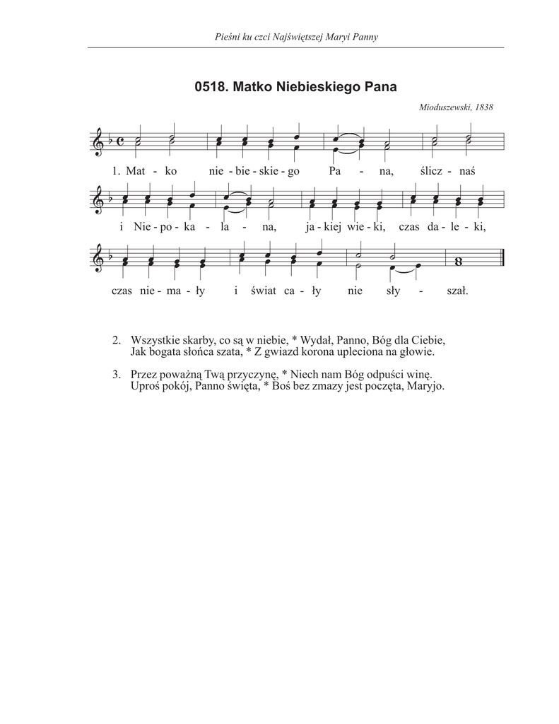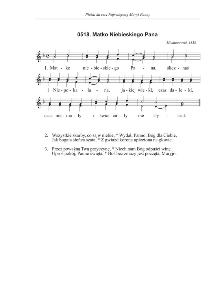 Pieśni ku czci Najświętszej Maryi Panny 0518. Matko Niebieskiego Pana Mioduszewski, 1838 1. Mat - ko nie - bie - skie - go i Nie - po - ka - la czas nie - ma - ły - i na, Pa - na, ja - kiej wie - ki, świat ca - ły nie ślicz - naś czas da - le - ki, sły - 2. Wszystkie skarby, co są w niebie, * Wydał, Panno, Bóg dla Ciebie, Jak bogata słońca szata, * Z gwiazd korona upleciona na głowie. 3. Przez poważną Twą przyczynę, * Niech nam Bóg odpuści winę. Uproś pokój, Panno święta, * Boś bez zmazy jest poczęta, Maryjo. szał.