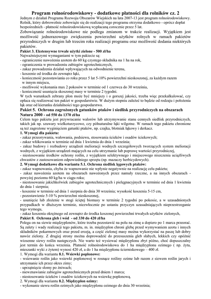 Program rolnośrodowiskowy - dodatkowe płatności dla rolników cz. 2 Jednym z działań Programu Rozwoju Obszarów Wiejskich na lata 2007-13 jest program rolnośrodowiskowy. Rolnik, który dobrowolnie zobowiąże się do realizacji tego programu otrzyma dodatkowo - oprócz dopłat bezpośrednich - płatność rolnośrodowiskową wypłacaną corocznie przez 5 lat. Zobowiązanie rolnośrodowiskowe nie podlega zmianom w trakcie realizacji. Wyjątkiem jest możliwość jednorazowego zwiększenia powierzchni użytków rolnych w ramach pakietów przyrodniczych w drugim lub trzecim roku realizacji programu oraz możliwość dodania niektórych pakietów. Pakiet 3. Ekstensywne trwałe użytki zielone - 500 zł/ha Najważniejszymi wymaganiami w tym pakiecie są: - ograniczenie nawożenia azotem do 60 kg czystego składnika na 1 ha na rok, - ograniczenia w prowadzeniu zabiegów agrotechnicznych, - zakaz prowadzenia działań wpływających na odwodnienie terenu, - koszenie od środka do zewnątrz łąki, - konieczność pozostawiania co roku przez 5 lat 5-10% powierzchni nieskoszonej, za każdym razem w innym miejscu, - możliwość wykonania max 2 pokosów w terminie od 1 czerwca do 30 września, - konieczność usunięcia skoszonej masy w terminie 2 tygodni. W tych warunkach zebrany plon może być mniejszy i o gorszej jakości, trzeba więc przekalkulować, czy opłaca się realizować ten pakiet w gospodarstwie. W dużym stopniu zależeć to będzie od rodzaju i położenia łąk oraz od kierunku działalności tego gospodarstwa. Pakiet 5. Ochrona zagrożonych gatunków ptaków i siedlisk przyrodniczych na obszarach Natura 2000 - od 550 do 1370 zł/ha Celem tego pakietu jest przywracanie walorów lub utrzymywanie stanu cennych siedlisk przyrodniczych, takich jak np. szuwary wielkoturzycowe, czy półnaturalne łąki wilgotne. W ramach tego pakietu chronione są też zagrożone wyginięciem gatunki ptaków, np. czajka, błotniak łąkowy i derkacz. 1. Wymogi dla pakietu: - zakaz przeorywania, wałowania, podsiewu, stosowania ścieków i osadów ściekowych; - zakaz włókowania w terminie od dnia 1 kwietnia do dnia 1 września; - zakaz budowy i rozbudowy urządzeń melioracji wodnych szczegółowych tworzących system melioracji wodnych, z wyjątkiem urządzeń mających na celu utrzymanie lub poprawę wartości przyrodniczej, - niestosowanie środków ochrony roślin, z wyjątkiem selektywnego i miejscowego niszczenia uciążliwych chwastów z zastosowaniem odpowiedniego sprzętu (np. mazaczy herbicydowych). 2. Wymogi dodatkowe dla wariantu 5.1. Ochrona siedlisk lęgowych ptaków: - zakaz wapnowania, chyba że wapnowanie nie wpłynie negatywnie na realizację celu pakietu; - zakaz nawożenia azotem na obszarach nawożonych przez namuły rzeczne, a na innych obszarach powyżej poziomu 60 kg/ha w ciągu roku; - niestosowanie jakichkolwiek zabiegów agrotechnicznych i pielęgnacyjnych w terminie od dnia 1 kwietnia do dnia 1 sierpnia; - koszenie w terminie od dnia 1 sierpnia do dnia 30 września; wysokość koszenia 5-15 cm, - pozostawienie 5-10 % powierzchni nieskoszonej, - usunięcie lub złożenie w stogi ściętej biomasy w terminie 2 tygodni po pokosie, a w uzasadnionych przypadkach w dłuższym terminie, niezwłocznie po ustaniu przyczyn uzasadniających nieprzestrzeganie tego wymogu, - zakaz koszenia okrężnego od zewnątrz do środka koszonej powierzchni trwałych użytków zielonych, Pakiet 8. Ochrona gleb i wód - od 330 do 420 zł/ha Polega on na siewie międzyplonów, które trzeba pozostawić na polu na zimę a dopiero po 1 marca przeorać. Są zalety i wady realizacji tego pakietu, m. in. międzyplon chroni glebę przed wymywaniem azotu i innych składników pokarmowych oraz przed erozją, a część zielonej masy można wykorzystać na paszę lub dobry nawóz zielony. Z drugiej strony można doprowadzić do przesuszenia gleb słabych, lekkich czy opóźnić wiosenne siewy roślin następczych. Nie warto też wysiewać międzyplonu zbyt późno, choć dopuszczalny jest termin do końca września. Płatność rolnośrodowiskowa do 1 ha międzyplonu ozimego ( np. żyta, mieszanki wyki z żytem) wynosi 420 zł, a do 1 ha międzyplonu ścierniskowego – 400 zł. 1. Wymogi dla wariantu 8.1. Wsiewki poplonowe: - wsiewanie roślin jako wsiewki poplonowej w rosnące rośliny ozime lub razem z siewem roślin jarych i utrzymanie ich przez okres zimy; - uprzątnięcie słomy po żniwach; - niewznawianie zabiegów agrotechnicznych przed dniem 1 marca; - niestosowanie ścieków i osadów ściekowych na wsiewkę poplonową. 2. Wymogi dla wariantu 8.2. Międzyplon ozimy: - wykonanie siewu roślin ozimych jako międzyplonu ozimego do dnia 30 września; - niestosowanie pod międzyplon ozimy innych nawozów niż naturalne; - niestosowanie ścieków i osadów ściekowych na międzyplon ozimy; - zakaz spasania międzyplonu ozimego poza okresem wiosny; - niewznawianie zabiegów agrotechnicznych przed dniem 1 marca; - zakaz uprawy w plonie głównym rośliny, która była uprawiana w międzyplonie ozimym, lub formy jarej takiej rośliny; 3. Wymogi dla wariantu 8.3. Międzyplon ścierniskowy: - wykonanie siewu roślin jarych jako międzyplonu ścierniskowego do dnia 30 września; - niestosowanie pod międzyplon ścierniskowy innych nawozów niż naturalne; - niestosowanie ścieków i osadów ściekowych na międzyplon ścierniskowy; - możliwość spasania biomasy międzyplonu ścierniskowego w okresie jesieni; - niewznawianie zabiegów agrotechnicznych przed dniem 1 marca; - zakaz uprawy w plonie głównym rośliny, która była uprawiana w międzyplonie ścierniskowym; Wszelkie informacje na ich temat oraz pomoc przy sporządzaniu niezbędnej dokumentacji tj. planu rolnośrodowiskowego i wniosku można uzyskać u doradcy rolnośrodowiskowego, pracującego w TZD Wyszków - MODR Warszawa na terenie gminy Brańszczyk. Można zgłaszać się do Gminnego Biura Doradczego od poniedziałku do piątku w godz