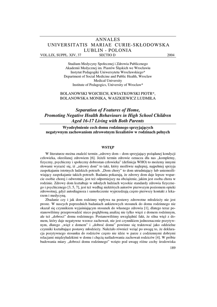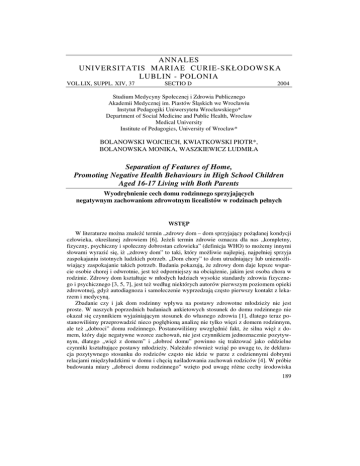 ANNALES UNIVERSITATIS MARIAE CURIE-SKŁODOWSKA LUBLIN - POLONIA VOL.LIX, SUPPL. XIV, 37 SECTIO D 2004 Studium Medycyny Społecznej i Zdrowia Publicznego Akademii Medycznej im. Piastów Śląskich we Wrocławiu Instytut Pedagogiki Uniwersytetu Wrocławskiego* Department of Social Medicine and Public Health, Wroclaw Medical University Institute of Pedagogics, University of Wroclaw* BOLANOWSKI WOJCIECH, KWIATKOWSKI PIOTR*, BOLANOWSKA MONIKA, WASZKIEWICZ LUDMIŁA Separation of Features of Home, Promoting Negative Health Behaviours in High School Children Aged 16-17 Living with Both Parents Wyodrębnienie cech domu rodzinnego sprzyjających negatywnym zachowaniom zdrowotnym licealistów w rodzinach pełnych WSTĘP W literaturze można znaleźć termin „zdrowy dom – dom sprzyjający pożądanej kondycji człowieka, określanej zdrowiem [6]. Jeżeli termin zdrowie oznacza dla nas „kompletny, fizyczny, psychiczny i społeczny dobrostan człowieka” (definicja WHO) to możemy innymi słowami wyrazić się, iż „zdrowy dom” to taki, który możliwie najlepiej, najpełniej sprzyja zaspokajaniu istotnych ludzkich potrzeb. „Dom chory” to dom utrudniający lub uniemożliwiający zaspokajanie takich potrzeb. Badania pokazują, że zdrowy dom daje lepsze wsparcie osobie chorej i odwrotnie, jest też odporniejszy na obciążenie, jakim jest osoba chora w rodzinie. Zdrowy dom kształtuje w młodych ludziach wysokie standardy zdrowia fizycznego i psychicznego [3, 5, 7], jest też według niektórych autorów pierwszym poziomem opieki zdrowotnej, gdyż autodiagnoza i samoleczenie wyprzedzają często pierwszy kontakt z lekarzem i medycyną. Zbadanie czy i jak dom rodzinny wpływa na postawy zdrowotne młodzieży nie jest proste. W naszych poprzednich badaniach ankietowych stosunek do domu rodzinnego nie okazał się czynnikiem wyjaśniającym stosunek do własnego zdrowia [1], dlatego teraz postanowiliśmy przeprowadzić nieco pogłębioną analizę nie tylko więzi z domem rodzinnym, ale też „dobroci” domu rodzinnego. Postanowiliśmy uwzględnić fakt, że silna więź z domem, który daje negatywne wzorce zachowań, nie jest czynnikiem jednoznacznie pozytywnym, dlatego „więź z domem” i „dobroć domu” powinno się traktować jako oddzielne czynniki kształtujące postawy młodzieży. Należało również wziąć po uwagę to, że deklaracja pozytywnego stosunku do rodziców często nie idzie w parze z codziennymi dobrymi relacjami międzyludzkimi w domu i chęcią naśladowania zachowań rodziców [4]. W próbie budowania miary „dobroci domu rodzinnego” wzięto pod uwagę różne cechy środowiska 189 rodzinnego [2]. W budowie ankiety i analizie wyników uwzględniono wyniki badań publikowane przez Woynarowską i Mazur [8, 9, 10]. CEL BADAŃ Wyodrębnienie cech domu rodzinnego sprzyjających negatywnym zachowaniom zdrowotnym licealistów z klas ogólnokształcących i profilowanych w rodzinach pełnych (dziecko mieszka z obojgiem rodziców). MATERIAŁ I METODA Analizowano odpowiedzi ankietowe 293 uczniów 1 i 2 klas liceów ogólnokształcących (LO) i liceów profilowanych (LP) miasta Wrocławia, którzy deklarowali, iż mieszkają z obojgiem rodziców. 70 osób było w wieku 16 lat (24%), 182 osoby 17 lat (62%), 34 osoby – 18 lat (12%). Anonimowa ankieta, przeprowadzona w styczniu 2004 roku, składała się z pytań o płeć i wiek oraz stwierdzeń, do których należało się ustosunkować, zaznaczając tylko te, które opisują badanego (odpowiadają jego osobie). Wybrane dla celów niniejszej pracy stwierdzenia umieszczono w Tabeli 1. 135 badanych uczęszczało do LO, 158 do LP; 98 – kl. 1, 195 kl. 2; 99 M, 194 K. Do analizy statystycznej użyto pakietu STATISTICA firmy Statsoft. WYNIKI Wskaźniki opisujące dom rodzinny rzutujące na znalezienie się młodego człowieka w poszczególnych grupach ryzyka zdrowotnego są różne (Tabela 1). Do dalszej analizy wybrano osiem wskaźników charakteryzujących rodziców, które najlepiej korelowały z zachowaniami ryzykownymi młodzieży. Tabela 1. Istotne współwystępowanie stwierdzeń charakteryzujących stosunki w domu rodzinnym i ryzykownych zachowań zdrowotnych ucznia. W tabeli umieszczono prawdopodobieństwa z testu chi kwadrat, jeżeli były mniejsze niż 0,10 oraz znaki współczynników korelacji Spearmana („+” – korelacja dodatnia, „–” – korelacja ujemna). Ucznia zaklasyfikowano do grupy zachowań ryzykownych (wg Tabeli 1): Stwierdzenie 1.spędzam mało czasu z rodzicami 2.lubię przebywać z ojcem lub z matką, czy jest to rozmowa, czy milczenie 3.wiem (lub wydaje mi się), że rodzice piją dużo alkoholu 4.rodzice mają bardzo niskie wykształcenie Spoż. alkoholu 0,043 + Palenie papierosów Używanie narkotyków Częste niewyspanie Niepr. Odżywianie 0,003 + 0,052 + 0,001 + 0,043 - 0,080 - 0,009 + 0,004 + 0,015 + 0,045 + Autoagresja Niezapinanie pasów bezp. Brak Dbałości o zęby Wczesne rozp. Współż. 0,015 + 0,038 - 0,031 - 0,060 + 0,019 + 0,000 + 190 5.moi rodzice ciągle się kłócą 6.rodzice w sposób przyjazny rozmawiają ze mną o mojej przyszłości 7.nie lubię spędzać czasu z rodzicami i unikam ich, jeśli mogę 8.bardzo chciałbym spędzać więcej czasu z rodzicami – brak mi ich 9. rodzice pomagają mi w nauce 10. rodzice płacą za korepetycje dla mnie 11. rodzice płacą za moją naukę języków poza szkołą 0,092 + 0,060 + 0,095 - 0,007 + 0,082 + 0,026 - 0,008 + 0,084 + 0,000 + 0,012 + 0,001 + 0,028 - 0,017 + 0,026 + Powyższe wyniki pokazują, że różne negatywne cechy domu rodzinnego mają związek z różnymi zachowaniami ryzykownymi młodzieży. Deklaracja ucznia, że spędza mało czasu z rodzicami istotnie współwystępuje i koreluje dodatnio z przynależnością młodego człowieka do pięciu grup ryzykownych zachowań zdrowotnych: nadużywających alkoholu, używających narkotyków, nie dbających o sen, nieregularnie się odżywiających i nieużywaj