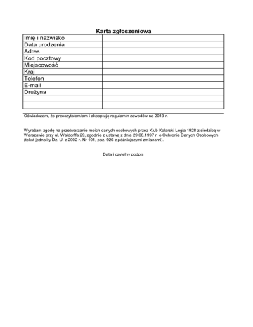 Karta zgłoszeniowa Imię i nazwisko Data urodzenia Adres Kod pocztowy Miejscowość Kraj Telefon E-mail Drużyna Oświadczam, że przeczytałem/am i akceptuję regulamin zawodów na 2013 r. Wyrażam zgodę na przetwarzanie moich danych osobowych przez Klub Kolarski Legia 1928 z siedzibą w Warszawie przy ul. Waldorffa 29, zgodnie z ustawą z dnia 29.08.1997 r. o Ochronie Danych Osobowych (tekst jednolity Dz. U. z 2002 r. Nr 101, poz. 926 z późniejszymi zmianami). Data i czytelny podpis