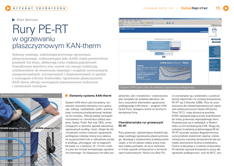 aa r r t t yy kk uu ł ł l i sl it sot p 5 )) oa p ad d 2200 1100 (( 5 tt ee cc hh nn i i cc zz nn yy 1 13 Piotr PiotrBertram Bertram Rury PE-RT PE-RT ogrzewaniu płaszczyznowym w ogrzewaniu KAN-therm płaszczyznowym KAN-therm Systemy Systemy wodnego, wodnego,niskotemperaturowego niskotemperaturowegoogrzewania ogrzewania płaszczyznowego, płaszczyznowego,wykorzystujące wykorzystującejako jakoźródło źródłociepła ciepłapowierzchnie powierzchnie posadzek lub lubścian, ścian,zdobywają zdobywającoraz corazwiększą większąpopularność. popularność. posadzek Poszukiwaniekomfortu komfortuoraz orazwzrost wzrostcen cenenergii energii mobilizują Poszukiwanie mobilizują użytkownikówdo dostosowania stosowaniainstalacji instalacji i urządzeń nowoczesnych, użytkowników i urządzeń nowoczesnych, energooszczędnych,wytwarzanych wytwarzanychi eksploatowanych i eksploatowanych w zgodzie energooszczędnych, w zgodzie wymogami ochrony ochronyśrodowiska. środowiska. Ogrzewanie płaszczyznowe zz wymogami KAN- therm płaszczyznowe oferuje rozwiązania zaawansowane techniczne Ogrzewanie KAN-therm oferuje rozwiązania i nieustannie rozwijane. zaawansowane techniczne i nieustannie rozwijane. Systemy mocowania rur KAN-therm Systemy mocowania rur KAN-therm ■ Elementy systemuKAN-therm KAN-therm Elementy systemu System KAN-therm jest kompletny, tzn. zawiera wszystkie elementy (rury grzewcze, System KAN-therm jest kompletny, tzn. izolacje, szafki, automatykę zawiera rozdzielacze, wszystkie elementy (rury grzewicze, armaturę przyłączeniową) niezbędne do izolacje, rozdzielacze, szafki, automamontażu. Oferuje paletę rozwiązań mocotykę i armaturę przyłączeniową) niezbędwania i konstrukcji izolacji (systemy Tane do rur montażu. Oferuje paletę rozwiązań cker, Profil, Rail TBS), umożliwiających mocowania rur oraz i konstrukcji izolacji (sysw dowolny sposób ogrzewatemy Tacker, Profil,zabudowę Rail oraz TBS), umożnych podłógwi ścian. Dzięki tej różnorodnoliwiających dowolny sposób zabudowę ści można wykonać ogrzewanie podłogowe ogrzewanych podłóg i ścian. Dzięki tej różmetodą mokrą (rurywykonać zalewaneogrzewanie są jastrynorodności można chem) lub w metodą zabudowie suchej (zzalewapodłogą podłogowe mokrą (rury „pływającą” lub na lub legarach). Na bazie rur o ne są jastrychem) w zabudowie suchej średnicy 12 „pływającą” i 14 mm możliwy jestlegarach). też montaż (z podłogą lub na kompletnego Na bazie rur oogrzewania średnicy 12ściennego. i 14 mm możliDo nie tylko projektantów, ale i wy dyspozycji jest też montaż kompletnego ogrzewainwestorów i wykonawców jestnie narzędzie do nia ściennego. Do dyspozycji tylko pro- Program KAN KAN Quick ogrzewania podłogowego Program QuickFloor Floordo dokalkulacji kalkulacji ogrzewania podłogowego szybkiej kalkulacji i doboru wszystkich elejektantów, ale i inwestorów i wykonawców mentów ogrzewania podłogowego jest narzędzie do szybkiej kalkulacjiKANi dotherm – program elementów KAN Quick Floor, dostępboru wszystkich ogrzewania ny on-line na stronie internetowej firmy. podłogowego KAN-therm – program KAN Quick Floor, dostępny online na stronie internetowej firmy. Charakterystyka rur grzewczych PE-RT Rury grzewcze, najistotniejszy składnik każCharakterystyka rur grzewczych dego wodnego ogrzewania płaszczyznowePE-RT go, decydują o skuteczności przekazywania ciepła, a od ich jakości zależy praca instaRury grzewcze, najistotniejszy składnik każlacji pamiętać, że są to elementy dego(należy wodnego ogrzewania płaszczyznowew sposób umieszczoneprzekazywania w konstrukgo,trwały decydują o skuteczności cjach Nowe rurypraca Blue instaFloor ciepła,budowlanych). a od ich jakości zależy wytwarzane są z polietylenu o podwyższolacji (należy pamiętać, że są to elementy nej odporności naumieszczone wysokie temperatury PEw trwały sposób w konstrukRT typbudowlanych). II (Dowlex 2388). Rury te, Blue przeznacjach Nowe rury Flo- czone dla niskotemperaturowych or wytwarzane są z polietylenu oogrzewań podwyżpłaszczyznowych 4/6 barów, Tmax szonej odporności(klasa na wysoką temperaturę 70oC), powłokę EVOH zaPE-RT mają typ II skuteczną (Dowlex 2388). Rury te, przebezpieczającą przed przenikaniem do ogrzewody znaczone dla niskotemperaturowych grzewczej niepożądanego tlenu. wań płaszczyznowych (klasa 4/6Produkobarów, wane w zakładach w Białymstoku na linii Tmaxsą 70°C), mają skuteczną powłokę produkcyjnej KAN. Mogąprzed się wykazać trwaEVOH zabezpieczającą przenikaniem łością przekraczającą 50 lat. do wody grzewczej niepożądanego tlenu. PE-RT pozwalasą uzyskać długoterminową Produkowane w zakładach w Białymwytrzymałość (stabilność cieplną i ciśniestoku na linii produkcyjnej KAN. Mogą się niową) przy wysokiej przekraczającą temperaturze bez powykazać trwałością 50 lat. trzeby struktury polietylenu. CePE-RT sieciowania pozwala uzyskać długoterminową cha ta decyduje(stabilność o trwałościcieplną przewodów. wytrzymałość i ciśnieW zakresie temperatury pracy niową) przytypowej wysokiej temperaturze bezdla poogrzewań podłogowych, czylipolietylenu. do 60oC, trzeby sieciowania struktury prognozowany okresoeksploatacji rur PE-RT Cecha ta decyduje trwałości przewodów. sięga nawet typowej 100 lat. Przeprowadzone badaW zakresie temperatury pracy dla nia próbek podłogowych, rur pochodzących pracującej ogrzewań czyliz do 60°C, pro- a r t y k u ł t e c h n i c z n y Rury grzewcze PE-RT KAN-therm Blue Floor listopad ki swojej elastyczności są łatwe w układaniu, nawet w niskiej temperaturze. Cecha ta jest bardzo ceniona przez monterów układających pętle grzewcze w różnych warunkach montażu np. w nieogrzewanych pomieszczeniach.Rury PE-RT charakteryzują się także uzyskaną w procesie wytłaczania wysoką gładkością ścianek (większą w porównaniu z rurami PE-X lub PB) mając