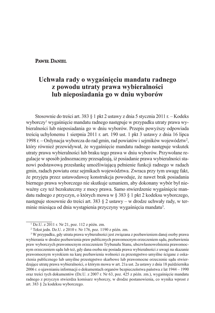 PAWEł dAnIEL Uchwała rady o wygaśnięciu mandatu radnego z powodu utraty prawa wybieralności lub nieposiadania go w dniu wyborów Stosownie do treści art. 383 § 1 pkt 2 ustawy z dnia 5 stycznia 2011 r. – Kodeks wyborczy1 wygaśnięcie mandatu radnego następuje w przypadku utraty prawa wybieralności lub nieposiadania go w dniu wyborów. Przepis powyższy odpowiada treścią uchylonemu 1 sierpnia 2011 r. art. 190 ust. 1 pkt 3 ustawy z dnia 16 lipca 1998 r. – Ordynacja wyborcza do rad gmin, rad powiatów i sejmików województw2, który również przewidywał, że wygaśnięcie mandatu radnego następuje wskutek utraty prawa wybieralności lub braku tego prawa w dniu wyborów. Przywołane regulacje w sposób jednoznaczny przesądzają, iż posiadanie prawa wybieralności stanowi podstawową przesłankę umożliwiającą pełnienie funkcji radnego w radach gmin, radach powiatu oraz sejmikach województwa. Zwraca przy tym uwagę fakt, że przyjęta przez ustawodawcę konstrukcja powoduje, że nawet brak posiadania biernego prawa wyborczego nie skutkuje uznaniem, aby dokonany wybór był nieważny czy też bezskuteczny z mocy prawa. Samo stwierdzenie wygaśnięcie mandatu radnego z przyczyn, o których mowa w § 383 § 1 pkt 2 kodeksu wyborczego, następuje stosownie do treści art. 383 § 2 ustawy – w drodze uchwały rady, w terminie miesiąca od dnia wystąpienia przyczyny wygaśnięcia mandatu3. Dz.U. z 2011 r. Nr 21, poz. 112 z późn. zm. Tekst jedn. Dz.U. z 2010 r. Nr 176, poz. 1190 z późn. zm. 3 W przypadku, gdy utrata prawa wybieralności jest związana z pozbawieniem danej osoby prawa wybierania w drodze pozbawienia praw publicznych prawomocnym orzeczeniem sądu, pozbawienia praw wyborczych prawomocnym orzeczeniem Trybunału Stanu, ubezwłasnowolnienia prawomocnym orzeczeniem sądu lub też, gdy dana osoba nie posiada prawa wybieralności z uwagi na skazanie prawomocnym wyrokiem na karę pozbawienia wolności za przestępstwo umyślne ścigane z oskarżenia publicznego lub umyślne przestępstwo skarbowe lub prawomocne orzeczenie sądu stwierdzające utratę prawa wybieralności, o którym mowa w art. 21a ust. 2a ustawy z dnia 18 października 2006 r. o ujawnianiu informacji o dokumentach organów bezpieczeństwa państwa z lat 1944 – 1990 oraz treści tych dokumentów (Dz.U. z 2007 r. Nr 63, poz. 425 z późn. zm.), wygaśnięcie mandatu radnego z przyczyn stwierdza komisarz wyborczy, w drodze postanowienia, co wynika wprost z art. 383 § 2a kodeksu wyborczego. 1 2 Uchwała rady o wygaśnięciu mandatu radnego z powodu utraty… 263 Zauważyć jednak należy, że o ile wygaśnięcie mandatu radnego z uwagi na zaistnienie pozostałych przesłanek określonych w art. 383 § 1 kodeksu wyborczego ma, co do zasady, charakter konstytutywny i następuje z mocy samego prawa, o tyle w przypadku wygaśnięcia mandatu radnego z uwagi na utratę prawa wybieralności lub nieposiadanie go w dniu wyborów mandat wygasa z dniem wydania przez sąd orzeczenia oddalającego odwołanie radnego od uchwały powziętej przez radę4. Wniosek powyższy płynie bezpośrednio z treści art. 384 § 1 kodeksu wyborczego, zgodnie z którym od uchwały rady o wygaśnięciu mandatu radnego z przyczyn, o których mowa w art. 383 § 1 pkt 2, zainteresowanemu przysługuje skarga do sądu administracyjnego w terminie 7 dni od dnia doręczenia uchwały, a wygaśnięcie mandatu radnego następuje z dniem uprawomocnienia wyroku sądu administracyjnego oddalającego skargę na powyższą uchwałę (art. 383 § 3 kodeksu wyborczego). Co charakterystyczne, już pod rządami ustawy Ordynacja wyborcza do rad gmin, rad powiatów i sejmików województw zwracano uwagę, że uchwała rady gminy o wygaśnięciu mandatu radnego z uwagi na nieposiadanie lub utratę prawa wybieralności podlega kontroli wyłącznie w trybie odwołania zainteresowanego i jest poddana wyłącznej kontroli sądów5. Tak określony sposób kontroli uchwał w przedmiocie wygaśnięcia mandatu radnego wskazuje na szczególnie istotną rolę sądu administracyjnego we wskazanym postępowaniu. Sąd administracyjny stanowi bowiem jedyny i zarazem ostatni organ mogący kontrolować prawidłowość rozstrzygnięć w przedmiocie utraty prawa wybieralności lub nieposiadania go w dniu wyborów. Analiza orzeczeń sądów administracyjnych wskazuje, że przedstawiona tematyka jest źródłem wielu wątpliwości interpretacyjnych związanych z prawidłowym określeniem, kiedy dochodzi do utraty prawa wybieralności. Co charakterystyczne, zagadnienie to nie było dotychczas przedmiotem pogłębionej analizy. Stąd też celem niniejszego opracowania jest przedstawienie zarówno sytuacji, w których radny nie posiada prawa wybieralności, jak i samej procedury związanej z podejmowaniem stosownych uchwał przez rady gminy, powiatu lub sejmik województwa. Rozważając kwestię utraty prawa wybieralności lub też nieposiadania go w dniu wyborów, zauważyć należy, że w kodeksie wyborczym ustawodawca posługuje się terminem „prawo wybieralności”, rozumiejąc pod tym pojęciem bierne prawo wyborze (art. 11 kodeksu wyborczego). Warto przy tym zauważyć, za A. Kisielewiczem, że w świetle regulacji konstytucyjnych ustawodawca ma swobodę określenia przesłanek wybieralności do organów stanowiących jednostek 4 J. Pitera, Ustawowe przesłanki wygaśnięcia mandatu radnego, „Samorząd Terytorialny” 2004, nr 11, s. 50. 5 Por. Postanowienie Sądu Najwyższego z dnia 26 maja 2000 r., sygn. akt III KKO 4/99, OSNP 2001, Nr 17, poz. 544. 264 PAWEł dAnIEL samorządu terytorialnego i wybieralności wójta (burmistrza, prezydenta miasta), w granicach zakreślonych art. 62 ust. 1 i 2 Konstytucji RP6. Podobnie w orzecznictwie Trybunału Konstytucyjnego zauważa się, że przepis art. 62 Konstytucji RP7 nie jest traktowany jako zamknięta i wyczerpująca regulacja przesłanek czynnego prawa wyborczego, czego dowodzi akceptowanie z jednej strony przep