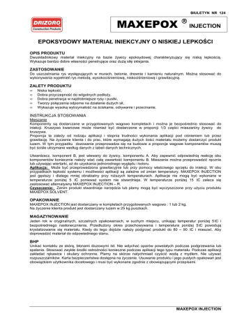 BIULETYN NR 124 MAXEPOX INJECTION EPOKSYDOWY MATERIAŁ INIEKCYJNY O NISKIEJ LEPKOŚCI OPIS PRODUKTU Dwuskładnikowy materiał iniekcyjny na bazie żywicy epoksydowej charakteryzujący się niską lepkością. Wykazuje bardzo dobre własności penetrujące oraz dużą siłę sklejania. ZASTOSOWANIE Do uszczelniania rys występujących w murach, betonie, drewnie i kamieniu naturalnym. Można stosować do wykonywania wypełnień rys metodą, wysokociśnieniową, niskociśnieniową i grawitacyjną. ZALETY PRODUKTU • • • • • Niska lepkość, Dobra przyczepność do wilgotnych podłoży, Dobra penetracja w najdrobniejsze rysy i pustki, Tworzy połączenia odporne na działanie dużych sił, Wykazuje wysoką wytrzymałość na ściskanie, odrywanie i przecinanie. INSTRUKCJA STOSOWANIA Mieszanie Komponenty są dostarczane w przygotowanych wagowo kompletach i można je bezpośrednio stosować do iniekcji. Kruszywo kwarcowe może również być dostarczone w proporcji 1/3 części mieszaniny żywicy do kruszywa. Proporcja ta zależy od rodzaju aplikacji i stopnia trudności wykonania aplikacji pod ciśnieniem lub przez grawitację. Na życzenie klienta i do prac, które wymagają dużych ilości materiału możemy dostarczyć produkt luzem. W tym przypadku dozowanie przeprowadza się na budowie a proporcje wagowe komponentów muszą być ściśle utrzymane według danych z tabeli danych technicznych. Utwardzacz, komponent B, jest wlewany do żywicy, komponentu A. Aby zapewnić odpowiednią reakcję obu komponentów koniecznie należy wlać całą zawartość komponentu B. Mieszanie można przeprowadzić ręcznie lub używając wiertarki, aż do uzyskania jednorodnego wyglądu i koloru. Aplikacja: Może być przeprowadzona grawitacyjnie lub przy pomocy właściwego sprzętu do iniekcji. W obu przypadkach lepkość systemu i możliwości aplikacji są zależne od zmian temperatury. MAXEPOX INJECTION jest gęstszy i dlatego mniej obrabialny przy niższych temperaturach. Aplikacje nie mogą być wykonane w temperaturze poniżej 5 °C ponieważ system nie stwardnieje. W temperaturze poniżej 15 °C zaleca się zastosować alternatywny MAXEPOX INJECTION – R. Czyszczenie: Zanim produkt stwardnieje narzędzia lub plamy mogą być wyczyszczone przy użyciu produktu MAXEPOX SOLVENT. OPAKOWANIE MAXEPOX INJECTION jest dostarczany w kompletach przygotowanych wagowo : 1 lub 2 kg. Na życzenie klienta produkt jest dostarczany luzem w 25 kg puszkach. MAGAZYNOWANIE Jeden rok w oryginalnych, szczelnych opakowaniach, w suchym miejscu, unikając temperatur poniżej 5°C i bezpośredniego nasłonecznienia. Przedłużony okres przechowywania i temperatura poniżej 5°C powodują krystalizowanie się materiału. Kiedy do tego dojdzie należy podgrzać produkt do 80 – 90 °C i mieszać. Aby doprowadzić materiał do odpowiedniego stanu. BHP Unikać kontaktu ze skórą, błonami śluzowymi itd. Nie wdychać oparów powstałych podczas podgrzewania lub spalania. Stosować zwykłe środki ostrożności konieczne podczas aplikacji tego typu materiału. Podczas aplikacji zakładać rękawice i okulary ochronne. Plamy na skórze natychmiast czyścić wodą z mydłem. Nie używać rozpuszczalników. Karta bezpieczeństwa dostępna na życzenie. Usuwanie produktu i jego pustych opakowań jest obowiązkiem użytkownika docelowego i musi być wykonane zgodnie z obowiązującymi przepisami. MAXEPOX INJECTION DANE TECHNICZNE Proporcje komponentów A : B (waga) Proporcja żywica : kruszywo (max) 4:1 1:3 1,1 3 Gęstość komponentu A (g/dm ) 3 Gęstość komponentu B (g/dm ) 0,9 Bez kruszywa Proporcja 1:3 Wytrzymałość na ściskanie (Kp/cm ) 2 Wytrzymałość na zginanie (Kp/cm ) 2 Moduł sprężystości (Kp/cm ) 800 300 85.000 900 350 120.000 Współczynnik rozszerzalności liniowej (cm / ° ) 2,5 x 10 Czas twardnienia przy 25 °C (godziny) Czas na uzyskanie max. Odporności (dni) Odporność na atak chemiczny Odporność na wodę 8 5–7 Doskonała Doskonała 2 -5 3,5 x 10 -5 12 5–7 Doskonała Doskonała GWARANCJA Wszystkie produkty firmy DRIZORO wytwarzane są z najlepszych, dostępnych surowców, co zapewnia ich wysoką jakość. Nasza gwarancja dotyczy jakości produktu, a nie jego zastosowania poza naszą kontrolą. Za wszelkie użycie produktów do celów nie określonych w tym biuletynie, firma nie ponosi odpowiedzialności. Wartość gwarancji nie może przewyższać wartości nabytego produktu. UWAGA Wraz z ukazaniem się tej instrukcji technicznej wszelkie wcześniejsze publikacje techniczne dotyczące produktu tracą swą ważność. Wyłączny dystrybutor na kraj DRIZORO - Poland Przeds. „carmen” Sp. z o.o. 85-738 Bydgoszcz, ul. Szajnochy 14, Tel./fax: (052) 342 02 27, 348 91 14 www.drizoro.pl e-mail: [email protected] 01/2008 MAXEPOX INJECTION MAXEPOX INJECTION