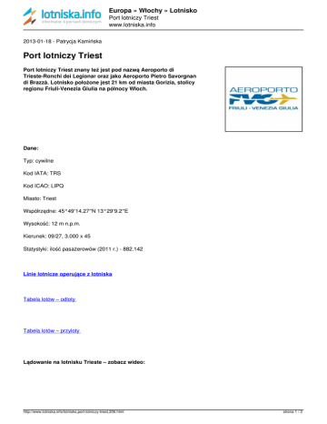 Europa » Włochy » Lotnisko Port lotniczy Triest www.lotniska.info 2013-01-18 - Patrycja Kamińska Port lotniczy Triest Port lotniczy Triest znany też jest pod nazwą Aeroporto di Trieste-Ronchi dei Legionar oraz jako Aeroporto Pietro Savorgnan di Brazzà. Lotnisko położone jest 21 km od miasta Gorizia, stolicy regionu Friuli-Venezia Giulia na północy Włoch. Dane: Typ: cywilne Kod IATA: TRS Kod ICAO: LIPQ Miasto: Triest Współrzędne: 45°49′14.27″N 13°29′9.2″E Wysokość: 12 m n.p.m. Kierunek: 09/27, 3.000 x 45 Statystyki: ilość pasażerowów (2011 r.) - 882.142 Linie lotnicze operujące z lotniska Tabela lotów – odloty Tabela lotów – przyloty Lądowanie na lotnisku Trieste – zobacz wideo: http://www.lotniska.info/lotnisko,port-lotniczy-triest,206.html strona 1 / 3 Europa » Włochy » Lotnisko Port lotniczy Triest www.lotniska.info OPIS Port lotniczy Triest , zwany też Aeroporto di Trieste-Ronchi dei Legionar, od 2007 roku nosi imię Pietro Savorgnan di Brazzà, słynnego badacza pochodzącego z regionu Friuli Venezia Giulia. Lotnisko zarządzane jest przez spółkę Aeroporto Friuli Venezia Giulia S.p.A., zaś komercyjna nazwa portu to Aeroporto del Friuli Venezia Giulia. Lotnisko położone jest 21 km od miasta Gorizia, stolicy prowincji o tej samej nazwie, leżącej w regionie Friuli-Venezia Giulia na północy Włoch. Oddalone jest o 33 km od Triestu, stolicy regionu oraz 40 km od Udine. Pomysł budowy lotniska o charakterze cywilnym w tej lokalizacji powstał w latach `50. Za oficjalną datę otwarcia portu lotniczego Triest uważa się dzień 2 grudnia 1961, kiedy wylądował tam po raz pierwszy samolot lecący z Rzymu, inaugurując otwarcie połączeń komercyjnych. DOJAZD Autobus Miejscowość TRIESTE UDINE GORIZIA MONFALCONE GRADO Linia autobusowa 51 51 1 i 26 1, 26 i 51 1 e 26 Kod taryfy E06 E07 E05 E02 E05 Cena za bilet € 3.80 € 4.50 € 3.15 € 1.50 € 3.15 Taxi Serwis taksówek działa w godzinach 08.00 - 24.00. Postój taksówek znajduje się tuż przy wyjściu z sali przylotów. Więcej informacji oraz rezerwacje pod numerami telefonu: Tel. +39-0481-778000 Fax +39-0481-776201 [email protected] www.taxiaeroportofvg.it http://www.lotniska.info/lotnisko,port-lotniczy-triest,206.html strona 2 / 3 Europa » Włochy » Lotnisko Port lotniczy Triest www.lotniska.info Wynajem samochodu Avis Tel. +39-0481-777085 www.avisautonoleggio.it Europcar Tel. +39-0481-778920 www.europcar.it Hertz Tel. +39-0481-777025 www.hertz.it Locato Tel. +39-0481-775180 800-833328 www.locauto.it Maggiore Tel. +39-0481-474569 call centre Italia 199-151 120 www.maggiore.it Sixt Tel. +39-0481-774836 www.sixt.it Strona internetowa lotniska: http://www.aeroporto.fvg.it/it/home/index.htm http://www.lotniska.info/lotnisko,port-lotniczy-triest,206.html http://www.lotniska.info/lotnisko,port-lotniczy-triest,206.html Powered by TCPDF (www.tcpdf.org) strona 3 / 3