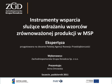 Instrumenty wsparcia służące wdrażaniu wzorców zrównoważonej produkcji w MSP Ekspertyza przygotowana na zlecenie Polskiej Agencji Rozwoju Przedsiębiorczości Wykonawca: Zachodniopomorska Grupa Doradcza Sp. z o.o. Prezentuje: Anna Dmowska Szczecin, październik 2011 Cel ekspertyzy Identyfikacja i ocena obecnego na polskim rynku wsparcia wdrażania wzorców zrównoważonej produkcji, w tym instrumentów wsparcia, usług szkoleniowych i doradczych, które są skierowane do przedsiębiorców z sektora MSP, a dotyczą problematyki wdrażania rozwiązao pro-środowiskowych oraz prowadzenia działalności zgodnie z zasadami zrównoważonej produkcji i zrównoważonego rozwoju Określenie i zaprogramowanie nowych rozwiązao, w tym instrumentów wsparcia, usług szkoleniowych i doradczych, ułatwiających wdrażanie wzorców zrównoważonej produkcji w MSP, które mogą byd świadczone na rzecz przedsiębiorców przez administrację publiczną, instytucje otoczenia biznesu, a także przez samorząd gospodarczy. Cel ekspertyzy ZAWARTOŚĆ DOKUMENTU Istniejące instrumenty wsparcia wdrażania WZP w Polsce - analiza oferty instytucjonalnej i rynkowej - finansowe instrumenty wsparcia wdrażania WZP Ocena istniejących instrumentów wsparcia wdrażania WZP w Polsce Wzorce zagraniczne w zakresie wsparcia wdrażania WZP w krajach UE oraz w krajach spoza UE Koncepcja rozwoju instrumentów wsparcia przedsiębiorstw z sektora MSP przy wdrażaniu wzorców zrównoważonej produkcji Diagnoza – kluczowe wnioski Otoczenie instytucjonalne + rosnąca liczba instytucji otoczenia biznesu oraz ich coraz większe doświadczenie we wspieraniu przedsiębiorstw + _ ogromne możliwości w przekazywaniu informacji, które kreują świadomośd przedsiębiorców i tworzą motywację do zmian _ zróżnicowana dostępnośd do tego potencjału dla przedsiębiorców - kumulacja instytucji w dużych miastach (w tym głównie ośrodkach akademickich) niedostateczna liczba inicjatyw bezpośrednio związanych z wdrażaniem WZP w MSP + _ rosnąca rola centrów transferu technologii, czemu sprzyjają zmiany w polskiej nauce nastawione na komercjalizację badao naukowych _ brak na szczeblu krajowym i samorządowym mechanizmów fiskalnych oraz administracyjnych wyraźnie motywujących MSP do wdrażania wzorców zrównoważonej produkcji wykorzystywane instrumenty wsparcia (zwykle oferta szkoleo i usług doradczych) są bardzo podobne do instrumentów rynkowych i często z nimi konkurują Diagnoza – kluczowe wnioski Niematerialne instrumenty wsparcia + _ szeroka oferta szkoleo w zakresie prawnych uwarunkowao funkcjonowania podmiotów gospodarczych korzystających z zasobów środowiska _ niewielka ilośd szkoleo związanych z zagadnieniami ochrony środowiska dofinansowanych ze środków UE (POKL) + _ _ _ niedostateczne ukierunkowanie branżowe oferty szkoleniowej, co w powiązaniu z wysokim kosztem specjalistycznych szkoleo wpływa na małe zainteresowanie dobrze rozwinięte usługi doradcze obejmujące zastępcze wykonanie obowiązków formalnoprawnych przedsiębiorcy i doradztwo w procesie inwestycyjnym stosunkowo mała liczba oferentów usług doradczych koncentrujących się na doradztwie technologicznym, sprzyjającym wdrażaniu ekotechnologii wysokie koszty usług doradczych rozproszona oferta usług doradczych – brak firm doradczych oferujących kompleksową usługę w zakresie doradztwa środowiskowego Diagnoza – kluczowe wnioski Finansowe instrumenty wsparcia _ brak wypracowanego spójnego mechanizmu pomocowego skierowanego bezpośrednio na rzecz wdrażania WZP w sektorze MSP _ obecnośd tylko w niektórych Regionalnych Programach Operacyjnych działao skierowanych bezpośrednio na inwestycje związane z ochroną środowiska w MSP _ brak w Programach Operacyjnych mechanizmów wyraźnie motywujących MSP do inwestowania w technologie przyjazne środowisku – mała liczba punktów w działaniach skierowanych na inwestycje w MSP za realizację inwestycji w pozytywny sposób oddziaływujących na środowisko _ ograniczenia dla MSP w dostępie do środków pomocowych w Programach Operacyjnych na szczeblu krajowym (POIŚ) – zbyt wysoka minimalna wartośd inwestycji jako kryterium dostępu + _ obecnośd we wszystkich programach operacyjnych zarówno na szczeblu regionalnym jak i krajowym działao dedykowanych wsparciu usług doradczych w MSP relatywnie wysoki stopieo skomplikowania dokumentacji aplikacyjnej z kwotą możliwego do uzyskania dofinansowania usług doradczych w MSP Koncepcja rozwoju instrumentów wsparcia Kryzys finansów publicznych w krajach Unii Europejskiej wymusza wydatkowanie środków publicznych w sposób bardziej efektywny niż dotychczas, a w konsekwencji skupienie inwestycji na ograniczonej liczbie obszarów priorytetowych, które przyniosą większą wartośd dodaną dla gospodarki. Debata nad nowym modelem wydatkowania środków rozpoczęła się wraz z przygotowywaniem Wieloletnich Ram Finansowych Unii Europejskiej. Nowa polityka zakłada odejście od rozproszonych działao podejmowanych przez władze publiczne na rzecz inwestycji skoncentrowanych na kluczowych obszarach, ze zwróceniem szczególnej uwagi na osiągane efekty. Jednym z obszarów priorytetowych, zgodnie z zatwierdzonym w czerwcu 2020 r. dokumentem „Europa 2020” jest „rozwój zrównoważony” Koncepcja rozwoju instrumentów wsparcia Debata nad przyszłym kształtem polityki spójności odzwierciedla przełom w myśleniu o niej jako o mechanizmie wyrównawczym, redystrybucyjnym czy kompensacyjnym i przebiega w kierunku reformy polityki spójności. Zmiany te odzwierciedlają światowe trendy w polityce regionalnej, która dąży w kierunku koncentracji na szansach (potencjale) a nie barierach rozwoju, odejściu od modelu krótkoterminowych, odgórnie dystrybuowanych dotacji dla najsłabiej rozwijających się obszarów do modelu wieloletnich, zdecentralizowanych polityk rozwojowych ukierunkowanych na wspieranie wszystk
