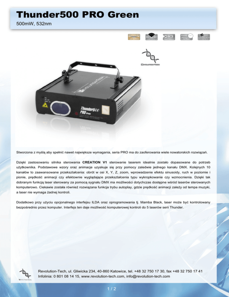 Thunder500 PRO Green 500mW, 532nm Stworzona z myślą aby spełnić nawet największe wymagania, seria PRO ma do zaoferowania wiele nowatorskich rozwiązań. Dzięki zastosowaniu silnika sterowania CREATION V1 sterowanie laserem idealnie zostało dopasowane do potrzeb użytkownika. Podstawowe wzory oraz animacje uzyskuje się przy pomocy zaledwie jednego kanału DMX. Kolejnych 10 kanałów to zaawansowane przekształcenia: obrót w osi X, Y, Z, zoom, wprowadzenie efektu sinusoidy, ruch w poziomie i pionie, prędkość animacji czy efektownie wyglądające przekształcenia typu wykropkowanie czy wzmocnienia. Dzięki tak dobranym funkcją laser sterowany za pomocą sygnału DMX ma możliwości dotychczas dostępne wśród laserów sterowanych komputerowo. Ciekawie została również rozwiązana funkcja trybu autoplay, gdzie prędkość animacji zależy od tempa muzyki, a laser nie wymaga żadnej kontroli. Dodatkowo przy użyciu opcjonalnego interfejsu ILDA oraz oprogramowania tj. Mamba Black, laser może być kontrolowany bezpośrednio przez komputer. Interfejs ten daje możliwość komputerowej kontroli do 5 laserów serii Thunder. Revolution-Tech, ul. Gliwicka 234, 40-860 Katowice, tel. +48 32 750 17 30, fax +48 32 750 17 41 Infolinia: 0 801 08 14 15, www.revolution-tech.com, [email protected] 1/2 Specyfikacje Napięcie 230 V Prąd AC Pobór mocy 100 W Moc diody zielonej 500 mW Średni czas życia diody 5 000 godz. Tryby pracy DMX / dźwięk / auto / komputer Port ILDA tak Liczba kanałów DMX 12 Liczba wzorów/animacji 60/195 Mechanika skanery 20kpps Kąt projekcji 60 ° Chłodzenie TEC Obudowa metal Wymiary 37,0 / 14,0 / 36,0 cm Waga 6,5 kg Gwarancja 12 m-cy Produkty współpracujące Daslight Virtual Controller 2 ECO 512 Light Magic Revolution-Tech, ul. Gliwicka 234, 40-860 Katowice, tel. +48 32 750 17 30, fax +48 32 750 17 41 Infolinia: 0 801 08 14 15, www.revolution-tech.com, [email protected] 2/2