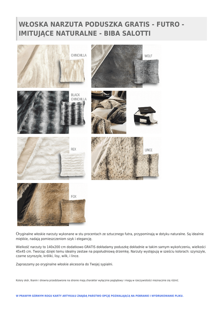WŁOSKA NARZUTA PODUSZKA GRATIS - FUTRO IMITUJĄCE NATURALNE - BIBA SALOTTI Oryginalne włoskie narzuty wykonane w stu procentach ze sztucznego futra, przypominają w dotyku naturalne. Są idealnie miękkie, nadają pomieszczeniom szyk i elegancję. Wielkość narzuty to 140x200 cm dodatkowo GRATIS dokładamy poduszkę dokładnie w takim samym wykończeniu, wielkości 45x45 cm. Tworząc dzięki temu idealny zestaw na popołudniową drzemkę. Narzuty występują w sześciu kolorach: szynszyle, czarne szynszyle, króliki, lisy, wilk, i lince. Zapraszamy po oryginalne włoskie akcesoria do Twojej sypialni. Kolory skór, tkanin i drewna przedstawione na stronie mają charakter wyłącznie poglądowy i mogą w rzeczywistości nieznacznie się różnić. W PRAWYM GÓRNYM ROGU KARTY ARTYKUŁU ZNAJDĄ PAŃSTWO OPCJĘ POZWALAJĄCĄ NA POBRANIE I WYDRUKOWANIE PLIKU. 1378.00 zł Waga: 5kg Czas realizacji: towar na zamówienie Wybierz opcje Rozmiar 140x200 0.00 zł Kolor SZYNSZYLE 0.00 zł CZARNE SZYNSZYLE +1 043.00 zł LISY +236.00 zł KRÓLIK 0.00 zł WILK +1 043.00 zł RYŚ +1 043.00 zł © Copyrights 2014 Wloskiesypialnie.pl | Wszelkie prawa zastrzeżone