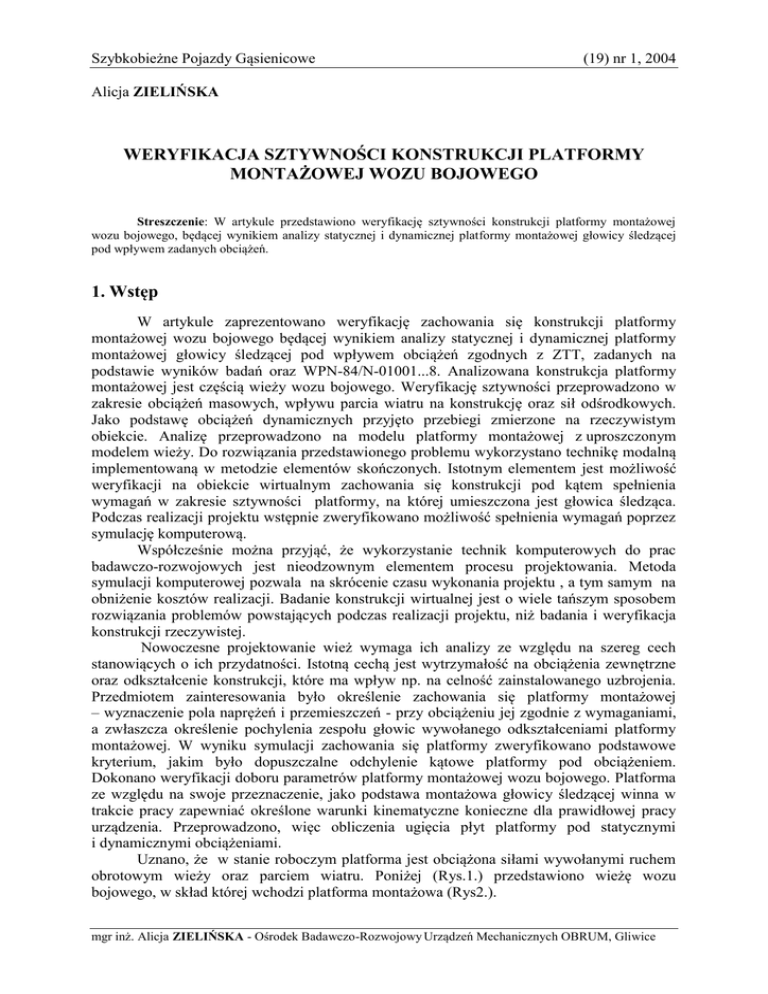 Szybkobieżne Pojazdy Gąsienicowe (19) nr 1, 2004 Alicja ZIELIŃSKA WERYFIKACJA SZTYWNOŚCI KONSTRUKCJI PLATFORMY MONTAŻOWEJ WOZU BOJOWEGO Streszczenie: W artykule przedstawiono weryfikację sztywności konstrukcji platformy montażowej wozu bojowego, będącej wynikiem analizy statycznej i dynamicznej platformy montażowej głowicy śledzącej pod wpływem zadanych obciążeń. 1. Wstęp W artykule zaprezentowano weryfikację zachowania się konstrukcji platformy montażowej wozu bojowego będącej wynikiem analizy statycznej i dynamicznej platformy montażowej głowicy śledzącej pod wpływem obciążeń zgodnych z ZTT, zadanych na podstawie wyników badań oraz WPN-84/N-01001...8. Analizowana konstrukcja platformy montażowej jest częścią wieży wozu bojowego. Weryfikację sztywności przeprowadzono w zakresie obciążeń masowych, wpływu parcia wiatru na konstrukcję oraz sił odśrodkowych. Jako podstawę obciążeń dynamicznych przyjęto przebiegi zmierzone na rzeczywistym obiekcie. Analizę przeprowadzono na modelu platformy montażowej z uproszczonym modelem wieży. Do rozwiązania przedstawionego problemu wykorzystano technikę modalną implementowaną w metodzie elementów skończonych. Istotnym elementem jest możliwość weryfikacji na obiekcie wirtualnym zachowania się konstrukcji pod kątem spełnienia wymagań w zakresie sztywności platformy, na której umieszczona jest głowica śledząca. Podczas realizacji projektu wstępnie zweryfikowano możliwość spełnienia wymagań poprzez symulację komputerową. Współcześnie można przyjąć, że wykorzystanie technik komputerowych do prac badawczo-rozwojowych jest nieodzownym elementem procesu projektowania. Metoda symulacji komputerowej pozwala na skrócenie czasu wykonania projektu , a tym samym na obniżenie kosztów realizacji. Badanie konstrukcji wirtualnej jest o wiele tańszym sposobem rozwiązania problemów powstających podczas realizacji projektu, niż badania i weryfikacja konstrukcji rzeczywistej. Nowoczesne projektowanie wież wymaga ich analizy ze względu na szereg cech stanowiących o ich przydatności. Istotną cechą jest wytrzymałość na obciążenia zewnętrzne oraz odkształcenie konstrukcji, które ma wpływ np. na celność zainstalowanego uzbrojenia. Przedmiotem zainteresowania było określenie zachowania się platformy montażowej – wyznaczenie pola naprężeń i przemieszczeń - przy obciążeniu jej zgodnie z wymaganiami, a zwłaszcza określenie pochylenia zespołu głowic wywołanego odkształceniami platformy montażowej. W wyniku symulacji zachowania się platformy zweryfikowano podstawowe kryterium, jakim było dopuszczalne odchylenie kątowe platformy pod obciążeniem. Dokonano weryfikacji doboru parametrów platformy montażowej wozu bojowego. Platforma ze względu na swoje przeznaczenie, jako podstawa montażowa głowicy śledzącej winna w trakcie pracy zapewniać określone warunki kinematyczne konieczne dla prawidłowej pracy urządzenia. Przeprowadzono, więc obliczenia ugięcia płyt platformy pod statycznymi i dynamicznymi obciążeniami. Uznano, że w stanie roboczym platforma jest obciążona siłami wywołanymi ruchem obrotowym wieży oraz parciem wiatru. Poniżej (Rys.1.) przedstawiono wieżę wozu bojowego, w skład której wchodzi platforma montażowa (Rys2.). mgr inż. Alicja ZIELIŃSKA - Ośrodek Badawczo-Rozwojowy Urządzeń Mechanicznych OBRUM, Gliwice Alicja ZIELIŃSKA Rys.1. Model bryłowy wieży Rys. 2. Model bryłowy platformy montażowej 2. MODEL OBLICZENIOWY Ograniczenia gabarytowo-masowe stawiają wymagania wobec konstrukcji, gdyż w istotny sposób utrudniają możliwość zwiększania jej sztywności. Biorąc ten czynnik pod uwagę, wykonano obliczenia wytrzymałościowe konstrukcji platformy wraz z wieżą, której model ograniczono do minimum, uwzględniając jednak zapewnienie prawidłowego mocowania platformy. Postępowanie takie było uzasadnione ze względu na dużą sztywność korpusu wieży, powodując jej niewielki wpływ na platformę montażową. Natomiast zdecydowanie wpłynęło to na ograniczenie wielkości modelu. Jako metodę analizy wybrano metodę elementów skończonych[3], wykorzystując oprogramowanie COSMOS/M [1]. Na potrzeby symulacji stworzono model platformy oparty na elementach powłokowych trójkątnych. Model platformy wraz z fragmentem wieży powstał w oparciu o szkic koncepcyjny tego układu o parametrach geometrycznych zgodnych z wcześniejszymi analizami. Wykonano belkowo-powłokowy model platformy wraz z wieżą. Na tej podstawie powstał Weryfikacja sztywności konstrukcji platformy montażowej wozu bojowego model składający się z 7755 elementów rozpiętych na 3950 węzłach o 23394 stopniach swobody. Elementy podzielono na grupy elementów (Rys.3.) o określonych własnościach geometrycznych przekroju. Podział na elementy i grupy elementów obrazuje Rys.4. Rys.3 Podział na grupy elementów modelu Rys. 4. Podział na elementy skończone Ponadto w modelu występują elementy masowe (Rys.5.). Przyjęte warunki brzegowe obrazuje Rys.6. - odebrano możliwości przemieszczeń na odciętym brzegu modelu wieży. Rys. 5 Model połączenia głowicy z platformą Rys. 6. Warunki brzegowe. Tablica 1. Zestawienie typów elementów modelu Nr typu 1 2 3 Nazwa SHELLl 3 RBAR MASS Typy elementów modelu elementy powłokowe sztywne elementy belkowe elementy masowe Dla prawidłowego zamodelowania obciążenia od oddziaływań dynamicznych, przy ograniczonym modelu wieży wybrano schemat tzw. ruchu podstawą (ang. base motion). W Alicja ZIELIŃSKA układzie obciążenia dynamiczne na korpus wieży przenoszą się w postaci wymuszeń kinematycznych. Jako dane bazowe wymuszenia przyjęto dane wyjściowe z analizy dynamicznej problemu drgań wieży wozu bojowego. Łożysko wieńcowe głowicy śledzącej zamodelowano za pośrednictwem równań wymuszających jednakowe przemieszczenia w miejscach połączenia łożyskowego tj. na o