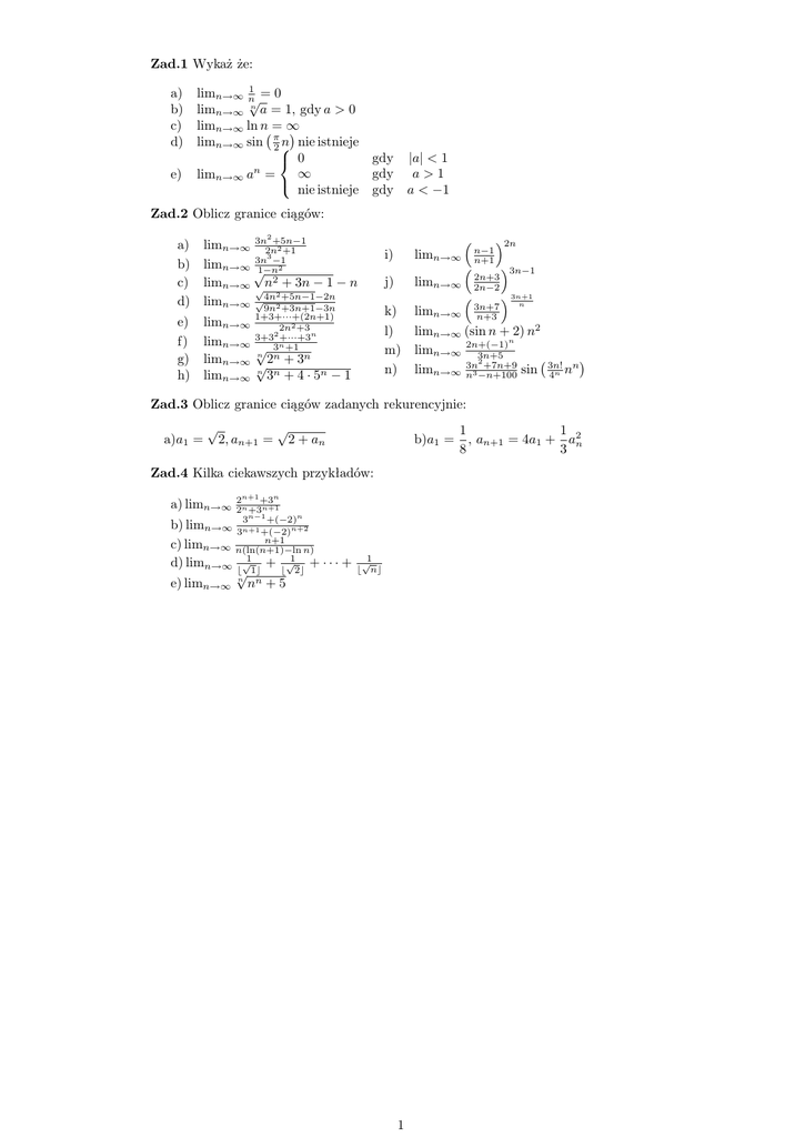 Zad.1 Wykaż że: 1 a) limn→∞ n√ =0 b) limn→∞ n a = 1, gdy a > 0 c) limn→∞ ln n = ∞ n nie istnieje d) limn→∞ sin π2 gdy 0 ∞ gdy e) limn→∞ an = nie istnieje gdy |a| < 1 a>1 a < −1 Zad.2 Oblicz granice ciągów: 2 a) limn→∞ 3n2n+5n−1 2 +1 3 −1 b) limn→∞ 3n 1−n2 √ c) limn→∞ √ n2 + 3n − 1 − n 2 +5n−1−2n d) limn→∞ √4n 9n2 +3n+1−3n e) limn→∞ 1+3+···+(2n+1) 2n2 +3 3+32 +···+3n f) limn→∞ 3n +1 √ n g) limn→∞ √ 2n + 3 n h) limn→∞ n 3n + 4 · 5n − 1 2n i) limn→∞ n−1 n+1 j) limn→∞ 2n+3 2n−2 k) l) m) n) 3n+1 n limn→∞ 3n+7 n+3 limn→∞ (sin n + 2) n2 n limn→∞ 2n+(−1) 3n+5 2 +7n+9 limn→∞ n3n3 −n+100 sin 3n−1 3n! n 4n n Zad.3 Oblicz granice ciągów zadanych rekurencyjnie: a)a1 = √ 2, an+1 = √ 2 + an b)a1 = Zad.4 Kilka ciekawszych przykładów: 2n+1 +3n 2n +3n+1 3n−1 +(−2)n b) limn→∞ 3n+1 +(−2)n+2 n+1 c) limn→∞ n(ln(n+1)−ln n) d) limn→∞ b√11c + b√12c + √ e) limn→∞ n nn + 5 a) limn→∞ ··· + √1 b nc 1 1 1 , an+1 = 4a1 + a2n 8 3