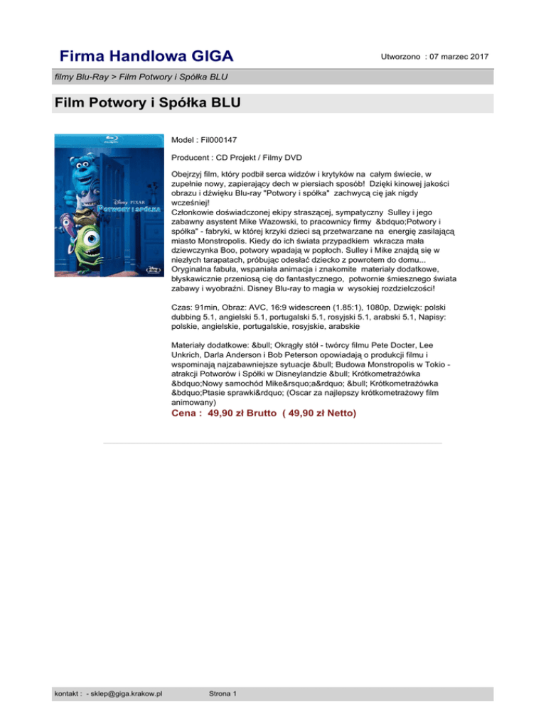 Firma Handlowa GIGA Utworzono : 07 marzec 2017 filmy Blu-Ray > Film Potwory i Spółka BLU Film Potwory i Spółka BLU Model : Fil000147 Producent : CD Projekt / Filmy DVD Obejrzyj film, który podbił serca widzów i krytyków na całym świecie, w zupełnie nowy, zapierający dech w piersiach sposób! Dzięki kinowej jakości obrazu i dźwięku Blu-ray "Potwory i spółka" zachwycą cię jak nigdy wcześniej! Członkowie doświadczonej ekipy straszącej, sympatyczny Sulley i jego zabawny asystent Mike Wazowski, to pracownicy firmy „Potwory i spółka" - fabryki, w której krzyki dzieci są przetwarzane na energię zasilającą miasto Monstropolis. Kiedy do ich świata przypadkiem wkracza mała dziewczynka Boo, potwory wpadają w popłoch. Sulley i Mike znajdą się w niezłych tarapatach, próbując odesłać dziecko z powrotem do domu... Oryginalna fabuła, wspaniała animacja i znakomite materiały dodatkowe, błyskawicznie przeniosą cię do fantastycznego, potwornie śmiesznego świata zabawy i wyobraźni. Disney Blu-ray to magia w wysokiej rozdzielczości! Czas: 91min, Obraz: AVC, 16:9 widescreen (1.85:1), 1080p, Dzwięk: polski dubbing 5.1, angielski 5.1, portugalski 5.1, rosyjski 5.1, arabski 5.1, Napisy: polskie, angielskie, portugalskie, rosyjskie, arabskie Materiały dodatkowe: • Okrągły stół - twórcy filmu Pete Docter, Lee Unkrich, Darla Anderson i Bob Peterson opowiadają o produkcji filmu i wspominają najzabawniejsze sytuacje • Budowa Monstropolis w Tokio atrakcji Potworów i Spółki w Disneylandzie • Krótkometrażówka „Nowy samochód Mike’a” • Krótkometrażówka „Ptasie sprawki” (Oscar za najlepszy krótkometrażowy film animowany) Cena : 49,90 zł Brutto ( 49,90 zł Netto) kontakt : - [email protected] Strona 1
