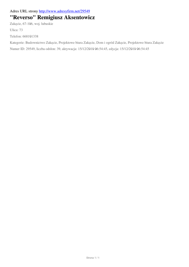 Adres URL strony http://www.adresyfirm.net/29549 "Reverso" Remigiusz Aksentowicz Zakęcie, 67-106, woj. lubuskie Ulica: 73 Telefon: 668101338 Kategorie: Budownictwo Zakęcie, Projektowe biura Zakęcie, Dom i ogród Zakęcie, Projektowe biura Zakęcie Numer ID: 29549, liczba odsłon: 39, aktywacja: 15/12/2010 06:54:45, edycja: 15/12/2010 06:54:45 Strona 1 / 1
