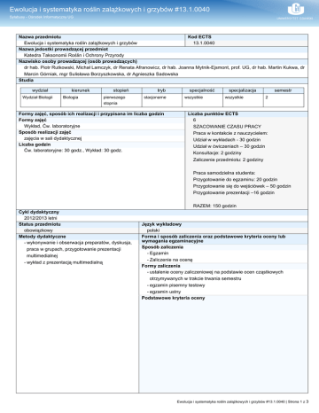 Ewolucja i systematyka roślin zalążkowych i grzybów #13.1.0040 Sylabusy - Ośrodek Informatyczny UG Nazwa przedmiotu Kod ECTS Ewolucja i systematyka roślin zalążkowych i grzybów 13.1.0040 Nazwa jedostki prowadzącej przedmiot Katedra Taksonomii Roślin i Ochrony Przyrody Nazwisko osoby prowadzącej (osób prowadzących) dr hab. Piotr Rutkowski, Michał Lamczyk, dr Renata Afranowicz, dr hab. Joanna Mytnik-Ejsmont, prof. UG, dr hab. Martin Kukwa, dr Marcin Górniak, mgr Sulisława Borzyszkowska, dr Agnieszka Sadowska Studia wydział Wydział Biologii kierunek Biologia stopień pierwszego stopnia tryb stacjonarne Formy zajęć, sposób ich realizacji i przypisana im liczba godzin Formy zajęć Wykład, Ćw. laboratoryjne Sposób realizacji zajęć zajęcia w sali dydaktycznej Liczba godzin Ćw. laboratoryjne: 30 godz., Wykład: 30 godz. specjalność wszystkie specjalizacja wszystkie semestr 2 Liczba punktów ECTS 6 SZACOWANIE CZASU PRACY Praca w kontakcie z nauczycielem: Udział w wykładach - 30 godzin Udział w ćwiczeniach – 30 godzin Konsultacje: 2 godziny Zaliczenie przedmiotu: 2 godziny Praca samodzielna studenta: Przygotowanie do egzaminu: 20 godzin Przygotowanie się do wejściówek – 50 godzin Przygotowanie prezentacji –16 godzin RAZEM: 150 godzin Cykl dydaktyczny 2012/2013 letni Status przedmiotu obowiązkowy Metody dydaktyczne - wykonywanie i obserwacja preparatów, dyskusja, praca w grupach, przygotowanie prezentacji multimedialnej - wykład z prezentacją multimedialną Język wykładowy polski Forma i sposób zaliczenia oraz podstawowe kryteria oceny lub wymagania egzaminacyjne Sposób zaliczenia - Egzamin - Zaliczenie na ocenę Formy zaliczenia - ustalenie oceny zaliczeniowej na podstawie ocen cząstkowych otrzymywanych w trakcie trwania semestru - egzamin pisemny testowy - egzamin ustny Podstawowe kryteria oceny Ewolucja i systematyka roślin zalążkowych i grzybów #13.1.0040 | Strona 1 z 3 Ewolucja i systematyka roślin zalążkowych i grzybów #13.1.0040 Sylabusy - Ośrodek Informatyczny UG • egzamin obejmuje materiał z wykładu • egzamin pisemny oceniany jest wg wskaźnika procentowego („Regulamin Studiów UG”) • egzamin ustny - ocena obejmuje stopień wyczerpania tematu dotyczącego każdego z 3 losowanych pytań • wejściówki: obejmują stopień opanowania materiału obowiązującego na danych ćwiczeniach w formie pisemnej; • ustna prezentacja multimedialna - obejmuje zakres wyczerpania tematu, poprawność merytoryczna, atrakcyjność prezentacji • ocena zaliczeniowa z ćwiczeń: za wejściówki i prezentację przyznawane są punkty; suma zdobytych punktów przeliczana jest na ocenę końcową wg wskaźnika procentowego („Regulamin Studiów UG”) warumkiem zaliczenia każego ćwiczenia jest poprawne wykonanie zadań składających się na ćwiczenie zgodnie z poleceniami prowadzącego • w przypadku braku wystarczającej liczby punktów na zaliczenie z ćwiczeń student zobowiązany jest napisać kolokwium (test) Określenie przedmiotów wprowadzających wraz z wymogami wstępnymi A. Wymagania formalne brak B. Wymagania wstępne brak Cele kształcenia 1. Wprowadzenie podstawowych i najważniejszych zagadnień ewolucji i systematyki roślin i grzybów. 2. Poznanie i zrozumienie metod badawczych stosowanych w systematyce. 3. Przegląd wybranych przedstawicieli poszczególnych grup systematycznych roślin i grzybów. 4. Zrozumienie podstaw funkcjonowania żywych organizmów oraz ich wzajemnych relacji. Treści programowe A. Problematyka wykładu Historia systematyki. Metody badawcze i analityczne w taksonomii organizmów żywych (fenetyka, kladystyka, taksonomia klasyczna, molekularna, chemotaksonomia). Podstawowe kategorie systematyczne. Gatunek i specjacja. Powstawanie wyższych jednostek systematycznych. Podstawowe pojęcia z zakresu morfologii roślin zalążkowych. Przegląd wybranych grup systematycznych roślin nagozalążkowych i okrytozalążkowych. Filogeneza roślin. Znaczenie zapylania w ewolucji roślin wyższych. Systematyka grzybów. Współczesne poglądy na ewolucję grzybów. B. Problematyka ćwiczeń Poznanie technik i metod badawczych stosowanych w systematyce roślin, w tym molekularnych. Przegląd wybranych przedstawicieli poszczególnych grup systematycznych roślin i grzybów (charakterystyka i pozycja systematyczna). Wykorzystanie praktyczne roślin w kosmetyce. Wykaz literatury A. Literatura wymagana do ostatecznego zaliczenia zajęć (zdania egzaminu): A.1. wykorzystywana podczas zajęć Szweykowska A., Szweykowski J. 2009. Botanika. Tom 1 i 2. PWN, Warszawa. A.2. studiowana samodzielnie przez studenta Müller E., Loeffler W. 1987. Zarys Mykologii. PWRiL, Warszawa. Szweykowska A., Szweykowski J. 2009. Botanika. Tom 1 i 2. PWN, Warszawa. B. Literatura uzupełniająca Alexopoulos C.J., Mims C., Blackwell M. 1996. Introductory Mycology. Wiley& Sons. New York. Angiosperm Phylogeny Website http://www.mobot.org/MOBOT/Research/APWeb/welcome.html Friis E.M., Pedersen K.R., Crane P.R. 2010. Diversity in obscurity-fossil flowers and early history of Angiosperms. Phil.Trans.R.Soc.B 365: 396-382. Soltis D.E., Soltis P.S. 2004. The origin and Ddiversification of Angiosperms. Am.J.Bot. 91: 1614-1625. Spalik K, Piwczyński M. 2006. Rekonstrukcja filogenezy i wnioskowanie filogenetyczne w badaniach ewolucyjnych. Kosmos 58(3-4): 485-498. Efekty uczenia się Przedmiot realizuje: Efekty z obszaru nauk przyrodniczych: PlA_W01, PlA_W04, PlA_W05, P1A_U01, P1A_U02, P1A_ U03, P1A_U10, P1A_U11, P1A_K02, P1A_K06 Efekty dla kierunku Biologia UG: B_W06, B_W10, B_U01, B_U06, B_U07, B_U08, B_U10, B_K03, B_K06 Wiedza - przedstawia charakterystykę, systematykę i ewolucję wybranych grup organizmów roślin zalążkowych i grzybów z uwzględnieniem podstaw molekularnych (B_W06) - orientuje się w obecnym stanie wiedzy i rozwoju metod badawczych stosowanych w badaniach nad ewolucją i systematyką roślin zalążkowych i grzybów (B_W10