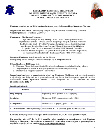 REGULAMIN KONKURSU BIBLIJNEGO IM. SŁUGI BOŻEGO KARD. AUGUSTA HLONDA DLA UCZNIÓW SZKÓŁ PODSTAWOWYCH W ROKU SZKOLNYM 2012/2013 Konkurs znajduje się na liście konkursów tematycznych Pomorskiego Kuratora Oświaty. Organizator Konkursu - Diecezjalny Instytut Akcji Katolickiej Archidiecezji Gdańskiej Współorganizator – Fundacja „SŁOWO” Konkursowi Biblijnemu Patronują: Jego Ekscelencja ks. abp Sławoj Leszek Głódź - Metropolita Gdański mgr Halina Szydełko – Prezes Zarządu Krajowego Akcji Katolickiej w Polsce ks. Bartłomiej Stark - Dyrektor Wydziału Katechetycznego Kurii Gdańskiej mgr Renata Ropela - Dyrektor Centrum Edukacji Nauczycieli w Gdańsku ks. prałat Piotr Toczek - Asystent Kościelny DIAK Diecezji Gdańskiej ks. kanonik Andrzej Szopiński - Asystent Kościelny DIAK Diecezji Pelplińskiej ks. Kazimierz Chudzicki SDB - Proboszcz Parafii NMP WW w Rumi Tematem Konkursu jest: Ewangelia wg św. Marka Szczegółowy zakres tematyki konkursu znajduje się w Załączniku nr 5 Celem Konkursu Biblijnego jest: 1. Ukazanie Pisma Świętego jako źródła wiary i zachęta do jego indywidualnej lektury. 2. Wspomaganie uczniów w praktycznym wykorzystaniu zdobytej wiedzy. 3. Promowanie osiągnięć uczniów i katechetów. Warunkiem koniecznym przystąpienia szkoły do Konkursu Biblijnego jest: przesłanie zgodnie z rejonizacją zob. Załącznik nr 1, pocztą elektroniczną, faxem lub listem poleconym lub osobiste dostarczenie Karty zgłoszenia szkoły - zob. Załącznik nr 2 w terminie do dnia 26 października 2012 r. Przebieg eliminacji: Stopień Eliminacje Etap wstępny Najpóźniej do 14 grudnia 2012 r. (piątek) I - szkolny 24 stycznia 2013 r. (czwartek), godz. 13.00 II - rejonowy 1 marca 2013 r. (piątek), godz. 13.30 III - wojewódzko - metropolitalny 13 kwietnia 2013 r. (sobota), godz. 10.00 - RUMIA Konkurs Biblijny przeznaczony jest dla uczniów klas IV, V, VI szkół podstawowych. Dla uczniów klas „0”, I, II, III i uczniów szkół specjalnych organizowany jest Konkurs Biblijny – Plastyczny. Szczegółowe informacje i regulaminy obowiązujące w poszczególnych rejonach znajdują się na stronie www.ak.rumia.pomorskie.pl 1 Konkurs Biblijny przebiega czterostopniowo: (etap wstępny, stopień I, II, III) Etap wstępny: Katecheci przygotowują pytania i przeprowadzają w formie pisemnej etap klasowy z którego wyłaniają uczestników etapu szkolnego. Stopień I 1. Eliminacje przeprowadza na terenie szkoły Szkolna Komisja Konkursowa (SKK) powołana przez dyrektora. Przewodniczący SKK odpowiada za stronę merytoryczną zgodną z wymaganiami regulaminowymi. 2. Przygotowane przez WKK arkusze zadań uczniowie rozwiązują w czasie 45 minut. 3. Z odbytych eliminacji I stopnia SKK sporządza protokół zob. Załącznik nr 3 potwierdzony przez dyrektora szkoły - uwzględniający wszystkich uczestników. Przesyła go wraz z pracami konkursowymi uczniów, którzy zakwalifikowali się do II stopnia (rejonowego) na adres odpowiedniej Rejonowej Komisji Konkursowej – zob. Załącznik nr 1, w terminie do 7 lutego 2013 roku. 4. Spośród uczestników I stopnia (szkolnego) Konkursu Biblijnego SKK typuje najlepszych uczniów do II stopnia (rejonowego), według dwóch kryteriów łącznie. I. Kryterium Liczba uczniów awansujących do II stopnia Liczba uczniów w szkole do 100 uczniów 1 do 300 uczniów 2 od 301 uczniów do 400 uczniów 3 od 401 uczniów do 600 uczniów 4 powyżej 600 uczniów 5 II. Kryterium Dyrektor szkoły dokonuje również zgłoszenia do II stopnia (rejonowego) tych uczniów, którzy otrzymali minimum 80% punktów możliwych do uzyskania. Stopień II - rejonowy 1. Eliminacje przeprowadza Rejonowa Komisja Konkursowa (RKK) powołana przewodniczącego RKK. przez 2. Uczestnicy rejonowych eliminacji rozwiązują arkusz zadań przygotowany przez przewodniczącego WKK w czasie 60 minut. 3. Z odbytych eliminacji II stopnia RKK sporządza protokół zob. Załącznik nr 4 uwzględniający 20 uczestników i przesyła go najpóźniej do 15 marca 2013 roku w wersji elektronicznej i drukowanej przesyłką poleconą wraz ze sprawdzonymi pracami uczestników lub dostarcza je osobiście na adres Wojewódzkiej Komisji Konkursowej: Akcja Katolicka OP Parafia Najświętszej Maryi Panny Wspomożenia Wiernych Konkurs Biblijny im. Sługi Bożego kard. Augusta Hlonda ul. Dąbrowskiego 26, 84-230 Rumia Fax (58) 771-31-13, e-mail: [email protected], Tel. 601-638-283 ; 696-333-089 2 4. Do udziału w eliminacjach III stopnia konkursu WKK zaprasza pięciu najlepszych uczniów z każdego regionu a pozostałych do liczby 90 typuje na podstawie liczby punktów uzyskanych przez uczniów z wszystkich rejonów na drugim stopniu konkursu. Stopień III – wojewódzko - metropolitalny 1. Eliminacje uczestników III stopnia przeprowadza Wojewódzka Komisja Konkursowa (WKK) powołana przez przewodniczącego WKK. 2. Uczestnicy wojewódzkich eliminacji rozwiązują w czasie 60 minut zadania z arkusza przygotowane przez przewodniczącego WKK. 3. Spośród uczestników eliminacji III stopnia WKK wyłania laureatów. 4. Z odbytych eliminacji III stopnia WKK sporządza protokół ustalając listę 5 laureatów. 5. Ogłoszenie list laureatów następuje bezpośrednio po przeprowadzonym finale konkursu. Publikowanie zadań konkursowych oraz odpowiedzi z kryteriami punktowania. Treści zadań konkursowych stopnia II i III wraz z kluczem odpowiedzi będą publikowane w formie plików z rozszerzeniem *.doc lub *.pdf (do pobrania) na stronie internetowej www.ak.rumia.pomorskie.pl - zakładka: Konkurs Biblijny. Nagrody Najlepsi uczniowie eliminacji II stopnia (rejonowego) otrzymują dyplomy i nagrody. 5 najlepszych uczniów szkół podstawowych z rejonów położonych na terenie województwa pomorskiego otrzymuje dodatkowo wpis do świadectwa. Laureaci eliminacji III stopnia (wojewódzko – metropolitalnego) otrzymują dyplomy oraz nagrody rzeczowe. Pięciu laureatów ze szkół podstawowych położo