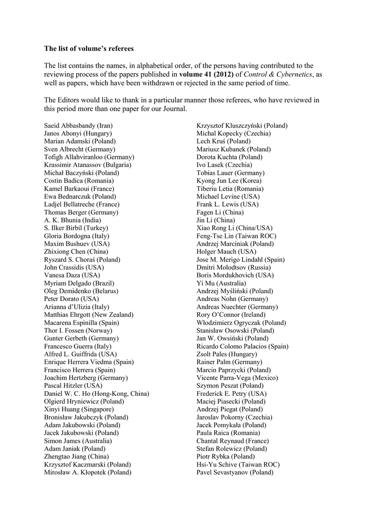 The list of volume’s referees The list contains the names, in alphabetical order, of the persons having contributed to the reviewing process of the papers published in volume 41 (2012) of Control & Cybernetics, as well as papers, which have been withdrawn or rejected in the same period of time. The Editors would like to thank in a particular manner those referees, who have reviewed in this period more than one paper for our Journal. Saeid Abbasbandy (Iran) Janos Abonyi (Hungary) Marian Adamski (Poland) Sven Albrecht (Germany) Tofigh Allahviranloo (Germany) Krassimir Atanassov (Bulgaria) Michał Baczyński (Poland) Costin Badica (Romania) Kamel Barkaoui (France) Ewa Bednarczuk (Poland) Ladjel Bellatreche (France) Thomas Berger (Germany) A. K. Bhunia (India) S. Ilker Birbil (Turkey) Gloria Bordogna (Italy) Maxim Bushuev (USA) Zhixiong Chen (China) Ryszard S. Choraś (Poland) John Crassidis (USA) Vanesa Daza (USA) Myriam Delgado (Brazil) Oleg Demidenko (Belarus) Peter Dorato (USA) Arianna d’Ulizia (Italy) Matthias Ehrgott (New Zealand) Macarena Espinilla (Spain) Thor I. Fossen (Norway) Gunter Gerbeth (Germany) Francesco Guerra (Italy) Alfred L. Guiffrida (USA) Enrique Herrera Viedma (Spain) Francisco Herrera (Spain) Joachim Hertzberg (Germany) Pascal Hitzler (USA) Daniel W. C. Ho (Hong-Kong, China) Olgierd Hryniewicz (Poland) Xinyi Huang (Singapore) Bronisław Jakubczyk (Poland) Adam Jakubowski (Poland) Jacek Jakubowski (Poland) Simon James (Australia) Adam Janiak (Poland) Zhengtao Jiang (China) Krzysztof Kaczmarski (Poland) Mirosław A. Kłopotek (Poland) Krzysztof Kluszczyński (Poland) Michal Kopecky (Czechia) Lech Kruś (Poland) Mariusz Kubanek (Poland) Dorota Kuchta (Poland) Ivo Lasek (Czechia) Tobias Lauer (Germany) Kyong Jun Lee (Korea) Tiberiu Letia (Romania) Michael Levine (USA) Frank L. Lewis (USA) Fagen Li (China) Jin Li (China) Xiao Rong Li (China/USA) Feng-Tse Lin (Taiwan ROC) Andrzej Marciniak (Poland) Holger Mauch (USA) Jose M. Merigo Lindahl (Spain) Dmitri Molodtsov (Russia) Boris Mordukhovich (USA) Yi Mu (Australia) Andrzej Myśliński (Poland) Andreas Nohn (Germany) Andreas Nuechter (Germany) Rory O’Connor (Ireland) Włodzimierz Ogryczak (Poland) Stanisław Osowski (Poland) Jan W. Owsiński (Poland) Ricardo Colomo Palacios (Spain) Zsolt Pales (Hungary) Rainer Palm (Germany) Marcin Paprzycki (Poland) Vicente Parra-Vega (Mexico) Szymon Peszat (Poland) Frederick E. Petry (USA) Maciej Piasecki (Poland) Andrzej Piegat (Poland) Jaroslav Pokorny (Czechia) Jacek Pomykała (Poland) Paula Raica (Romania) Chantal Reynaud (France) Stefan Rolewicz (Poland) Piotr Rybka (Poland) Hsi-Yu Schive (Taiwan ROC) Pavel Sevastyanov (Poland) J. N. Sheen (Taiwan ROC) Barbara Siemiątkowska (Poland) Andrzej Skowron (Poland) Honorata Sosnowska (SGH) Marian Srebrny (Poland) Jarosław Stańczak (Poland) Krzysztof Stencel (Poland) Zbigniew Styczyński (Germany) Eulalia Szmidt (Poland) Ryszard Szupiluk (Poland) Chunqiao Tan (Chiny) Qiang Tang (The Netherlands) Eugeniusz Toczyłowski (Poland) Vicenc Torra (Spain) Juan Trujillo (Spain) Frantisek Turnovec (Czechia) Andreas Varga (Germany) Matthias Voigt (Germany) Yuji Wakasa (Japan) Jiamin Wang (USA) Guiwu Wei (China) Peter Whittle (United Kingdom) Rafael Wisniewski (Dania) Zeshui Xu (China) Jun Ye (China) Wojciech Zając (Poland) Fangguo Zhang (China) Futai Zhang (China) Jijun Zhang (China) Lei Zhang (China) Dongya Zhao (China) Yunlei Zhao (China) Antoni Żochowski (Poland)