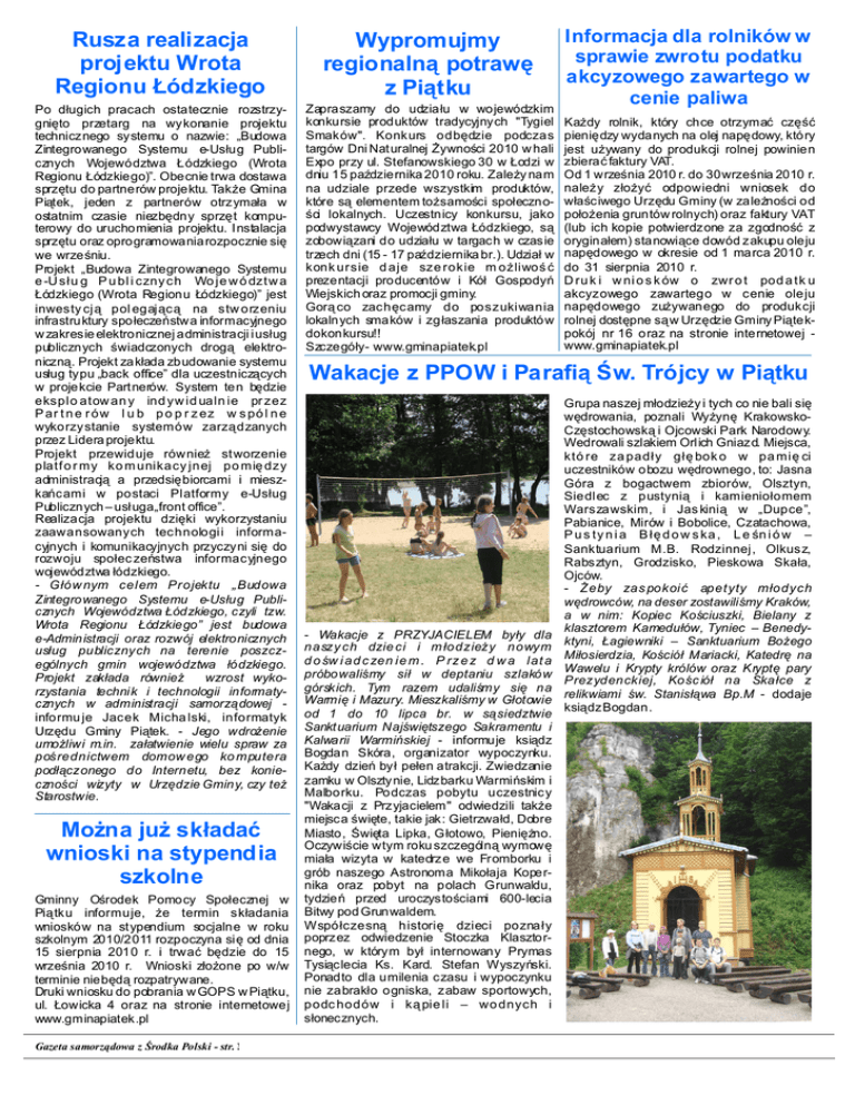 Rusza realizacja projektu Wrota Regionu ódzkiego Po d ugich pracach ostatecznie rozstrzygni to przetarg na wykonanie projektu technicznego systemu o nazwie: „Budowa Zintegrowanego Systemu e-Us ug Publicznych Województwa ódzkiego (Wrota Regionu ódzkiego)”. Obecnie trwa dostawa sprz tu do partnerów projektu. Tak e Gmina Pi tek, jeden z partnerów otrzyma a w ostatnim czasie niezb dny sprz t komputerowy do uruchomienia projektu. Instalacja sprz tu oraz oprogramowaniarozpocznie si we wrze niu. Projekt „Budowa Zintegrowanego Systemu e -U s u g P u bl i czny ch Wo je w ó dztw a ódzkiego (Wrota Regionu ódzkiego)” jest inwesty cj pol egaj na stw orzeniu infrastruktury spo ecze stwa informacyjnego w zakresie elektronicznej administracji ius ug publicznych wiadczonych drog elektroniczn . Projekt zak ada zbudowanie systemu usug typu „back office” dla uczestnicz cych w projekcie Part nerów. System ten b dzie eksplo atow an y ind yw id ualn ie pr zez P ar t n e r ów l u b p o p r z ez w s pó l n e wykorzystanie systemów zarz dzanych przez Lidera projektu. Projekt przewiduje równie stworzenie platf o r my ko m unikacy jnej po mi dzy administracj a przedsi biorcami i mieszka cami w postaci Platformy e-Us ug Publicznych – us uga„front office”. Realizacja projektu dzi ki wykorzystaniu zaawansowanych technologii informacyjnych i komunikacyjnych przyczyni si do rozwoju spo ec ze stwa informacyjnego województwa ódzkiego. - G ów nym celem Projektu „Budowa Zintegrowanego Systemu e-Us ug Publicznych Województwa ódzkiego, czyli tzw. Wrota Regionu ódzkiego” jest budowa e-Administracji oraz rozwój elektronicznych us ug publicznych na terenie poszczególnych gmin województwa ódzkiego. Projekt zak ada równie wzrost wykorzystania technik i technologii informatycznych w administracji samorz dowej informu je Jacek Micha lski, informatyk Urz du Gminy Pi tek. - Jego wdro enie umo liwi m.in. za atwienie wielu spraw za po rednictwem domow ego ko mputera pod czonego do Internetu, bez konieczno ci wiz yty w Urz dzie Gminy, czy te Starostwie. Mo na ju sk ada wnioski na stypendia szkolne Gminny O rodek Pomocy Spo ecznej w Pi tku informuje, e termin sk adania wniosków na stypendium socjalne w roku szkolnym 2010/2011 rozpoczyna si od dnia 15 sierpnia 2010 r. i trwa dzie do 15 wrze nia 2010 r. Wnioski z one po w/w terminie nieb rozpatrywane. Druki wniosku do pobrania w GOPS w Pi tku, ul. owicka 4 oraz na stronie internetowej www.gminapiatek.pl Gazeta samorz dowa z rodka Polski - str. 2 Wypromujmy regionaln potraw z Pi tku Zapraszamy do udzia u w wojewódzkim konkursie produktów tradycyjnych "Tygiel Smaków". Konkurs odb dzie podczas targów Dni Naturalnej ywno ci 2010 w hali Expo przy ul. Stefanowskiego 30 w odzi w dniu 15 pa dziernika 2010 roku. Zale y nam na udziale przede wszystkim produktów, które s elementem to samo ci spo ecznoci lokalnych. Uczestnicy konkursu, jako podwystawcy Województwa ódzkiego, s zobowi zani do udzia u w targach w czasie trzech dni (15 - 17 pa dziernika br.). Udzia w konk ursie d aje sze rokie m o liwo prezentacji producentów i Kó Gospody Wiejskich oraz promocji gminy. Gor co zach camy do poszukiwania lokalnych smaków i zg aszania produktów dokonkursu!! Szczegó y- www.gminapiatek.pl Informacja dla rolników w sprawie zwrotu podatku akcyzowego zawartego w cenie paliwa Ka dy rolnik, który chce otrzyma cz pieni dzy wydanych na olej nap dowy, który jest u ywany do produkcji rolnej powinien zbiera faktury VAT. Od 1 wrze nia 2010 r. do 30wrze nia 2010 r. nale y z odpowiedni wniosek do ciwego Urz du Gminy (w zale no ci od po enia gruntów rolnych) oraz faktury VAT (lub ich kopie potwierdzone za zgodno z orygina em) stanowi ce dowód zakupu oleju nap dowego w okresie od 1 marca 2010 r. do 31 sierpnia 2010 r. D ru k i w ni o s k ów o zwr o t pod a tk u akcyzowego zawartego w cenie oleju nap dowego zu ywanego do produkcji rolnej dost pne s w Urz dzie Gminy Pi tekpokój nr 16 oraz na stronie internetowej www.gminapiatek.pl Wakacje z PPOW i Parafi - Wakacje z PRZYJACIELEM by y dla naszy ch dzie ci i m odzie y nowym d o w i ad c zen ie m . P rz e z d w a lat a próbowali my si w deptaniu szlaków górskich. Tym razem udali my si na Warmi i Mazury. Mieszkali my w G otowie od 1 do 10 lipca br. w s siedztwie Sanktuarium Naj wi tszego Sakramentu i Kalwarii Warmi skiej - informuje ksi dz Bogdan Skóra, organizator wypoczynku. Ka dy dzie by pe en atrakcji. Zwiedzanie zamku w Olsztynie, Lidzbarku Warmi skim i Malborku. Podczas pobytu uczestnicy "Wakacji z Przyjacielem" odwiedzili tak e miejsca wi te, takie jak: Gietrzwa d, Dobre Miasto, wi ta Lipka, G otowo, Pieni no. Oczywi cie wtym roku szczególn wymow mia a wizyta w katedrze we Fromborku i grób naszego Astronoma Miko aja Kopernika oraz pobyt na polach Grunwaldu, tydzie przed uroczysto ciami 600-lecia Bitwy pod Grunwaldem. Wspó czesn histori dzieci pozna y poprzez odwiedzenie Stoczka Klasztornego, w którym by internowany Prymas Tysi clecia Ks. Kard. Stefan Wyszy ski. Ponadto dla umilenia czasu i wypoczynku nie zabrak o ogniska, zabaw sportowych, podc hodów i k pie li – wo dnych i onecznych. w. Trójcy w Pi tku Grupa naszej m odzie y i tych co nie bali si drowania, poznali Wy yn KrakowskoCz stochowsk i Ojcowski Park Narodowy. Wedrowali szlakiem Orl ich Gniazd. Miejsca, któ re za pad y g bok o w pa mi ci uczestników obozu w drownego, to: Jasna Góra z bogactwem zbiorów, Olsztyn, Siedlec z pustyni i kamienio omem Warszawskim, i Jas kini w „Dupce”, Pabianice, Mirów i Bobolice, Czatachowa, P u s ty n i a B d o w s ka , L e n i ó w – Sanktuarium M.B. Rodzinnej, Olkusz, Rabsztyn, Grodzisko, Pieskowa Ska a, Ojców. eby zas pokoi apetyty m odych drowców, na deser zostawili my Kraków, a w nim: Kopiec Ko ciuszki, Bielany z klasztorem Kamedu ów, Tyniec – Benedyktyni, agiewniki – Sanktuarium Bo ego Mi osierdzia, Ko ció Mariacki, Katedr na Wawelu i Krypty królów oraz Krypt pary Prezydenckiej, Ko c