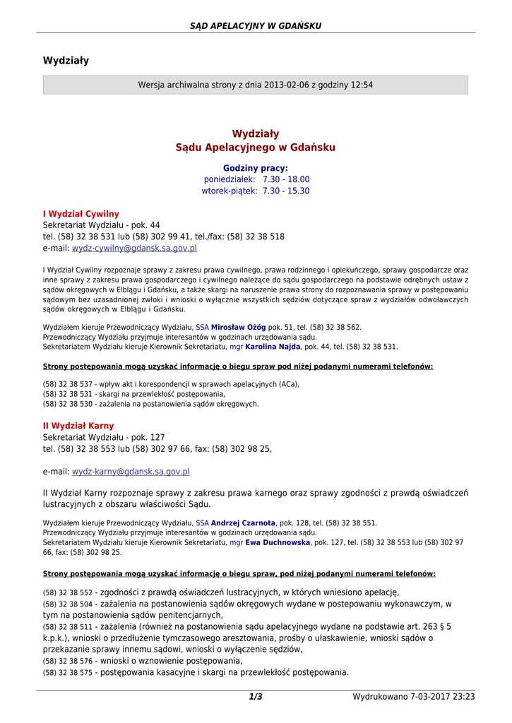 SĄD APELACYJNY W GDAŃSKU Wydziały Wersja archiwalna strony z dnia 2013-02-06 z godziny 12:54 Wydziały Sądu Apelacyjnego w Gdańsku Godziny pracy: poniedziałek: 7.30 - 18.00 wtorek-piątek: 7.30 - 15.30 I Wydział Cywilny Sekretariat Wydziału - pok. 44 tel. (58) 32 38 531 lub (58) 302 99 41, tel./fax: (58) 32 38 518 e-mail: [email protected] I Wydział Cywilny rozpoznaje sprawy z zakresu prawa cywilnego, prawa rodzinnego i opiekuńczego, sprawy gospodarcze oraz inne sprawy z zakresu prawa gospodarczego i cywilnego należące do sądu gospodarczego na podstawie odrębnych ustaw z sądów okręgowych w Elblągu i Gdańsku, a także skargi na naruszenie prawa strony do rozpoznawania sprawy w postępowaniu sądowym bez uzasadnionej zwłoki i wnioski o wyłącznie wszystkich sędziów dotyczące spraw z wydziałów odwoławczych sądów okręgowych w Elblągu i Gdańsku. Wydziałem kieruje Przewodniczący Wydziału, SSA Mirosław Ożóg pok. 51, tel. (58) 32 38 562. Przewodniczący Wydziału przyjmuje interesantów w godzinach urzędowania sądu. Sekretariatem Wydziału kieruje Kierownik Sekretariatu, mgr Karolina Najda, pok. 44, tel. (58) 32 38 531. Strony postępowania mogą uzyskać informację o biegu spraw pod niżej podanymi numerami telefonów: (58) 32 38 537 - wpływ akt i korespondencji w sprawach apelacyjnych (ACa), (58) 32 38 531 - skargi na przewlekłość postępowania, (58) 32 38 530 - zażalenia na postanowienia sądów okręgowych. II Wydział Karny Sekretariat Wydziału - pok. 127 tel. (58) 32 38 553 lub (58) 302 97 66, fax: (58) 302 98 25, e-mail: [email protected] II Wydział Karny rozpoznaje sprawy z zakresu prawa karnego oraz sprawy zgodności z prawdą oświadczeń lustracyjnych z obszaru właściwości Sądu. Wydziałem kieruje Przewodniczący Wydziału, SSA Andrzej Czarnota, pok. 128, tel. (58) 32 38 551. Przewodniczący Wydziału przyjmuje interesantów w godzinach urzędowania sądu. Sekretariatem Wydziału kieruje Kierownik Sekretariatu, mgr Ewa Duchnowska, pok. 127, tel. (58) 32 38 553 lub (58) 302 97 66, fax: (58) 302 98 25. Strony postępowania mogą uzyskać informację o biegu spraw, pod niżej podanymi numerami telefonów: (58) 32 38 552 - zgodności z prawdą oświadczeń lustracyjnych, w których wniesiono apelację, (58) 32 38 504 - zażalenia na postanowienia sądów okręgowych wydane w postepowaniu wykonawczym, w tym na postanowienia sądów penitencjarnych, (58) 32 38 511 - zażalenia (również na postanowienia sądu apelacyjnego wydane na podstawie art. 263 § 5 k.p.k.), wnioski o przedłużenie tymczasowego aresztowania, prośby o ułaskawienie, wnioski sądów o przekazanie sprawy innemu sądowi, wnioski o wyłączenie sędziów, (58) 32 38 576 - wnioski o wznowienie postępowania, (58) 32 38 575 - postępowania kasacyjne i skargi na przewlekłość postępowania. 1/3 Wydrukowano 7-03-2017 23:23 2/3 Wydrukowano 7-03-2017 23:23 III Wydział Pracy i Ubezpieczeń Społecznych Sekretariat Wydziału - pok. 123 tel. (58) 32 38 526 lub tel./fax (58) 302 98 82 e-mail: [email protected] III Wydział Pracy i Ubezpieczeń Społecznych rozpoznaje sprawy z zakresu prawa pracy i ubezpieczeń społecznych z obszaru właściwości Sądu. Wydziałem kieruje Przewodnicząca Wydziału, SSA Aleksandra Urban, pok. 121, tel. (58) 32 38 512. Przewodnicząca Wydziału przyjmuje interesantów w godzinach urzędowania sądu. Sekretariatem Wydziału kieruje Kierownik Sekretariatu, mgr Aleksandra Pastuszak, pok. 123, tel. (58) 32 38 526. Strony postępowania mogą uzyskać informację o biegu spraw, pod niżej podanymi numerami telefonów: (58) 32 38 523 - wpływ akt (AUa, APa), (58) 32 38 515, (58) 32 38 536, (58) 32 38 523 - terminy, (58) 32 38 523 - postępowanie kasacyjne, (58) 32 38 536 - skargi na przewlekłość postępowania. IV Wydział Wizytacji Sekretariat Wydziału - pok. 209 tel. (58) 32 38 505 lub (58) 32 38 506 e-mail: [email protected] IV Wydział Wizytacji wykonuje czynności związane z wewnętrznym nadzorem administracyjnym sprawowanym przez prezesa sądu apelacyjnego nad działalnością administracyjną sądów oraz współpracą w zakresie szkoleń z Krajową Szkołą Sądownictwa i Prokuratury. Przewodniczącym Wydziału jest Prezes Sądu Apelacyjnego, SSA Anna Skupna, tel. (58) 32 38 600. Sekretariatem Wydziału kieruje Kierownik Sekretariatu, pani mgr Beata Olczak, pok. 209, tel. (58) 32 38 505 Kierownikiem Szkolenia jest SSA Włodzimierz Brazewicz, pok. 26, tel. (58) 32 38 577 Obsługą sekcji zajmuje się inspektor mgr Agnieszka Skwirowska-Schoeneck, pok. 208, tel. (58) 32 38 506, e-mail: [email protected] V Wydział Cywilny Sekretariat Wydziału – pok. 48 tel. (58) 32 38 594, tel./fax: (58) 32 38 548 e-mail: [email protected] V Wydział Cywilny rozpoznaje sprawy z zakresu prawa cywilnego, prawa rodzinnego i opiekuńczego, sprawy gospodarcze oraz inne sprawy z zakresu prawa gospodarczego i cywilnego należące do sądu gospodarczego na podstawie odrębnych ustaw z sądów okręgowych w Bydgoszczy, Słupsku, Toruniu i Włocławku, a także skargi na naruszenie prawa strony do rozpoznawania sprawy w postępowaniu sądowym bez uzasadnionej zwłoki i wnioski o wyłącznie wszystkich sędziów dotyczące spraw z wydziałów odwoławczych sądów okręgowych w Bydgoszczy, Słupsku, Toruniu i Włocławku. Wydziałem kieruje Przewodniczący Wydziału, SSA Renata Artska, pok. 41, tel. (58) 32 38 525. Przewodnicząca Wydziału przyjmuje interesantów w godzinach urzędowania sądu. Sekretariatem Wydziału kieruje Kierownik Sekretariatu, Ewa Przybyła pok. 48, tel. (58) 32 38 594. Strony postępowania mogą uzyskać informację o biegu spraw, pod niżej podanymi numerami telefonów: (58) 32 38 594, (58) 32 38 564 - wpływ akt i korespondencja seryjna w sprawach apelacyjnych (ACa), (58) 32 38 594 - skargi na przewlekłość postępowania, (58) 32 38 544 - zażalenia na postanowienia sądów okręgowych. 2/3 Wydrukowano 7-03-2017 23:23 SĄD APELACYJNY W G