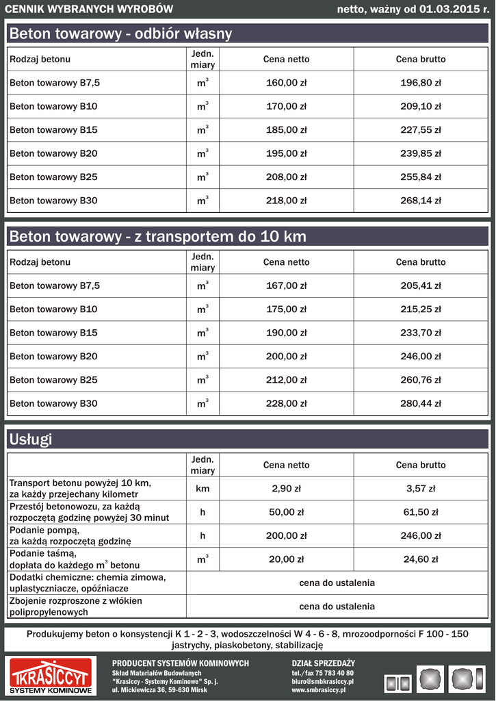 CENNIK WYBRANYCH WYROBÓW netto, wa¿ny od 01.03.2015 r. Beton towarowy - odbiór w³asny Jedn. miary Rodzaj betonu Cena netto Cena brutto Beton towarowy B7,5 m 3 160,00 z³ 196,80 z³ Beton towarowy B10 m3 170,00 z³ 209,10 z³ Beton towarowy B15 m 3 185,00 z³ 227,55 z³ Beton towarowy B20 m3 195,00 z³ 239,85 z³ Beton towarowy B25 m3 208,00 z³ 255,84 z³ Beton towarowy B30 m 3 218,00 z³ 268,14 z³ Beton towarowy - z transportem do 10 km Jedn. miary Cena netto Cena brutto Beton towarowy B7,5 m3 167,00 z³ 205,41 z³ Beton towarowy B10 m 3 175,00 z³ 215,25 z³ Beton towarowy B15 m3 190,00 z³ 233,70 z³ Beton towarowy B20 m3 200,00 z³ 246,00 z³ Beton towarowy B25 m 3 212,00 z³ 260,76 z³ Beton towarowy B30 m3 228,00 z³ 280,44 z³ Jedn. miary Cena netto Cena brutto km 2,90 z³ 3,57 z³ h 50,00 z³ 61,50 z³ h 200,00 z³ 246,00 z³ m3 20,00 z³ 24,60 z³ Rodzaj betonu Us³ugi Transport betonu powy¿ej 10 km, za ka¿dy przejechany kilometr Przestój betonowozu, za ka¿d¹ rozpoczêt¹ godzinê powy¿ej 30 minut Podanie pomp¹, za ka¿d¹ rozpoczêt¹ godzinê Podanie taœm¹, 3 dop³ata do ka¿dego m betonu Dodatki chemiczne: chemia zimowa, uplastyczniacze, opóŸniacze Zbojenie rozproszone z w³ókien polipropylenowych cena do ustalenia cena do ustalenia Produkujemy beton o konsystencji K 1 - 2 - 3, wodoszczelnoœci W 4 - 6 - 8, mrozoodpornoœci F 100 - 150 jastrychy, piaskobetony, stabilizacjê PRODUCENT SYSTEMÓW KOMINOWYCH DZIA£ SPRZEDA¯Y Sk³ad Materia³ów Budowlanych "Krasiccy - Systemy Kominowe" Sp. j. ul. Mickiewicza 36, 59-630 Mirsk tel./fax 75 783 40 80 [email protected] www.smbrasiccy.pl