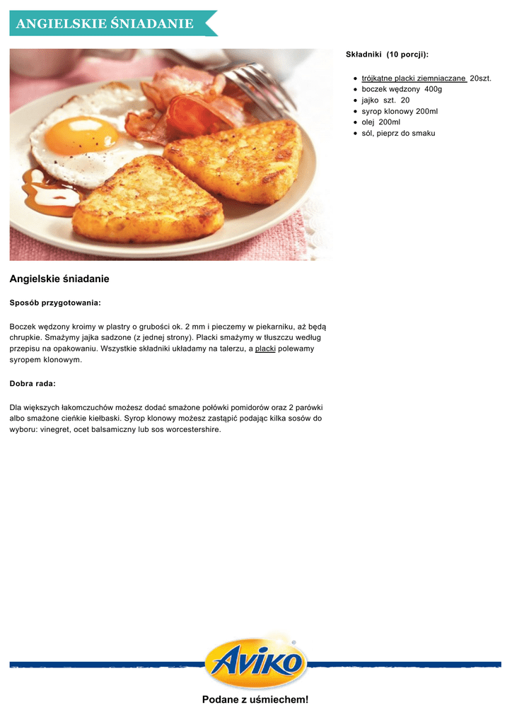ANGIELSKIE ŚNIADANIE Składniki (10 porcji): trójkątne placki ziemniaczane 20szt. boczek wędzony 400g jajko szt. 20 syrop klonowy 200ml olej 200ml sól, pieprz do smaku Angielskie śniadanie Sposób przygotowania: Boczek wędzony kroimy w plastry o grubości ok. 2 mm i pieczemy w piekarniku, aż będą chrupkie. Smażymy jajka sadzone (z jednej strony). Placki smażymy w tłuszczu według przepisu na opakowaniu. Wszystkie składniki układamy na talerzu, a placki polewamy syropem klonowym. Dobra rada: Dla większych łakomczuchów możesz dodać smażone połówki pomidorów oraz 2 parówki albo smażone cieńkie kiełbaski. Syrop klonowy możesz zastąpić podając kilka sosów do wyboru: vinegret, ocet balsamiczny lub sos worcestershire. Podane z uśmiechem!
