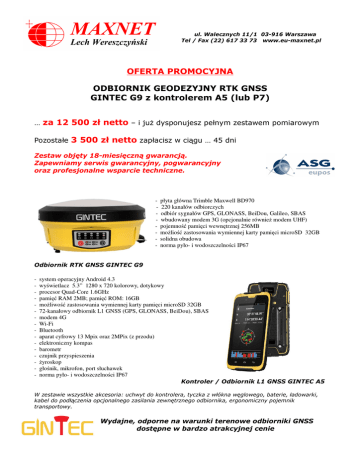 ul. Walecznych 11/1 03-916 Warszawa Tel / Fax (22) 617 33 73 www.eu-maxnet.pl OFERTA PROMOCYJNA ODBIORNIK GEODEZYJNY RTK GNSS GINTEC G9 z kontrolerem A5 (lub P7) … za 12 500 zł netto – i już dysponujesz pełnym zestawem pomiarowym Pozostałe 3 500 zł netto zapłacisz w ciągu … 45 dni Zestaw objęty 18-miesięczną gwarancją. Zapewniamy serwis gwarancyjny, pogwarancyjny oraz profesjonalne wsparcie techniczne. - 220 kanałów odbiorczych - płyta główna Trimble Maxwell BD970 220 kanałów odbiorczych odbiór sygnałów GPS, GLONASS, BeiDou, Galileo, SBAS wbudowany modem 3G (opcjonalnie również modem UHF) pojemność pamięci wewnętrznej 256MB możliość zastosowania wymiennej karty pamięci microSD 32GB solidna obudowa norma pyło- i wodoszczelności IP67 Odbiornik RTK GNSS GINTEC G9 - system operacyjny Android 4.3 wyświetlacz 5.3” 1280 x 720 kolorowy, dotykowy procesor Quad-Core 1.6GHz pamięć RAM 2MB; pamięć ROM: 16GB możliwość zastosowania wymiennej karty pamięci microSD 32GB 72-kanałowy odbiornik L1 GNSS (GPS, GLONASS, BeiDou), SBAS modem 4G Wi-Fi Bluetooth aparat cyfrowy 13 Mpix oraz 2MPix (z przodu) elektroniczny kompas barometr czujnik przyspieszenia żyroskop głośnik, mikrofon, port słuchawek norma pyło- i wodoszczelności IP67 Kontroler / Odbiornik L1 GNSS GINTEC A5 W zestawie wszystkie akcesoria: uchwyt do kontrolera, tyczka z włókna węglowego, baterie, ładowarki, kabel do podłączenia opcjonalnego zasilania zewnętrznego odbiornika, ergonomiczny pojemnik transportowy. Wydajne, odporne na warunki terenowe odbiorniki GNSS dostępne w bardzo atrakcyjnej cenie
