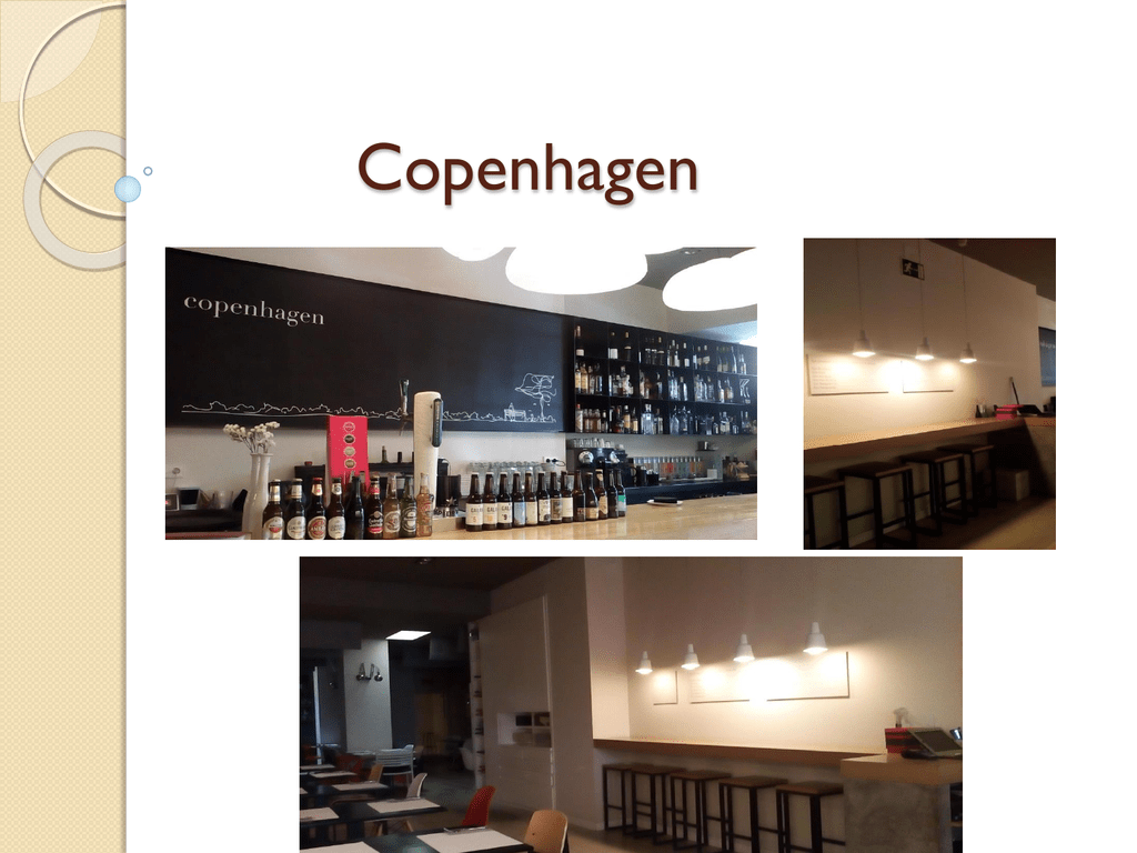 Copenhagen Dzielnica Restauracja Copenhagen znajduje się w najmodniejszej dzielnicy Walencji. Kiedyś dzielnica ta była uboga, zaniedbana i zamieszkania przez imigrantów głównie z Maroko. Następnie wprowadzili się tam artyści, gdyż mieszkania były tanie. Obecnie jest tam bardzo ładnie, ale także drogo. Potrawy Copenhagen jest specyficzna. Podawane są tam dania wegetariańskie i wegańskie. Nie zapomniano też o osobach, które nie mogą spożywać glutenu. Personel Pracownicy restauracji są niezwykle życzliwi i pomocni. Chętnie udzielają wskazówek jak pracować efektywniej. Nauczyłam się m.in.. obsługiwać gości, nakrywać stoliki oraz różnych czynności wykonywanych w restauracji. Miałam możliwość zobaczyć jak świętuje się urodziny gości oraz jak obsługiwani są najmłodsi klienci.