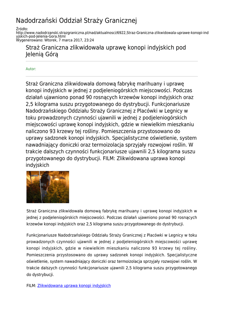 Nadodrzański Oddział Straży Granicznej Źródło: http://www.nadodrzanski.strazgraniczna.pl/nad/aktualnosci/6922,Straz-Graniczna-zlikwidowala-uprawe-konopi-ind yjskich-pod-Jelenia-Gora.html Wygenerowano: Wtorek, 7 marca 2017, 23:24 Straż Graniczna zlikwidowała uprawę konopi indyjskich pod Jelenią Górą Autor: Straż Graniczna zlikwidowała domową fabrykę marihuany i uprawę konopi indyjskich w jednej z podjeleniogórskich miejscowości. Podczas działań ujawniono ponad 90 rosnących krzewów konopi indyjskich oraz 2,5 kilograma suszu przygotowanego do dystrybucji. Funkcjonariusze Nadodrzańskiego Oddziału Straży Granicznej z Placówki w Legnicy w toku prowadzonych czynności ujawnili w jednej z podjeleniogórskich miejscowości uprawę konopi indyjskich, gdzie w niewielkim mieszkaniu naliczono 93 krzewy tej rośliny. Pomieszczenia przystosowano do uprawy sadzonek konopi indyjskich. Specjalistyczne oświetlenie, system nawadniający doniczki oraz termoizolacja sprzyjały rozwojowi roślin. W trakcie dalszych czynności funkcjonariusze ujawnili 2,5 kilograma suszu przygotowanego do dystrybucji. FILM: Zlikwidowana uprawa konopi indyjskich Straż Graniczna zlikwidowała domową fabrykę marihuany i uprawę konopi indyjskich w jednej z podjeleniogórskich miejscowości. Podczas działań ujawniono ponad 90 rosnących krzewów konopi indyjskich oraz 2,5 kilograma suszu przygotowanego do dystrybucji. Funkcjonariusze Nadodrzańskiego Oddziału Straży Granicznej z Placówki w Legnicy w toku prowadzonych czynności ujawnili w jednej z podjeleniogórskich miejscowości uprawę konopi indyjskich, gdzie w niewielkim mieszkaniu naliczono 93 krzewy tej rośliny. Pomieszczenia przystosowano do uprawy sadzonek konopi indyjskich. Specjalistyczne oświetlenie, system nawadniający doniczki oraz termoizolacja sprzyjały rozwojowi roślin. W trakcie dalszych czynności funkcjonariusze ujawnili 2,5 kilograma suszu przygotowanego do dystrybucji. FILM: Zlikwidowana uprawa konopi indyjskich Do sprawy zatrzymano dwóch mężczyzn, Polaków, w wieku 27 i 38 lat. Usłyszeli zarzut nielegalnej uprawy konopi indyjskich i wytwarzania środków narkotycznych. Wobec jednego z nich sąd postanowił o zastosowaniu tymczasowego aresztowania, a drugi otrzymał dozór policyjny. Za uprawę konopi indyjskich grozi kara pozbawienia wolności nawet do lat 8. Szacunkowa wartość ujawnionych konopi indyjskich i suszu to ponad 130 000 zł.