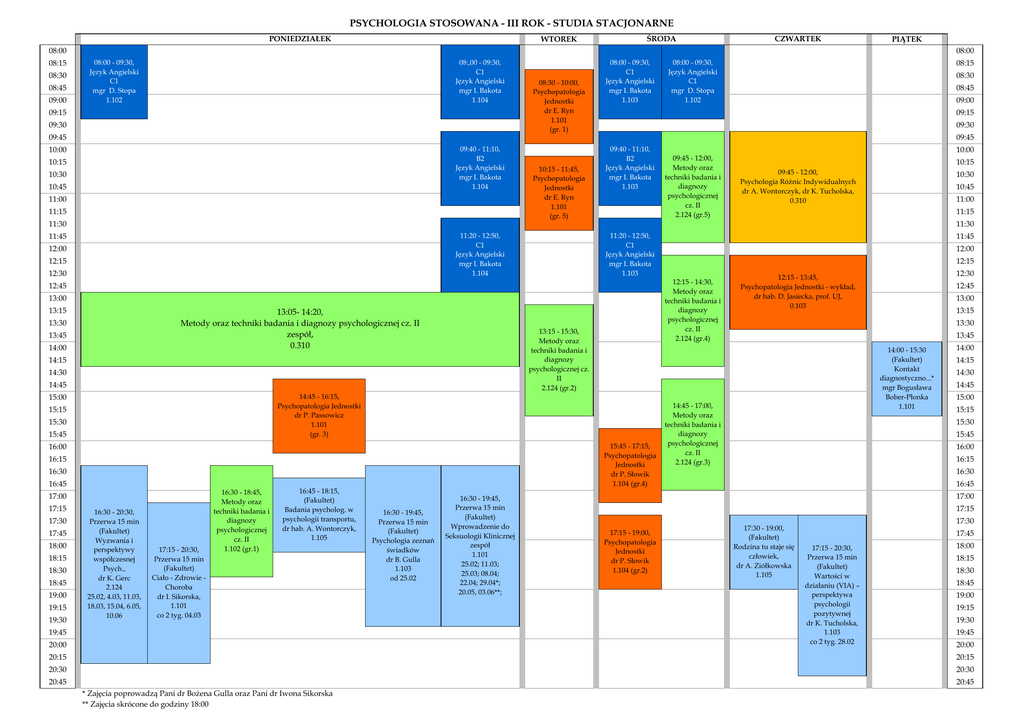 PSYCHOLOGIA STOSOWANA - III ROK - STUDIA STACJONARNE PONIEDZIAŁEK WTOREK ŚRODA CZWARTEK PIĄTEK 08:00 08:15 08:30 08:45 09:00 08:00 08:00 - 09:30, Język Angielski C1 mgr D. Stopa 1.102 08:,00 - 09:30, C1 Język Angielski mgr I. Bakota 1.104 09:15 09:30 08:30 - 10:00, Psychopatologia Jednostki dr E. Ryn 1.101 (gr. 1) 08:00 - 09:30, C1 Język Angielski mgr I. Bakota 1.103 08:00 - 09:30, Język Angielski C1 mgr D. Stopa 1.102 08:15 08:30 08:45 09:00 09:15 09:30 09:45 09:45 09:40 - 11:10, B2 Język Angielski mgr I. Bakota 1.104 10:00 10:15 10:30 10:45 11:00 11:15 10:15 - 11:45, Psychopatologia Jednostki dr E. Ryn 1.101 (gr. 5) 09:40 - 11:10, B2 Język Angielski mgr I. Bakota 1.103 10:00 09:45 - 12:00, Metody oraz techniki badania i diagnozy psychologicznej cz. II 2.124 (gr.5) 10:15 09:45 - 12:00, Psychologia Różnic Indywidualnych dr A. Wontorczyk, dr K. Tucholska, 0.310 10:30 10:45 11:00 11:15 11:30 11:30 11:20 - 12:50, C1 Język Angielski mgr I. Bakota 1.104 11:45 12:00 12:15 12:30 11:20 - 12:50, C1 Język Angielski mgr I. Bakota 1.103 13:00 13:05- 14:20, Metody oraz techniki badania i diagnozy psychologicznej cz. II zespół, 0.310 13:30 13:45 14:00 13:15 - 15:30, Metody oraz techniki badania i diagnozy psychologicznej cz. II 2.124 (gr.2) 14:15 14:30 14:45 14:45 - 16:15, Psychopatologia Jednostki dr P. Passowicz 1.101 (gr. 3) 15:00 15:15 15:30 15:45 15:45 - 17:15, Psychopatologia Jednostki dr P. Słowik 1.104 (gr.4) 16:00 16:15 16:30 16:45 17:00 17:15 17:30 17:45 18:00 18:15 18:30 18:45 19:00 19:15 19:30 16:30 - 20:30, Przerwa 15 min (Fakultet) Wyzwania i perspektywy współczesnej Psych., dr K. Gerc 2.124 25.02, 4.03, 11.03, 18.03, 15.04, 6.05, 10.06 17:15 - 20:30, Przerwa 15 min (Fakultet) Ciało - Zdrowie Choroba dr I. Sikorska, 1.101 co 2 tyg. 04.03 16:30 - 18:45, Metody oraz techniki badania i diagnozy psychologicznej cz. II 1.102 (gr.1) 16:45 - 18:15, (Fakultet) Badania psycholog. w psychologii transportu, dr hab. A. Wontorczyk, 1.105 19:45 20:00 16:30 - 19:45, Przerwa 15 min (Fakultet) Psychologia zeznań świadków dr B. Gulla 1.103 od 25.02 16:30 - 19:45, Przerwa 15 min (Fakultet) Wprowadzenie do Seksuologii Klinicznej zespół 1.101 25.02; 11.03; 25.03; 08.04; 22.04; 29.04*; 20.05, 03.06**; 12:00 12:15 12:15 - 14:30, Metody oraz techniki badania i diagnozy psychologicznej cz. II 2.124 (gr.4) 12:45 13:15 11:45 12:30 12:15 - 13:45, Psychopatologia Jednostki - wykład, dr hab. D. Jasiecka, prof. UJ, 0.103 12:45 13:00 13:15 13:30 13:45 14:00 - 15:30 (Fakultet) Kontakt diagnostyczno...* mgr Bogusława Bober-Płonka 1.101 14:45 - 17:00, Metody oraz techniki badania i diagnozy psychologicznej cz. II 2.124 (gr.3) 14:00 14:15 14:30 14:45 15:00 15:15 15:30 15:45 16:00 16:15 16:30 16:45 17:00 17:15 17:15 - 19:00, Psychopatologia Jednostki dr P. Słowik 1.104 (gr.2) 17:30 - 19:00, (Fakultet) Rodzina tu staje się człowiek, dr A. Ziółkowska 1.105 17:30 17:45 17:15 - 20:30, Przerwa 15 min (Fakultet) Wartości w działaniu (VIA) – perspektywa psychologii pozytywnej dr K. Tucholska, 1.103 co 2 tyg. 28.02 18:00 18:15 18:30 18:45 19:00 19:15 19:30 19:45 20:00 20:15 20:15 20:30 20:30 20:45 20:45 * Zajęcia poprowadzą Pani dr Bożena Gulla oraz Pani dr Iwona Sikorska ** Zajęcia skrócone do godziny 18:00