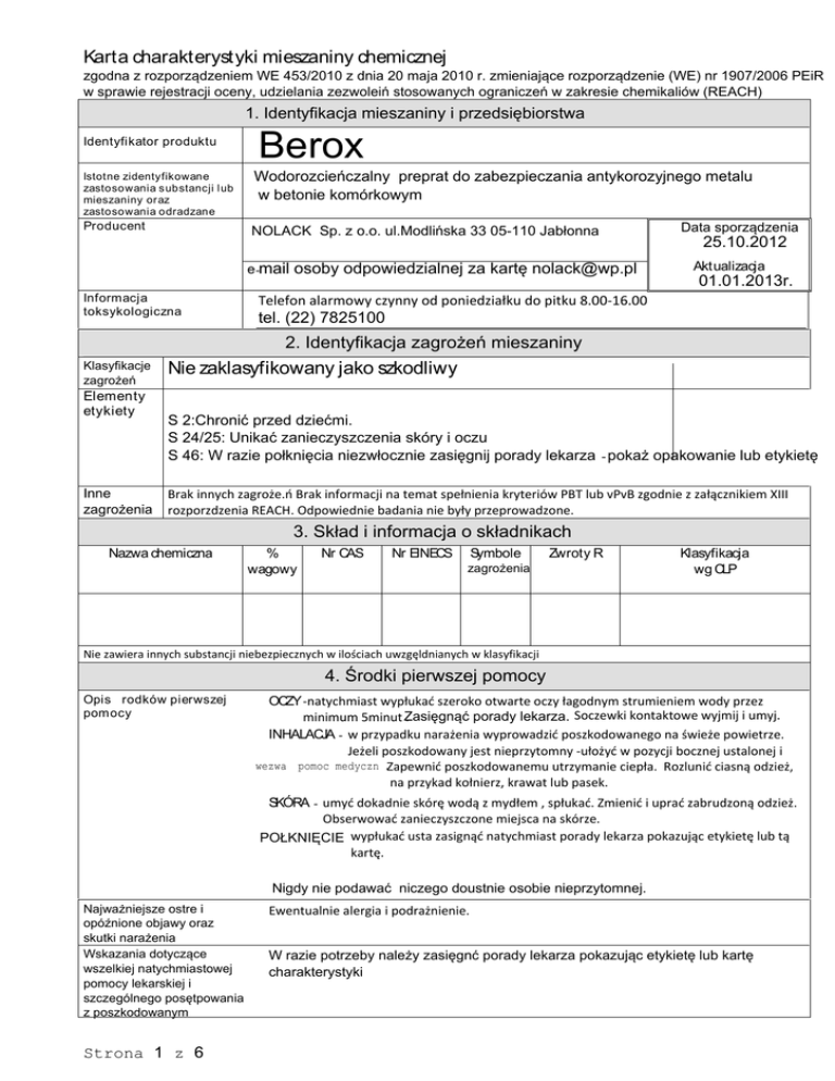 Karta charakterystyki mieszaniny chemicznej zgodna z rozporządzeniem WE 453/2010 z dnia 20 maja 2010 r. zmieniające rozporządzenie (WE) nr 1907/2006 PEiR w sprawie rejestracji oceny, udzielania zezwoleiń stosowanych ograniczeń w zakresie chemikaliów (REACH) 1. Identyfikacja mieszaniny i przedsiębiorstwa Identyfikator produktu Berox Istotne zidentyfikowane zastosowania substancji lub mieszaniny oraz zastosowania odradzane Wodorozcieńczalny preprat do zabezpieczania antykorozyjnego metalu w betonie komórkowym Producent NOLACK Sp. z o.o. ul.Modlińska 33 05-110 Jabłonna e‐mail osoby odpowiedzialnej za kartę [email protected] Informacja toksykologiczna Data sporządzenia 25.10.2012 Aktualizacja 01.01.2013r. Telefon alarmowy czynny od poniedziałku do pitku 8.00‐16.00 tel. (22) 7825100 2. Identyfikacja zagrożeń mieszaniny Klasyfikacje zagrożeń Elementy etykiety Inne zagrożenia Nie zaklasyfikowany jako szkodliwy S 2:Chronić przed dziećmi. S 24/25: Unikać zanieczyszczenia skóry i oczu S 46: W razie połknięcia niezwłocznie zasięgnij porady lekarza ‐pokaż opakowanie lub etykietę Brak innych zagroże.ń Brak informacji na temat spełnienia kryteriów PBT lub vPvB zgodnie z załącznikiem XIII rozporzdzenia REACH. Odpowiednie badania nie były przeprowadzone. 3. Skład i informacja o składnikach Nazwa chemiczna % wagowy Nr CAS Nr EINECS Symbole Zwroty R zagrożenia Klasyfikacja wg CLP Nie zawiera innych substancji niebezpiecznych w ilościach uwzgęldnianych w klasyfikacji 4. Środki pierwszej pomocy Opis rodków pierwszej pomocy OCZY ‐natychmiast wypłukać szeroko otwarte oczy łagodnym strumieniem wody przez porady lekarza. Soczewki kontaktowe wyjmij i umyj. minimum 5minut Zasięgnąć . INHALACJA ‐ w przypadku narażenia wyprowadzić poszkodowanego na świeże powietrze. Jeżeli poszkodowany jest nieprzytomny ‐ułożyć w pozycji bocznej ustalonej i wezwa pomoc medyczn .Zapewnić poszkodowanemu utrzymanie ciepła. Rozlunić ciasną odzież, na przykad kołnierz, krawat lub pasek. SKÓRA ‐ umyć dokadnie skórę wodą z mydłem , spłukać. Zmienić i uprać zabrudzoną odzież. Obserwować zanieczyszczone miejsca na skórze. POŁKNIĘCIE wypłukać usta zasignąć natychmiast porady lekarza pokazując etykietę lub tą kartę. Nigdy nie podawać niczego doustnie osobie nieprzytomnej. Najważniejsze ostre i opóźnione objawy oraz skutki narażenia Wskazania dotyczące wszelkiej natychmiastowej pomocy lekarskiej i szczególnego posętpowania z poszkodowanym Strona 1 z 6 Ewentualnie alergia i podrażnienie. W razie potrzeby należy zasięgnć porady lekarza pokazując etykietę lub kartę charakterystyki