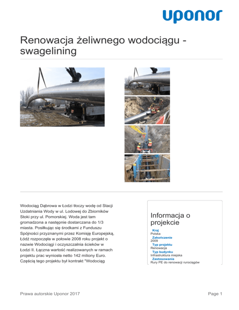 Renowacja żeliwnego wodociągu swagelining Wodociąg Dąbrowa w Łodzi tłoczy wodę od Stacji Uzdatniania Wody w ul. Lodowej do Zbiorników Stoki przy ul. Pomorskiej. Woda jest tam gromadzona a następnie dostarczana do 1/3 miasta. Posiłkując się środkami z Funduszu Spójności przyznanymi przez Komisję Europejską, Łódź rozpoczęła w połowie 2008 roku projekt o nazwie Wodociągi i oczyszczalnia ścieków w Łodzi II. Łączna wartość realizowanych w ramach projektu prac wyniosła netto 142 miliony Euro. Częścią tego projektu był kontrakt "Wodociąg Prawa autorskie Uponor 2017 Informacja o projekcie Kraj Polska Zakończenie 2009 Typ projektu Renowacja Typ budynku Infrastruktura miejska Zastosowania Rury PE do renowacji rurociągów Page 1 Dąbrowa - modernizacja systemu zasilania Łodzi w wodę" - Część 02C "Wodociąg Dąbrowa Modernizacja rurociągu wody uzdatnionej" o wartości netto prawie 3,5 mln Euro. W ramach projektu poddano modernizacji wodociąg o średnicy nominalnej DN750mm i długości około 5440 mb. Zamawiający (Łódzka Spółka Infrastrukturalna) zasugerował by renowację omawianego rurociągu przeprowadzić z wykorzystaniem swageliningu. Swagelining to metoda "ciasno pasowania", która polega na wprowadzeniu do wnętrza zniszczonego rurociągu rur PE o chwilowo zmniejszonej średnicy (dzieje się to poprzez podgrzanie rur i przyłożenie stałej siły ciągu). Po wciągnięciu przewodu siła ciągu zostaje zwolniona i rura PE rozprężając się dopasowuje swoją średnicę do wewnętrznej średnicy starego przewodu. Zyskujemy w ten sposób dodatkowe wzmocnienie konstrukcyjne naprawianego rurociągu. ciśnieniowych Rozmiar Rury ciśnieniowe PE WehoPipe PE100 DA800 SDR17 PN10 – około 600 m Partnerzy Wykonawca: Konsorcjum firm: Infra SA (lider konsorcjum), PBG SA (partner konsorcjum), Wiertmar sp. z o.o. (partner konsorcjum) i Bud-Inż. sp. z o.o. (partner konsorcjum) Do realizacji zadania wykonawca (Wiertmar) użył początkowo rury PEHD DN800 SDR17, grubość ścianki 47,4mm produkcji firmy X. Specjalnie nie podajemy producenta rur, ponieważ próba ta zakończyła się niepowodzeniem. Prace przeprowadzono w okresie zimowym. Rozpoczęto od zgrzewania doczołowego 12-metrowych odcinków rur. Okazało się jednak, że rury producenta X są sztywne i mało plastyczne oraz nie trzymają wymiaru kołowego, co utrudniało prawidłowe ustawienie rur w zgrzewarce. Poważniejszy problem pojawił się jednak później. Po zgrzaniu rur rozpoczęto ich instalację i po przejściu przez reduktor nastąpiło pęknięcie zgrzewu. Szybko przeprowadzono operację wyciągnięcia wprowadzonej już do środka rury PEHD. Na szczęście rura nie zdążyła przejść procesu relaksacji i nie nastąpiło jej ciasno pasowanie. Wykonawca postanowił przeanalizować zaistniałą Prawa autorskie Uponor 2017 Page 2 sytuację wysyłając rury producenta X do zbadania do dwóch laboratoriów. Na podstawie otrzymanych wyników badań stwierdzono, że rury nie spełniają wymagań normy PN-EN 12201-2 w zakresie wymiaru grubości ścianki. Pozostałe wyniki badań były zgodne z wymaganiami normatywnymi. Podjęto decyzję o pozostaniu przy rurach producenta X, ponieważ mozolne próby i testy prowadzone w oczekiwaniu na lepsze warunki pogodowe, wskazywały na taką możliwość. Niestety i tym razem próba zakończyła się niepowodzeniem i zgrzew pęknął. Podjęto zatem natychmiastową decyzję o zmianie producenta rur. Wybór padł na rury WehoPipe PE100 DA800 SDR17 PN10, grubość ścianki 47,4mm, produkcji Uponor Infra (dawniej KWH Pipe Poland). Na specjalne zamówienie zostały wyprodukowane 15-metrowe odcinki rur by skrócić proces zgrzewania. Rury dostarczono na plac budowy kilka dni później. „Rzut oka na powierzchnię zewnętrzną rury wystarczył, aby stwierdzić wyraźną różnicę w dostarczonej przez KWH rurze i rurze producenta X” - zauważył pan Marek Piekarski prezes firmy Wiertmar. „Dostarczone rury "trzymały" okrąg, ich powierzchnia była idealnie gładka, tymczasem powierzchnia rur producenta X przypominała strukturą skórkę pomarańczową. Zauważyliśmy także, że dostarczone rury są bardzo plastyczne.” Zgrzewanie rur WehoPipe przebiegło tym razem bardzo sprawnie i szybko a operacja wciągnięcia rur bezproblemowo. Metoda ciasnopasowania została zastosowana na pierwszym odcinku magistrali przy wyjściu ze Stacji Uzdatniania Wody, gdzie występują największe uderzenia hydrauliczne i gdzie rurociąg był najbardziej eksploatowany, przy przejściach pod bardzo ruchliwymi drogami (ul. Dąbrowskiego, Przybyszewskiego, Piłsudskiego), pod torami PKP i torami tramwajowymi. Kontrakt w Łodzi był kolejnym sprawdzianem Prawa autorskie Uponor 2017 Page 3 zarówno dla wykonawcy - firmy Wiertmar, jak i dla Uponor Infra jako producenta i dostawcy rur. Zastosowanie swageliningu było wprawdzie ogromnym wyzwaniem ale umożliwiło ograniczenie do minimum utrudnień w komunikacji. Większość robót prowadzona była w samym centrum 750-tysięcznego miasta, na terenie silnie zurbanizowanym w pasach drogowych o dużym natężeniu ruchu pojazdów kołowych i szynowych, do tego w niekorzystnym okresie zimowo-wiosennym. Gotowość firmy Wiertmar do kontynuowania prac w technologii swageliningu można traktować jako swoiste świadectwo wystawione rurom WehoPipe oraz firmie Uponor Infra. Parametry odnawianego rurociągu: średnica zewnętrzna wciąganej rury PE - 800 mm; średnica wewnętrzna poddawanego renowacji rurociągu - 750 mm; średnica zewnętrzna rury PE po przejściu przez reduktor - około 730 mm; średnica zewnętrzna rury PE po procesie relaksacji - około 760 mm. Prawa autorskie Uponor 2017 Page 4