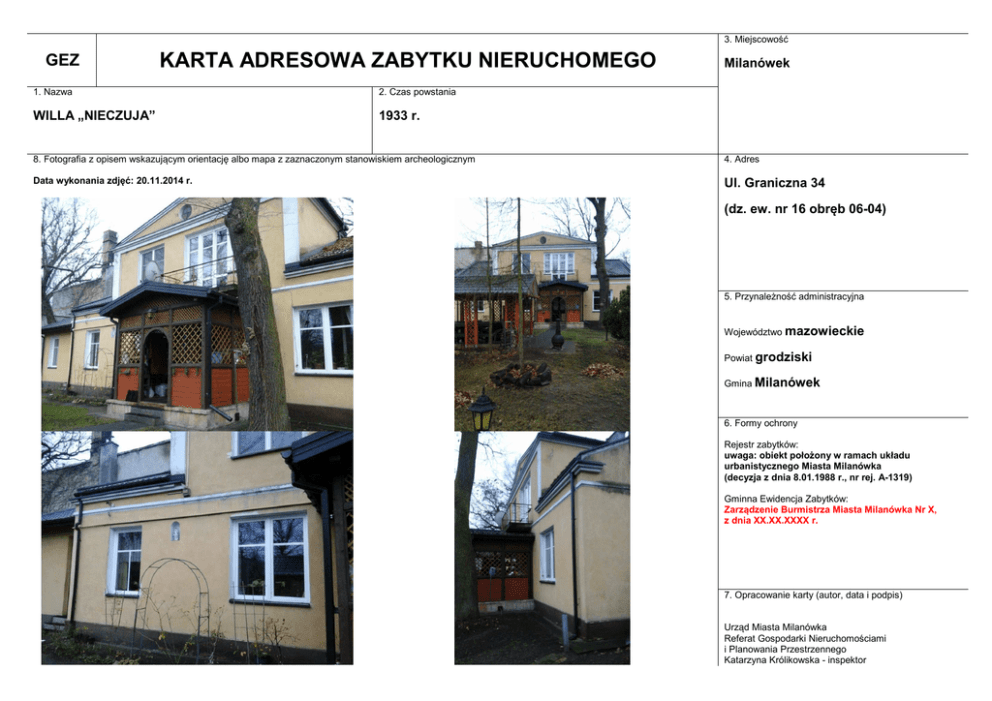 3. Miejscowość GEZ KARTA ADRESOWA ZABYTKU NIERUCHOMEGO 1. Nazwa 2. Czas powstania WILLA „NIECZUJA” 1933 r. Milanówek 8. Fotografia z opisem wskazującym orientację albo mapa z zaznaczonym stanowiskiem archeologicznym 4. Adres Data wykonania zdjęć: 20.11.2014 r. Ul. Graniczna 34 (dz. ew. nr 16 obręb 06-04) 5. Przynależność administracyjna Województwo mazowieckie Powiat grodziski Gmina Milanówek 6. Formy ochrony Rejestr zabytków: uwaga: obiekt położony w ramach układu urbanistycznego Miasta Milanówka (decyzja z dnia 8.01.1988 r., nr rej. A-1319) Gminna Ewidencja Zabytków: Zarządzenie Burmistrza Miasta Milanówka Nr X, z dnia XX.XX.XXXX r. 7. Opracowanie karty (autor, data i podpis) Urząd Miasta Milanówka Referat Gospodarki Nieruchomościami i Planowania Przestrzennego Katarzyna Królikowska - inspektor