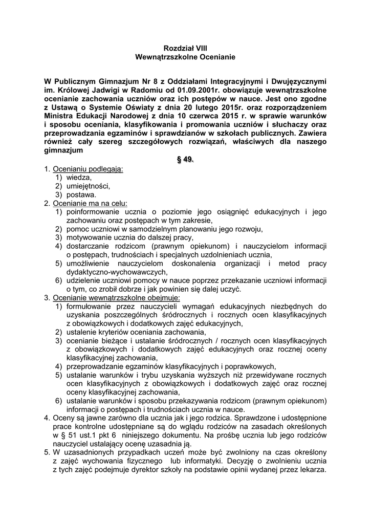 Rozdział VIII Wewnątrzszkolne Ocenianie W Publicznym Gimnazjum Nr 8 z Oddziałami Integracyjnymi i Dwujęzycznymi im. Królowej Jadwigi w Radomiu od 01.09.2001r. obowiązuje wewnątrzszkolne ocenianie zachowania uczniów oraz ich postępów w nauce. Jest ono zgodne z Ustawą o Systemie Oświaty z dnia 20 lutego 2015r. oraz rozporządzeniem Ministra Edukacji Narodowej z dnia 10 czerwca 2015 r. w sprawie warunków i sposobu oceniania, klasyfikowania i promowania uczniów i słuchaczy oraz przeprowadzania egzaminów i sprawdzianów w szkołach publicznych. Zawiera również cały szereg szczegółowych rozwiązań, właściwych dla naszego gimnazjum § 49. 1. Ocenianiu podlegają: 1) wiedza, 2) umiejętności, 3) postawa. 2. Ocenianie ma na celu: 1) poinformowanie ucznia o poziomie jego osiągnięć edukacyjnych i jego zachowaniu oraz postępach w tym zakresie, 2) pomoc uczniowi w samodzielnym planowaniu jego rozwoju, 3) motywowanie ucznia do dalszej pracy, 4) dostarczanie rodzicom (prawnym opiekunom) i nauczycielom informacji o postępach, trudnościach i specjalnych uzdolnieniach ucznia, 5) umożliwienie nauczycielom doskonalenia organizacji i metod pracy dydaktyczno-wychowawczych, 6) udzielenie uczniowi pomocy w nauce poprzez przekazanie uczniowi informacji o tym, co zrobił dobrze i jak powinien się dalej uczyć. 3. Ocenianie wewnątrzszkolne obejmuje: 1) formułowanie przez nauczycieli wymagań edukacyjnych niezbędnych do uzyskania poszczególnych śródrocznych i rocznych ocen klasyfikacyjnych z obowiązkowych i dodatkowych zajęć edukacyjnych, 2) ustalenie kryteriów oceniania zachowania, 3) ocenianie bieżące i ustalanie śródrocznych / rocznych ocen klasyfikacyjnych z obowiązkowych i dodatkowych zajęć edukacyjnych oraz rocznej oceny klasyfikacyjnej zachowania, 4) przeprowadzanie egzaminów klasyfikacyjnych i poprawkowych, 5) ustalanie warunków i trybu uzyskania wyższych niż przewidywane rocznych ocen klasyfikacyjnych z obowiązkowych i dodatkowych zajęć oraz rocznej oceny klasyfikacyjnej zachowania, 6) ustalanie warunków i sposobu przekazywania rodzicom (prawnym opiekunom) informacji o postępach i trudnościach ucznia w nauce. 4. Oceny są jawne zarówno dla ucznia jak i jego rodzica. Sprawdzone i udostępnione prace kontrolne udostępniane są do wglądu rodziców na zasadach określonych w § 51 ust.1 pkt 6 niniejszego dokumentu. Na prośbę ucznia lub jego rodziców nauczyciel ustalający ocenę uzasadnia ją. 5. W uzasadnionych przypadkach uczeń może być zwolniony na czas określony z zajęć wychowania fizycznego lub informatyki. Decyzję o zwolnieniu ucznia z tych zajęć podejmuje dyrektor szkoły na podstawie opinii wydanej przez lekarza. W przypadku zwolnienia ucznia z zajęć wychowania fizycznego lub informatyki w dokumentacji przebiegu nauczania zamiast oceny klasyfikacyjnej wpisuje się „zwolniony”. 1) Dyrektor szkoły zwalnia ucznia z wykonywania określonych ćwiczeń fizycznych na zajęciach wychowania fizycznego, na podstawie opinii o ograniczonych możliwościach wykonywania przez ucznia tych ćwiczeń wydanej przez lekarza, na czas określony w tej opinii. 2) Dyrektor szkoły na wniosek rodziców oraz na podstawie opinii poradni psychologiczno-pedagogicznej, w tym poradni specjalistycznej, zwalnia do końca danego etapu edukacyjnego ucznia z wadą słuchu, z głęboką dysleksją rozwojową, z afazją, z niepełnosprawnościami sprzężonymi lub z autyzmem, w tym z zespołem Aspergera, z nauki drugiego języka obcego nowożytnego. 6. Ocena uczniów z różnymi rodzajami niepełnosprawności winna, oprócz aspektu informacyjnego, w szczególności posiadać aspekt psychologiczny i terapeutyczny, dlatego kryteria i sposób oceniania, a także egzekwowania wiedzy winny być dostosowane do możliwości ucznia tak, aby sprzyjały procesowi leczenia i nie przynosiły dodatkowego stresu. 7. W zależności od indywidualnych potrzeb edukacyjnych i możliwości psychofizycznych uczniów niepełnosprawnych oraz niedostosowanych społecznie, nauczyciele opracowują dla każdego ucznia i realizują indywidualne programy edukacyjno terapeutyczne określające zakres zintegrowanych działań nauczycieli. Stopień realizacji programu powinien być dostosowany do indywidualnych potrzeb i możliwości ucznia. § 50. 1. Rok szkolny składa się z dwóch okresów nauki. 2. Oceny bieżące, klasyfikacyjne śródroczne i roczne podsumowujące osiągnięcia edukacyjne ustala się wg skali: 1) stopień celujący (oznaczenie cyfrowe - 6, skrót – cel) oznacza, że osiągnięcia ucznia wyraźnie wykraczają poza poziom osiągnięć edukacyjnych przewidzianych w realizowanym przez nauczyciela programie nauczania, są oryginalne i twórcze oraz wskazują na dużą samodzielność w ich uzyskaniu. 2) stopień bardzo dobry (oznaczenie cyfrowe - 5, skrót – bdb) oznacza, że uczeń opanował pełny zakres wiadomości i umiejętności przewidzianych w realizowanym przez nauczyciela programie nauczania. 3) stopień dobry (oznaczenie cyfrowe - 4, skrót – db) oznacza, że opanowanie przez ucznia zakresu wiadomości i umiejętności przewidzianych w realizowanym przez nauczyciela programie nauczania nie jest pełne, ale nie prognozuje żadnych kłopotów w opanowaniu kolejnych treści kształcenia. 4) stopień dostateczny (oznaczenie cyfrowe - 3, skrót – dst) oznacza, że uczeń opanował jedynie w podstawowym zakresie wiadomości i umiejętności przewidziane w realizowanym przez nauczyciela programie nauczania, co może oznaczać jego kłopoty przy poznawaniu kolejnych, trudniejszych treści kształcenia w ramach danego przedmiotu (dziedziny edukacji). 5) stopień dopuszczający (oznaczenie cyfrowe - 2, skrót – dop) oznacza, że opanowanie przez ucznia wiadomości i umiejętności przewidzianych w realizowanym przez nauczyciela programie nauczania jest tak niewielkie, że stawia pod znakiem zapytania możliwość dalszego kształcenia w danym przedmiocie (dzie