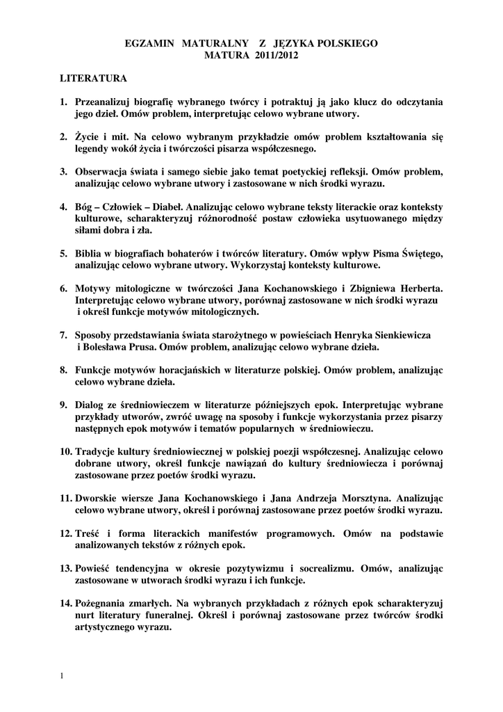 EGZAMIN MATURALNY Z JĘZYKA POLSKIEGO MATURA 2011/2012 LITERATURA 1. Przeanalizuj biografię wybranego twórcy i potraktuj ją jako klucz do odczytania jego dzieł. Omów problem, interpretując celowo wybrane utwory. 2. Życie i mit. Na celowo wybranym przykładzie omów problem kształtowania się legendy wokół życia i twórczości pisarza współczesnego. 3. Obserwacja świata i samego siebie jako temat poetyckiej refleksji. Omów problem, analizując celowo wybrane utwory i zastosowane w nich środki wyrazu. 4. Bóg – Człowiek – Diabeł. Analizując celowo wybrane teksty literackie oraz konteksty kulturowe, scharakteryzuj różnorodność postaw człowieka usytuowanego między siłami dobra i zła. 5. Biblia w biografiach bohaterów i twórców literatury. Omów wpływ Pisma Świętego, analizując celowo wybrane utwory. Wykorzystaj konteksty kulturowe. 6. Motywy mitologiczne w twórczości Jana Kochanowskiego i Zbigniewa Herberta. Interpretując celowo wybrane utwory, porównaj zastosowane w nich środki wyrazu i określ funkcje motywów mitologicznych. 7. Sposoby przedstawiania świata starożytnego w powieściach Henryka Sienkiewicza i Bolesława Prusa. Omów problem, analizując celowo wybrane dzieła. 8. Funkcje motywów horacjańskich w literaturze polskiej. Omów problem, analizując celowo wybrane dzieła. 9. Dialog ze średniowieczem w literaturze późniejszych epok. Interpretując wybrane przykłady utworów, zwróć uwagę na sposoby i funkcje wykorzystania przez pisarzy następnych epok motywów i tematów popularnych w średniowieczu. 10. Tradycje kultury średniowiecznej w polskiej poezji współczesnej. Analizując celowo dobrane utwory, określ funkcje nawiązań do kultury średniowiecza i porównaj zastosowane przez poetów środki wyrazu. 11. Dworskie wiersze Jana Kochanowskiego i Jana Andrzeja Morsztyna. Analizując celowo wybrane utwory, określ i porównaj zastosowane przez poetów środki wyrazu. 12. Treść i forma literackich manifestów programowych. Omów na podstawie analizowanych tekstów z różnych epok. 13. Powieść tendencyjna w okresie pozytywizmu i socrealizmu. Omów, analizując zastosowane w utworach środki wyrazu i ich funkcje. 14. Pożegnania zmarłych. Na wybranych przykładach z różnych epok scharakteryzuj nurt literatury funeralnej. Określ i porównaj zastosowane przez twórców środki artystycznego wyrazu. 1 15. Historia w dziele literackim. Scharakteryzuj różnorodność funkcji kostiumu historycznego w wybranych dziełach literackich, interpretując utwory z różnych epok. 16. Motywy szekspirowskie w polskiej literaturze romantycznej. Analizując celowo wybrane przykłady dzieł, określ funkcje i scharakteryzuj różnorodność nawiązań do twórczości Szekspira. 17. Motyw teatru w teatrze i jego funkcje w literaturze. Omów problem, analizując celowo dobrane utwory. 18. Motyw teatrum mundi w literaturze. Omów sposoby nawiązywania do tego motywu, analizując celowo wybrane utwory różnych epok. Odwołaj się do kontekstów kulturowych. 19. Ewolucja ballady jako gatunku literackiego w XIX i XX wieku. Omów problem, analizując celowo wybrane utwory i zastosowane w nich środki artystycznego wyrazu. 20. Włóczęga jako bohater literacki. Scharakteryzuj i porównaj sposoby jego kreacji, analizując celowo wybrane utwory literackie. 21. Scharakteryzuj wpływ podróży na osobowość bohatera literackiego, analizując celowo wybrane utwory trzech epok. Wykorzystaj stosowne konteksty kulturowe. 22. Motyw zemsty i mściciela ukazany w literaturze różnych epok. Analizując celowo wybrane utwory, zwróć uwagę na przyczyny zemsty oraz scharakteryzuj sposoby kreacji mściciela. Odwołaj się do stosownych kontekstów historyczno-literackich. 23. Różnorodność ujęcia motywu barbarzyńcy w literaturze. Analizując wybrane utwory różnych epok, scharakteryzuj i porównaj sposoby kreacji bohaterów i otaczającego ich świata. 24. Polemika z mitami romantycznymi. Interpretując celowo wybrane utwory literackie z XIX oraz XX wieku, scharakteryzuj zastosowane w utworach środki artystycznego wyrazu. Uwzględnij kontekst historyczny i kulturowy. 25. Z czego się śmiejemy? Scharakteryzuj różne odmiany komizmu, analizując celowo wybrane utwory literackie. Porównaj zastosowane w dziełach środki wyrazu i określ ich funkcje. 26. Na celowo wybranych przykładach zanalizuj, jak na przestrzeni epok zmienił się sposób funkcjonowania motywów fantastycznych w literaturze. Porównaj zastosowane w utworach środki wyrazu oraz określ ich funkcje. 27. Obraz zaświatów w literaturze. Analizując celowo wybrane utwory z literatury różnych epok, scharakteryzuj sposoby kreacji świata przedstawionego. 28. Eksperymenty w poezji polskiej XX wieku. Na celowo wybranych przykładach zanalizuj różne sposoby polemiki poetów z tradycją. Analizując wybrane wiersze, porównaj sposoby polemiki poetów z tradycją, a także określ zakres twórczych poszukiwań. 2 29. Przedmioty jako obiekty fascynacji poetów współczesnych. Interpretując wybrane wiersze, zwróć uwagę na sposób obrazowania poetyckiego oraz określ funkcje środków artystycznego wyrazu. 30. Dramat i jego odmiany w dawnej literaturze polskiej (od średniowiecza do końca XVIII wieku). Na podstawie analizy co najmniej trzech dzieł dokonaj charakterystyki elementów kompozycji dramatu, uwzględniając zachodzące w nim na przestrzeni wieków zmiany. 31. Od Kochanowskiego do Świetlickiego. Przedstaw ewolucję sposobu mówienia o miłości, analizując erotyczną poezję polską dawną i współczesną. Porównaj środki artystycznego wyrazu i określ ich funkcje. 32. Conrad i Camus – dwie postawy moralne: bliskie czy przeciwne? Omów, analizując celowo wybrane dzieła obu pisarzy. 33. Egzystencjaliści – filozofowie i pisarze. Na podstawie celowo wybranych dzieł charakteryzuj i porównaj sposoby kreowania przez egzystencjalistów obrazu świata i człowieka