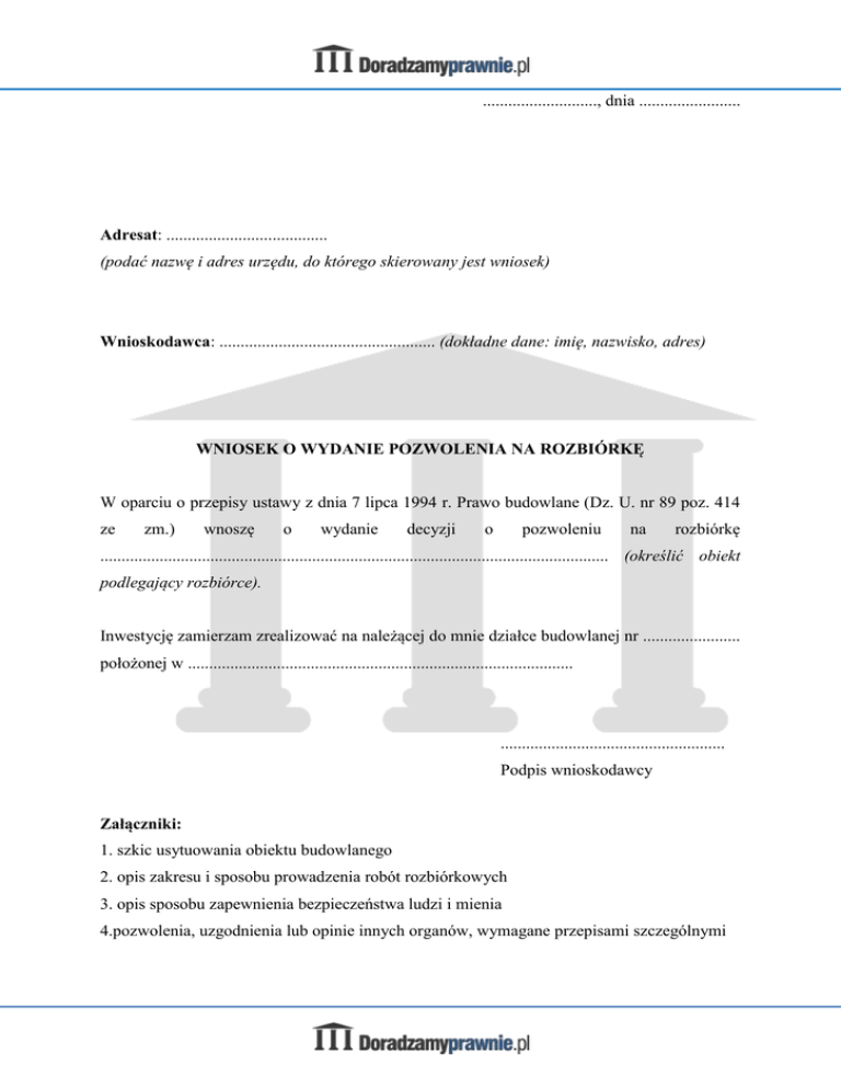 ..........................., dnia ........................ Adresat: ...................................... (podać nazwę i adres urzędu, do którego skierowany jest wniosek) Wnioskodawca: ................................................... (dokładne dane: imię, nazwisko, adres) WNIOSEK O WYDANIE POZWOLENIA NA ROZBIÓRKĘ W oparciu o przepisy ustawy z dnia 7 lipca 1994 r. Prawo budowlane (Dz. U. nr 89 poz. 414 ze zm.) wnoszę o wydanie decyzji o pozwoleniu na rozbiórkę ........................................................................................................................ (określić obiekt podlegający rozbiórce). Inwestycję zamierzam zrealizować na należącej do mnie działce budowlanej nr ....................... położonej w ........................................................................................... ..................................................... Podpis wnioskodawcy Załączniki: 1. szkic usytuowania obiektu budowlanego 2. opis zakresu i sposobu prowadzenia robót rozbiórkowych 3. opis sposobu zapewnienia bezpieczeństwa ludzi i mienia 4.pozwolenia, uzgodnienia lub opinie innych organów, wymagane przepisami szczególnymi