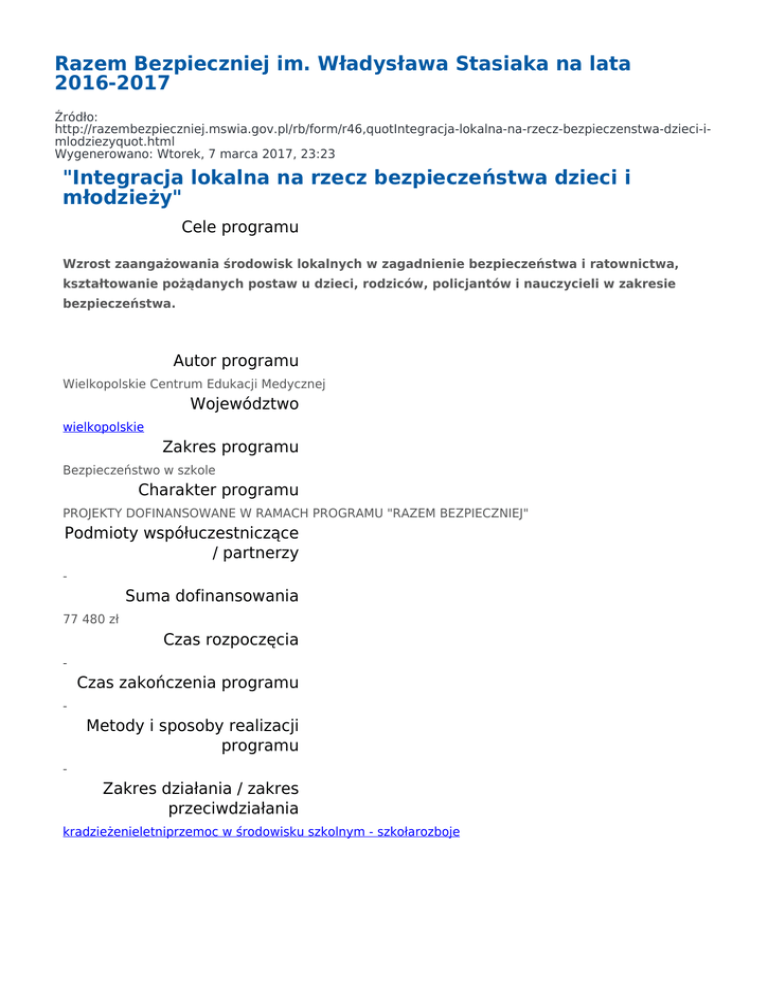 Razem Bezpieczniej im. Władysława Stasiaka na lata 2016-2017 Źródło: http://razembezpieczniej.mswia.gov.pl/rb/form/r46,quotIntegracja-lokalna-na-rzecz-bezpieczenstwa-dzieci-imlodziezyquot.html Wygenerowano: Wtorek, 7 marca 2017, 23:23 "Integracja lokalna na rzecz bezpieczeństwa dzieci i młodzieży" Cele programu Wzrost zaangażowania środowisk lokalnych w zagadnienie bezpieczeństwa i ratownictwa, kształtowanie pożądanych postaw u dzieci, rodziców, policjantów i nauczycieli w zakresie bezpieczeństwa. Autor programu Wielkopolskie Centrum Edukacji Medycznej Województwo wielkopolskie Zakres programu Bezpieczeństwo w szkole Charakter programu PROJEKTY DOFINANSOWANE W RAMACH PROGRAMU "RAZEM BEZPIECZNIEJ" Podmioty współuczestniczące / partnerzy - Suma dofinansowania 77 480 zł Czas rozpoczęcia - Czas zakończenia programu - Metody i sposoby realizacji programu - Zakres działania / zakres przeciwdziałania kradzieżenieletniprzemoc w środowisku szkolnym - szkołarozboje