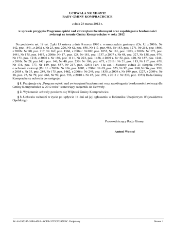 UCHWAŁA NR XII/69/12 RADY GMINY KOMPRACHCICE z dnia 28 marca 2012 r. w sprawie przyjęcia Programu opieki nad zwierzętami bezdomnymi oraz zapobiegania bezdomności zwierząt na terenie Gminy Komprachcice w roku 2012 Na podstawie art. 18 ust. 2 pkt 15 ustawy z dnia 8 marca 1990 r. o samorządzie gminnym (Dz. U. z 2001r. Nr 142, poz. 1591, z 2002 r. Nr 23, poz. 220, Nr 62, poz. 558, Nr 113, poz. 984, Nr 153, poz. 1271, Nr 214, poz. 1806, z 2003r. Nr 80, poz. 717, Nr 162, poz. 1568, z 2004 r. Nr102, poz. 1055, Nr 116, poz. 1203, z 2005r. Nr 172, poz. 1441, Nr 175, poz. 1457, z 2006r. Nr 17 , poz. 128, Nr 181, poz. 1337, z 2007 r. Nr 48, poz. 327, Nr 138, poz. 974, Nr 173, poz. 1218, z 2008 r. Nr 180, poz. 1111, Nr 223, poz. 1458, z 2009 r. Nr 52, poz. 420, Nr 157, poz. 1241, z 2010r. Nr 28, poz.142 i poz. 146, Nr 40, poz. 230 i Nr 106, poz. 675, z 2011r. Nr 21, poz. 113, Nr 117, poz. 679, Nr 134, poz. 777, Nr 149, poz. 887, Nr 217, poz. 1281) i art. 11a ust. 1-5ustawy z dnia 21 sierpnia 1997r. o ochronie zwierząt (Dz. U. z 2003r. Nr 106, poz. 1002, z 2004r. Nr 69, poz. 625, Nr 92, poz. 880, Nr 96, poz. 959, z 2005 r. Nr 33, poz. 289, Nr 175, poz. 1462, z 2006 r. Nr 249, poz. 1830, z 2008 r. Nr 199, poz. 1227, z 2009 r. Nr 18, poz. 97, Nr 79, poz. 668, Nr 92, poz. 753, z 2010 r. Nr 47, poz. 278, z 2011 r. Nr 230, poz. 1373) Rada Gminy Komprachcice uchwala co następuje: § 1. Przyjmuje się „Program opieki nad zwierzętami bezdomnymi oraz zapobiegania bezdomności zwierząt dla Gminy Komprachcice w 2012 roku” stanowiący załącznik do Uchwały. § 2. Wykonanie uchwały powierza się Wójtowi Gminy Komprachcice. § 3. Uchwała wchodzi w życie po upływie 14 dni od jej ogłoszenia w Dzienniku Urzędowym Województwa Opolskiego Przewodniczący Rady Gimny Antoni Wencel ————————————————————————————————————————————————————————— Id: 6AC63332-50E6-438A-ACEB-3257CD393E1C. Podpisany Strona 1 Załącznik do Uchwały Nr XII/69/12 Rady Gminy Komprachcice z dnia 28 marca 2012 r. PROGRAM OPIEKI NAD ZWIERZĘTAMI BEZDOMNYMI ORAZ ZAPOBIEGANIA BEZDOMNOŚCI ZWIERZĄT DLA GMINY KOMPRACHCICE Wprowadzenie Program opieki nad zwierzętami bezdomnymi oraz zapobiegania bezdomności zwierząt na terenie gminy Komprachcice, ma zastosowanie do wszystkich zwierząt domowych, w szczególności psów i kotów, w tym kotów wolno żyjących oraz zwierząt gospodarskich znajdujących się na terenie gminy Komprachcice. Rozdział 1. Postanowienia ogólne § 1. Ilekroć w Programie jest mowa o: 1) schronisku dla bezdomnych zwierząt – należy przez to rozumieć Schronisko , z którym firma GABI” Gabriela Bartoszek z siedzibą w Żędowicach, ul. Dworcowa 24 ma podpisaną umowę i do którego zwierzęta będą przekazywane. 2) Programie – należy przez to rozumieć Program opieki nad zwierzętami bezdomnymi oraz zapobiegania bezdomności zwierząt na terenie gminy Komprachcice w 2012roku. § 2. Koordynatorem Programu jest Wójt Gminy Komprachcice przy pomocy Referatu Budownictwa, Gospodarki Gruntami i Rolnictwa. § 3. Realizatorami Programu są: 1) Wójt Gminy Komprachcice przy pomocy Referatu Budownictwa, Gospodarki Gruntami i Rolnictwa; 2) organizacje pozarządowe, których celem statutowym jest ochrona zwierząt, współpracujące z Gminą Komprachcice; 3) schronisko dla bezdomnych zwierząt. Rozdział 2. Cel Programu § 4. Celem Programu jest zapewnienie opieki nad zwierzętami bezdomnymi oraz zapobieganie bezdomności zwierząt. Rozdział 3. Zadania objęte programem i ich realizacja § 5. 1. W celu zapewnienia opieki nad zwierzętami bezdomnymi przewiduje się w 2012 roku realizację następujących zadań: 1) zapewnienie bezdomnym zwierzętom miejsca w schronisku dla zwierząt; 2) opiekę nad wolno żyjącymi kotami, w tym ich dokarmianie; 3) odławianie bezdomnych zwierząt; 4) obligatoryjną sterylizację albo kastrację zwierząt w schroniskach dla zwierząt; 5) poszukiwanie właścicieli dla bezdomnych zwierząt; 6) usypianie ślepych miotów; 7) wskazanie gospodarstwa rolnego w celu zapewnienia miejsca dla zwierząt gospodarskich; ————————————————————————————————————————————————————————— Id: 6AC63332-50E6-438A-ACEB-3257CD393E1C. Podpisany Strona 1 8) zapewnienie całodobowej opieki weterynaryjnej w przypadkach zdarzeń drogowych z udziałem zwierząt. 2. Program obejmuje także plan znakowania zwierząt w gminie. § 6. Zapewnienie bezdomnym zwierzętom miejsca w schronisku dla zwierząt 1. Bezdomnym zwierzętom z terenu Gminy Komprachcice zapewnia się za pośrednictwem Przedsiębiorstwa Usług Produkcyjno Handlowo-Wielobranżowych „GABI” Gabriela Bartoszek z siedzibą w Żędowicach, ul. Dworcowa 24, miejsca w schronisku dla bezdomnych zwierząt. 2. Gmina umożliwia tymczasową opiekę i zapewnia leczenie weterynaryjne zwierząt, które w wyniku wypadków losowych (zgon właściciela, długotrwały pobyt w szpitalu, itp.) utraciły czasowo właściciela. Zwierzęta będą przekazywane pod opiekę do wytypowanego weterynarza na okres nieobecności właściciela zwierzęcia. Koszt utrzymania zwierzęcia za ten okres będzie ponoszony przez Gminę. § 7. Opieka nad wolno żyjącymi kotami, w tym ich dokarmianie 1. Koty wolno żyjące nie są zwierzętami bezdomnymi, w związku z tym, nie wolno ich wywozić, ani utrudniać im bytowania w danym miejscu. 2. Gmina otoczy opieką wolno żyjące koty, pozostawiając je jednocześnie na wolności. Opieka będzie polegać przede wszystkim na dokarmianiu takich kotów w miejscu ich bytowania. 3. Ponadto Gmina w swoich działaniach, w zależności od posiadanych środków finansowych, uwzględni sterylizację i kastrację dojrzałych płciowo osobników, co przyczyni się do ograniczenia populacji tych zwierząt. 4. Zabiegi takie wykony