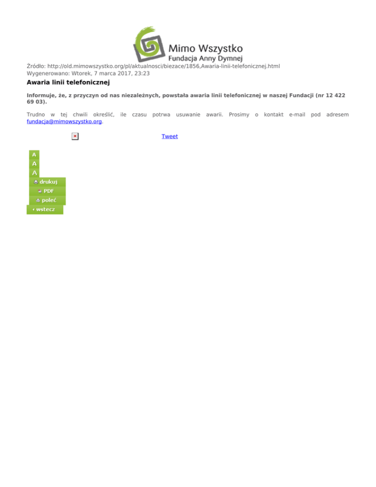 Źródło: http://old.mimowszystko.org/pl/aktualnosci/biezace/1856,Awaria-linii-telefonicznej.html Wygenerowano: Wtorek, 7 marca 2017, 23:23 Awaria linii telefonicznej Informuje, że, z przyczyn od nas niezależnych, powstała awaria linii telefonicznej w naszej Fundacji (nr 12 422 69 03). Trudno w tej chwili określić, [email protected]. ile czasu potrwa usuwanie Tweet awarii. Prosimy o kontakt e-mail pod adresem