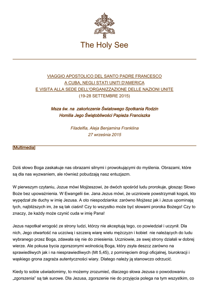 The Holy See VIAGGIO APOSTOLICO DEL SANTO PADRE FRANCESCO A CUBA, NEGLI STATI UNITI D'AMERICA E VISITA ALLA SEDE DELL'ORGANIZZAZIONE DELLE NAZIONI UNITE (19-28 SETTEMBRE 2015) Msza św. na zakończenie Światowego Spotkania Rodzin Homilia Jego Świątobliwości Papieża Franciszka Filadelfia, Aleja Benjamina Franklina 27 września 2015 [Multimedia] Dziś słowo Boga zaskakuje nas obrazami silnymi i prowokującymi do myślenia. Obrazami, które są dla nas wyzwaniem, ale również pobudzają nasz entuzjazm. W pierwszym czytaniu, Jozue mówi Mojżeszowi, że dwóch spośród ludu prorokuje, głosząc Słowo Boże bez upoważnienia. W Ewangelii św. Jana Jezus mówi, że uczniowie powstrzymali kogoś, kto wypędzał złe duchy w imię Jezusa. A oto niespodzianka: zarówno Mojżesz jak i Jezus upominają tych, najbliższych im, że są tak ciaśni! Czy to wszystko może być słowami proroka Bożego! Czy to znaczy, że każdy może czynić cuda w imię Pana! Jezus napotkał wrogość ze strony ludzi, którzy nie akceptują tego, co powiedział i uczynił. Dla nich, Jego otwartość na uczciwą i szczerą wiarę wielu mężczyzn i kobiet nie należących do ludu wybranego przez Boga, zdawała się nie do zniesienia. Uczniowie, ze swej strony działali w dobrej wierze. Ale pokusa bycia zgorszonymi wolnością Boga, który zsyła deszcz zarówno na sprawiedliwych jak i na niesprawiedliwych (Mt 5,45), z pominięciem drogi oficjalnej, biurokracji i wąskiego grona zagraża autentyczności wiary. Dlatego należy ją stanowczo odrzucić. Kiedy to sobie uświadomimy, to możemy zrozumieć, dlaczego słowa Jezusa o powodowaniu „zgorszenia” są tak surowe. Dla Jezusa, zgorszenie nie do przyjęcia polega na tym wszystkim, co 2 załamuje i niszczy naszą ufność w działanie Ducha Świętego! Ojciec nasz będzie niedościgły w wielkoduszności i nadal rozsypuje ziarna. Rozrzuca On ziarno swojej obecności w naszym świecie, ponieważ „w tym przejawia się miłość, że nie my umiłowaliśmy Boga, ale że On sam nas umiłował” jako pierwszy (1 J 4,10). Ta miłość daje nam głęboką pewność: Bóg nas poszukuje, On na nas czeka. To ta ufność sprawia, że uczniowie zachęcają, wspierają i pielęgnują dobre rzeczy dziejące się wokół nich. Bóg chce, aby wszystkie Jego dzieci miały udział w uczcie Ewangelii. Jezus mówi: „Nie powstrzymuj niczego, co jest dobre, a przeciwnie pomóż mu wzrastać!”. Podnoszenie wątpliwości co do działania Ducha Świętego, stwarzanie wrażenia, że nie może ono mieć miejsca w tych, którzy nie należą do „naszej grupy”, którzy nie są „tacy, jak my” to niebezpieczna pokusa. Nie tylko blokuje ona nawrócenie na wiarę, ale stanowi wypaczenie wiary! Wiara otwiera „okno” na obecność i działanie Ducha Świętego. Pokazuje to nam, że, podobnie jak szczęście, świętość jest zawsze związana z małymi gestami. „Kto wam poda kubek wody – mały gest - w imię moje, nie utraci swojej nagrody”, mówi Jezus (por. Mk 9,41). Tych małych gestów uczymy się w domu, w rodzinie; gubią się one pośród wszystkich innych rzeczy, jakie robimy, ale sprawiają, że zmianie ulega dzień powszedni. Są to ciche rzeczy dokonywane przez matki i babki, przez ojców i dziadków, przez dzieci, przez braci. Są to małe oznaki czułości, miłości i współczucia. Jak ciepła kolacja, na jaką cieszymy się wieczorem, wczesny obiad czekający na kogoś, kto wstaje wcześnie, aby iść do pracy. Swojskie gesty. Jak błogosławieństwo zanim położymy się spać czy też uścisk, gdy wracamy po ciężkim dniu pracy. Miłość ukazuje się w małych rzeczach, przez dbałość o małe codzienne znaki, które sprawiają, że życie ma zawsze posmak domu. Wiara wzrasta, gdy jest przeżywana i ukształtowana przez miłość. Dlatego nasze rodziny, nasze domy, są prawdziwymi Kościołami domowymi. Są miejscami właściwymi dla wiary, w których wiara staje się życiem, a życie rozwija się w wierze. Jezus każe nam nie powstrzymywać tych małych cudów. Wręcz przeciwnie, chce abyśmy do nich zachęcali, upowszechniali je. Prosi nas, abyśmy szli przez życie, przez nasze codzienne życie zachęcając do tych wszystkich małych oznak miłości jako znaków Jego życia i czynnej obecności w naszym świecie. Ta postawa, do której jesteśmy zachęcani prowadzi nas do tego, abyśmy dziś tutaj, na zakończenie tego święta, postawili sobie pytanie: jak staramy się żyć tym stylem w naszych domach, w naszych społeczeństwach? Jaki świat chcemy pozostawić naszym dzieciom (por. Laudato si’, 160)? Nie możemy odpowiedzieć na te pytania sami, o własnych siłach. To Duch Święty wzywa nas do odpowiedzi jako części wielkiej rodziny ludzkiej. Nasz wspólny dom nie może dłużej tolerować sterylnych podziałów. Pilne wyzwanie ochrony naszego domu obejmuje staranie, aby połączyć całą rodzinę ludzką w dążeniu do zrównoważonego i integralnego rozwoju, bo wiemy, że wszystko może się zmienić (por. tamże, 13). Oby nasze dzieci znalazły w nas wzorce i pobudki do komunii, a nie do podziałów! Niech nasze dzieci znajdują w nas mężczyzn i 3 kobiety zdolnych, by dołączyć do innych w doprowadzeniu do pełnego rozkwitu wszystkich dobrych ziaren, które zasiał Ojciec! Jezus mówi nam dobitnie, ale z miłością: „Jeśli więc wy, choć źli jesteście, umiecie dawać dobre dary swoim dzieciom, o ileż bardziej Ojciec z nieba da Ducha Świętego tym, którzy Go proszą” (Łk 11,13 ). Ile mądrości jest w tych kilku słowach! To prawda, że, jeśli chodzi o dobroć i czystość serca, to my ludzie nie mamy wiele do ukazania! Lecz Jezus wie, że tam, gdzie chodzi o dzieci jesteśmy zdolni do bezgranicznej ofiarności. Zatem zapewnia nas: jeśli tylko mamy wiarę, to Ojciec da nam swego Ducha. My, chrześcijanie, uczniowie Pana, prosimy narody świata, aby nam pomogły! Jak wielu jest nas tutaj, na tej celebracji! A to już
