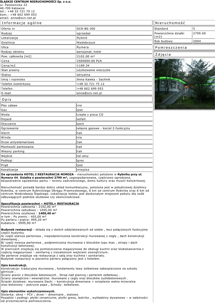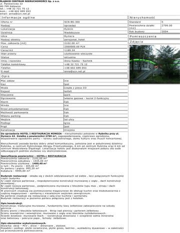ŚLĄSKIE CENTRUM NIERUCHOMOŚCI Sp. z o.o. ul. Panewnicka 22 40-709 Katowice tel.: +48 32 721 75 12 kom.: +48 602 699 053 email: [email protected] Informacje ogólne Nieruchomość Oferta nr SCN-BS-300 Standard 5 Rodzaj sprzedaż 2799.00 Lokalizacja Rybnik Powierzchnia działki [m2] Dzielnica Niedobczyce Rok budowy 2004 Ulica Rymera Pomieszczenia Rodzaj obiektu pensjonat_hotel Pow. całkowita [m2] 2102.00 m² Cena 2500000.00 PLN Cena/m2 1189.34 Stan prawny użytkowanie wieczyste Status aktualna Imię i nazwisko Anna Kawka - Sachnik Telefon komórkowy +48 32 721 75 12 Telefon +48 602 699 053 E-mail [email protected] Opis Plac zabaw nie Gaz jest Woda ciepła z pieca CO Dojazd asfalt Otoczenie park Ogrzewanie własne gazowe - kocioł 2-funkcyjny Alarm tak Winda nie Drzwi antywłamaniowe tak Możliwość parkowania tak Własny parking tak Wejście od ulicy Podłogi gres Prąd jest Kanalizacja miejska Do sprzedania HOTEL I RESTAURACJA MIMOZA - nieruchomości położone w Rybniku przy ul. Rymera 44. Działka o powierzchni 2799 m², zagospodarowana, częściowo ogrodzona, bezpośrednie sąsiedztwo parku – terenu zadrzewionego, domu kultury oraz muszli koncertowej. Nieruchomość posiada bardzo dobry układ komunikacyjny, położona jest w południowej dzielnicy Rybnika, w centrum Rybnickiego Okręgu Przemysłowego, 6 km od centrum Rybnika oraz 6 km od centrum Wodzisławia Śląskiego. Lokalizacja hotelu jest doskonałym miejscem pobytu dla osób odbywających podróże służbowe czy okolicznościowe. Specyfikacja powierzchni – HOTEL+ RESTAURACJA Powierzchnia całkowita : 2102,00 m² Powierzchnia zabudowy : 1045,00 m² Powierzchnia użytkowa : 1400,40 m² w tym : Pu piwnic : 405,00 m² Pu parteru i piętra: 995,20 m² Kubatura : 5995,00 m³ Budynek restauracji - składa się z dwóch oddylatowanych od siebie , lecz połączonych funkcyjnie części budynku A/ część starsza parterowa , niepodpiwniczona konstrukcji murowanej z cegły , dach konstrukcji drewnianej , B/ część nowsza parterowa , podpiwniczona murowana z bloczków typu max , stropy i dach konstrukcji betonowej. W piwnicach znajdują się pomieszczenia magazynowe do obsługi kuchni oraz klubokawiarnia z częścią magazynowo - sanitarną z niezależnym wejściem zewnętrznym. Na parterze znajduje się restauracja z salą oraz kuchnia i sanitariaty. Budynek restauracji w poziomie parteru połączony jest z hotelem. Opis konstrukcji. Konstrukcja: tradycyjna murowana , fundamenty ławy żelbetowe zabezpieczone na szkody górnicze . Ściany piwnic z bloczków betonowych . Strop nad piwnicą i parterem żelbetowy . Ściany zewnętrzne i wewnętrzne: murowane z cegły oraz bloczków żużlobetonowych . Ścianki działowe: murowane Dach: - konstrukcja drewniana + ocieplenie wełna mineralna oraz betonowy - pokrycie papa , Schody: żelbetowe. Opis elementów wykończeniowych. Stolarka: okna – PCV ; drzwi – drewniane , stalowe. Posadzki i podłogi: płytki ceramiczne, płytki gress, lastriko , wykładziny dywanowe – w zależności od przeznaczenia pomieszczenia. Zdjęcia Tynki wewnętrzne: cementowo – wapienne , gipsowe, sufity - płyty GK, okładziny ceramiczne. Elewacja: ocieplenie styropian + tynki akrylowy . Obróbki blacharskie – blacha stalowa ocynkowana powlekana. Instalacje: elektryczna , wodna (z sieci), kanalizacyjna (sanitarna i deszczowa), gazowa, centralnego ogrzewania , klimatyzacyjna i wentylacyjna (mechaniczna i grawitacyjna), telefoniczna i teletechniczna, w piwnicy wymiennik ciepła . Budynek po rozbudowie i modernizacji w 1999r. Stan techniczny dobry. Budynek hotelu jest obiektem połączonym z budynkiem restauracji . To obiekt podpiwniczony , dwupiętrowy . W budynku hotelu na parterze znajduje się recepcja , na parterze oraz piętrach 23 pokoje z łazienkami w tym 2 pokoje o podwyższonym standardzie. W pokojach znajdują się telefony oraz odbiorniki TV SAT. W pokojach na parterze dostęp do Internetu. W piwnicach zaplecze magazynowo – socjalne . Opis konstrukcji. Konstrukcja: tradycyjna murowana , fundamenty ławy żelbetowe zabezpieczone na szkody górnicze . Ściany piwnic z bloczków betonowych. Stropy TERIVA. Ściany zewnętrzne i wewnętrzne: murowane z bloczków żużlobetonowych oraz gazobetonowych. Ścianki działowe: murowane z bloczków żużlobetonowych oraz gazobetonowych . Dach: -konstrukcja drewniana na stropie TERIVA - pokrycie papa . Schody: żelbetowe obłożone płytkami ceramicznymi . Opis elementów wykończeniowych. Stolarka: okna – PCV , aluminium ; drzwi – drewniane , stalowe , aluminium. Posadzki i podłogi: płytki ceramiczne, płytki gress, granit , wykładziny dywanowe – w zależności od przeznaczenia pomieszczenia. Tynki wewnętrzne: cementowo – wapienne , gipsowe, sufity - płyty GK, okładziny ceramiczne. Elewacja: ocieplenie styropian + tynki akrylowy . Obróbki blacharskie – blacha stalowa ocynkowana powlekana. Instalacje: elektryczna , wodna (z sieci), kanalizacyjna (sanitarna i deszczowa), gazowa, centralnego ogrzewania , klimatyzacyjna i wentylacyjna (mechaniczna i grawitacyjna), telefoniczna i teletechniczna, odgromową . Rok budowy 2004r. Stan techniczny dobry. PRZEZNACZENIE W PLANIE ZAGOSPODAROWANIA PRZESTRZENNEGO RYBNIKA Zgodnie z miejscowym planem zagospodarowania przestrzennego Miasta Rybnika uchwalonym Uchwałą Nr 545/XXXV/2005 Rady Miasta Rybnika z dnia 25 maja 2005 r. w sprawie uchwalenia miejscowego planu zagospodarowania przestrzennego miasta Rybnika. (Dz. Urz. Woj. Śl. Nr 79, poz. 2145 z 2005r. ) nieruchomość położona jest w terenach o symbolu: P 30 ZP - tereny zieleni parkowej Zapraszam do współpracy. Mapa ŚLĄSKIE CENTRUM NIERUCHOMOŚCI Sp. z o.o. ul. Panewnicka 22 40-709 Katowice tel.: +48 32 721 75 12 kom.: +48 602 699 053 email: [email protected]