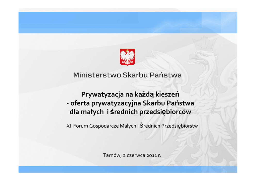 Prywatyzacja na każdą kieszeń - oferta prywatyzacyjna Skarbu Państwa dla małych i średnich przedsiębiorców XI Forum Gospodarcze Małych i Średnich Przedsiębiorstw Tarnów, 2 czerwca 2011 r. Prywatyzacja – cele i znaczenie dla gospodarki Prywatyzacja – to, obok nadzoru właścicielskiego i gospodarowania majątkiem SP, jedno z głównych zadań Ministra Skarbu Państwa Podstawowym celem prywatyzacji jest realizacja interesu Skarbu Państwa i spółek, rozumiana jako ścisła relacja pomiędzy prywatyzacją a zapewnieniem rozwoju i dalszego funkcjonowania spółek. Znaczenie dla gospodarki: •tworzenie efektywnego i elastycznego sektora prywatnego, • zmniejszenie roli państwa w gospodarce i odpolitycznienie organów spółek, • wzrost efektywności przedsiębiorstw, • przyciąganie nowych inwestycji, wspieranie nowych przedsięwzięć, • rozwój rynku kapitałowego, • utrzymanie wzrostu gospodarczego i zwiększenie konkurencyjności gospodarki, 2 Jak prywatyzujemy? – tryby prywatyzacji Tryby prywatyzacji określa ustawa o komercjalizacji i prywatyzacji Prywatyzacja Prywatyzacja pośrednia Prywatyzacja bezpośrednia • sprzedaż przedsiębiorstwa, • wniesienie przedsiębiorstwa do spółki, • oddanie przedsiębiorstwa do nieodpłatnego korzystania. 3 Jak prywatyzujemy? – tryby prywatyzacji Najczęściej stosowane tryby prywatyzacji to: aukcja ogłoszona publicznie, przetarg publiczny, negocjacje podjęte na podstawie publicznego zaproszenia. Aukcja ogłoszona publicznie Po publikacji ogłoszenia o aukcji potencjalni inwestorzy mają możliwość zapoznania się z wymogami oraz informacjami dotyczącym spółki Potencjalni inwestorzy składają pisemne zgłoszenie do udziału w aukcji wraz z potwierdzeniem wpłacenia wadium ( od 1 % do 10% ceny wywoławczej) W trakcie aukcji dopuszczone podmioty zgłaszają minimalne postąpienia, a po trzykrotnym wywołaniu najwyższej ceny, przewodniczący aukcji ogłasza uczestnika, który wylicytował najwyższą cenę Przybicie następuje z chwilą zawarcia umowy sprzedaży Przetarg publiczny Po publikacji ogłoszenia o przetargu potencjalni inwestorzy, po podpisaniu zobowiązania do zachowania poufności, zapoznają się z wymogami oraz informacjami dotyczącym spółki (wydawanie memorandum) Potencjalni inwestorzy składają pisemne oferty wraz z potwierdzeniem wpłacenia wadium (od 1% do 10% ceny minimalnej) Komisja powołana przez Ministra Skarbu Państwa w części jawnej otwiera złożone oferty, a następnie w części niejawnej – dokonuje oceny oraz wyboru najkorzystniejszej oferty 4 Jak prywatyzujemy? – tryby prywatyzacji Negocjacje podjęte na podstawie publicznego zaproszenia Potencjalni inwestorzy zapraszani są do podjęcia negocjacji na podstawie publicznego zaproszenia Po podpisaniu zobowiązania do zachowania poufności, potencjalni inwestorzy zapoznają się z memorandum informacyjnym o spółce (zawiera poufne informacje o sytuacji prawnej i ekonomiczno-finansowej spółki) Oferenci składają pisemne odpowiedzi na zaproszenie do negocjacji (oferty wstępne) Po wstępnej ocenie ofert, podmioty dopuszczone do negocjacji mogą przeprowadzić badanie dokumentów spółki i jej przedsiębiorstwa (warunki dopuszczenia do badania i termin jego wykonania określa zbywca) Następnie prowadzone są negocjacje, a po ich zakończeniu potencjalni inwestorzy przedstawiają wiążące propozycje warunków sprzedaży Umowa sprzedaży zawierana jest z oferentem, który złożył najkorzystniejszą ofertę, w szczególności dotyczącą ceny za akcje Tryb stosowany do prywatyzacji średnich i dużych spółek, których pakiety kontrolne zbywane są na rzecz inwestorów strategicznych 5 Realizacja procesów prywatyzacji • Od roku 1990 do końca 2010 5975 przedsiębiorstw państwowych zostało objętych przekształceniami własnościowymi, a w 1178 jednoosobowych spółkach Skarbu Państwa udostępniono akcji/udziały • W obecnej kadencji Rządu zrealizowano już ponad 1000 projektów prywatyzacyjnych, z czego sukcesem zakończono ponad 500 z nich • Przychody z prywatyzacji wyniosły niemal 33 mld zł. Natomiast od początku transformacji, łączne przychody z prywatyzacji zbliżają się do 127 mld zł • W 2011 r. zaplanowano uzyskanie przychodów z prywatyzacji podmiotów z udziałem Skarbu Państwa na poziomie 15 mld zł 6 Realizacja procesów prywatyzacji Celem działań prywatyzacyjnych jest nie tylko kreowanie przychodów z prywatyzacji, ale przede wszystkim znalezienie inwestorów dla jak największej liczby spółek, zwłaszcza małych i średnich przedsiębiorstw, którzy zapewnią dalszy rozwój prywatyzowanym podmiotom. W 2010 r. spośród 160 zawartych umów prywatyzacyjnych, ponad 75,63% stanowiły tzw. „małe projekty”, czyli projekty prywatyzacyjne, których wartość umowy nie przekracza 20 mln zł Projekty prywatyzacyjne zakończonych sukcesem w 2010 r. wg wartości zawartych umów w ujęciu ilości zrealizowanych projektów 7 Prywatyzacja w Tarnowie ABM SOLID S.A. Regionalne Laboratorium Oceny Mleka Sp. z o.o. •Data sprzedaży: 3 marca 2006 r. •% zbytych akcji Skarbu Państwa: 0,07 % •Branża: budownictwo •Wartość transakcji: 11 398,5 0 zł •Tryb prywatyzacji: zgoda Rady Ministrów •Inwestor: indywidualny – osoba fizyczna •Data sprzedaży: 29 lipca 2009 r. •% zbytych udziałów Skarbu Państwa: 91,33% •Branża: przemysł spożywczy •Wartość transakcji: 312 228,00 zł •Tryb prywatyzacji: aukcja ogłoszona publicznie •Inwestor: Jednostka Ratownictwa Chemicznego Sp. z o.o. z siedzibą w Tarnowie •Data sprzedaży: 4 transakcje - 17 maja 2007 r., 16 września 2008 r., 10 września 2009 r., 16 marca 2010 r. Przedsiębiorstwo •% zbytych akcji Skarbu Państwa: łącznie 26,74 % Przemysłu Chłodniczego •Branża: przemysł spożywczy Fritar S.A. •Wartość transakcji: łącznie 460 465,68 zł •Tryb prywatyzacji: zgoda Rady Ministrów/realizacja zapisów um