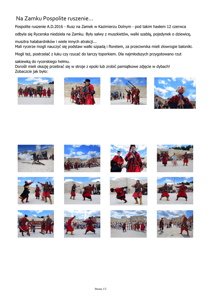 Na Zamku Pospolite ruszenie... Pospolite ruszenie A.D.2016 - Rusz na Zamek w Kazimierzu Dolnym - pod takim hasłem 12 czerwca odbyła się Rycerska niedziela na Zamku. Były salwy z muszkietów, walki szablą, pojedynek o dziewicę, musztra halabardników i wiele innych atrakcji... Mali rycerze mogli nauczyć się podstaw walki szpadą i floretem, za przeciwnika mieli złowrogie baloniki. Mogli też, postrzelać z łuku czy rzucać do tarczy toporkiem. Dla najmłodszych przygotowano rzut sakiewką do rycerskiego hełmu. Dorośli mieli okazję przebrać się w stroje z epoki lub zrobić pamiątkowe zdjęcie w dybach! Zobaczcie jak było: Strona 1/2 Strona 2/2 Powered by TCPDF (www.tcpdf.org)