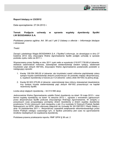 kwietnia 2012 roku Zwyczajne Walne Zgromadzenie Spółki podjęło uchwałę w sprawie