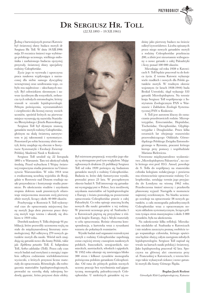 PRZYRODNICY DR SERGIUSZ HR. TOLL (22.XI.1893 – 19.XII.1961) Jedn¹ z barwniejszych postaci Katowic by³ œwiatowej s³awy badacz motyli dr Sergiusz Hr. Toll. W dniu 19.XII.1996 mija 35 rocznica œmierci tego wybitnego polskiego uczonego, wielkiego mi³oœnika i zas³u¿onego badacza ojczystej przyrody, œwiatowej s³awy specjalisty rodziny Coleophoridae. ¯ycie jego to wytrwa³a i uporczywa praca naukowa wyp³ywaj¹ca z narzuconej dla siebie samego dyscypliny wewnêtrznej oraz umi³owania tego, co by³o mu najdro¿sze – ukochanych motyli. By³ cz³owiekiem skromnym i zawsze ¿yczliwym dla wszystkich, zw³aszcza tych m³odych entomologów, którzy stawali w szranki lepidopterologii. Pe³nym poœwiêcenia, wyrozumia³oœci i cierpliwoœci dla licznej rzeszy swoich uczniów, spoœród których na pierwsze miejsce wysuwaj¹ siê nazwiska Stanis³awa B³eszyñskiego i Józefa Razowskiego. Sergiusz Toll by³ s³ynnym znawc¹ gatunków motyli rodziny Coleophoridae, g³oœnym na skalê œwiatow¹ autorytetem w jej taksonomii i systematyce. Pozostawi³ po sobie bezcenny zbiór motyli, który znajduje siê obecnie w Instytucie Systematyki i Ewolucji Zwierz¹t Polskiej Akademii Nauk w Krakowie. Sergiusz Toll urodzi³ siê 22 listopada 1893 r. w Warszawie. Tam te¿ ukoñczy³ szko³ê œredni¹. Przed wybuchem I Wojny œwiatowej rozpoczyna studia prawnicze na Uniwersytecie Warszawskim. W roku 1914 wraz z ewakuowan¹ uczelni¹ wyje¿d¿a do Rosji, gdzie w Rostowie nad Donem studiuje nauki przyrodnicze i kontynuuje studia prawnicze. Po ukoñczeniu studiów i uzyskaniu stopnia doktora nauk prawniczych ofiarowuje miejscowemu muzeum swój pierwszy zbiór motyli, licz¹cy oko³o 40 000 okazów. Przebywaj¹c w Rostowie S. Toll wykorzysta³ czas do opracowania miejscowej fauny motyli. Jego dwie pierwsze prace dotycz¹ motyli tego terenu i ukaza³y siê drukiem w 1919 roku. Dorobek naukowy S. Tolla obejmuje 91 publikacji, które pozwoli³y uczonemu wejœç na sta³e do miêdzynarodowej literatury entomologicznej. By³ odkrywc¹ 279 nowych gatunków motyli dla nauki. Wœród nich znajduj¹ siê gatunki nowe dla fauny Polski, takie jak: Epiblema petasitis Toll, E. baligrodana Toll, Aethes adelaidae (Toll). Przez ca³y czas swych badañ nad motylami z energi¹ i zapa³em odbywa codziennie wielokilometrowe wycieczki, z których przynosi liczne materia³y do opracowania. Równolegle, dla wzbogacenia materia³ów lepidopterologicznych, prowadzi na szerok¹ skalê zakrojon¹ hodowlê g¹sienic, która przynosi du¿e efekty. By³ mistrzem preparacji, wszystkie jego okazy s¹ nienaganne pod tym wzglêdem. Maj¹c og³oszonych drukiem 21 publikacji Sergiusz Toll od roku 1939 poœwiêca siê badaniom gatunków motyli z rodziny Coleophoridae. Badania te, które da³y fantastyczne wyniki, prowadzi przez 23 lata. W pocz¹tkowym okresie badañ S. Toll interesuje siê gatunkami wystêpuj¹cymi w Polsce, lecz mo¿liwoœç uzyskania materia³ów od lepidopterologów z Europy i œwiata pozwalaj¹ na poszerzenie opracowania Coleophoridae prawie z ca³ej Palearktyki. Co roku opisuje znaczn¹ liczbê nowych dla nauki gatunków z tej rodziny. W pracowni uczonego przy ul. Szafranka 1 w Katowicach piêtrz¹ siê przysy³ane z ró¿nych krajów Europy, Azji i Afryki materia³y w celu opracowania. Roœnie obszerna korespondencja, a kartoteka wraz z rysunkami wzrasta do pokaœnych rozmiarów. Wyniki badañ nad organami rozrodczymi motyli z rodziny Coleophoridae zape³niaj¹ coraz czêœciej strony czasopism naukowych polskich, francuskich, szwajcarskich, niemieckich, austriackich, w³oskich i egipskich. W 1952 roku ukazuje siê zawieraj¹ca blisko 300 stron i kilkaset rysunków monografia poœwiêcona polskim gatunkom Coleophoridae. Od rana do póœnych godzin nocnych uczony pracuje bez wytchnienia nad gigantyczn¹ monografi¹ palearktycznych Coleophoridae. U niektórych gatunków tej ro- dziny jako pierwszy badacz na œwiecie odkry³ ¿yworództwo. Liczba opisanych przez niego nowych gatunków motyli z rodziny Coleophoridae przekracza 200, a zbiór jest nieustannie wzbogacany o nowe gatunki z ca³ej Palearktyki i liczy ponad 100 000 okazów. Mieszkaj¹c od roku 1938 w Katowicach S. Toll bêdzie pracowa³ tu do koñca ¿ycia. Z terenu Katowic wykazuje wiele rzadkich i nowych dla Polski gatunków motyli. W trudnym okresie wojennym (w latach 1938-1944) bada Beskid Ustroñski, sk¹d wykazuje 533 gatunki Microlepidoptera. Na terenie kraju Sergiusz Toll wspó³pracuje z Instytutem Zoologicznym PAN w Warszawie i Zak³adem Zoologii Systematycznej PAN w Krakowie. S. Toll jest autorem kluczy do oznaczania przedstawicieli rodzin: Micropterygidae, Eriocraniidae, Hepialidae, Tischeriidae, Oecophoridae, Glyphipterygidae i Douglasiidae. Przez kilka ostatnich lat obejmuje stanowisko przewodnicz¹cego Oddzia³u Górnoœl¹skiego Polskiego Zwi¹zku Entomologicznego w Bytomiu, pracami którego kieruje przy pomocy i wspó³udziale Mariana Bielewicza. Utworzone miêdzynarodowe wydawnictwo „Microlepidoptera Palearctica”, na czele którego stoi prof. H.G. Amsel, powo³uje dr. S. Tolla do wspó³pracy na stanowisko cz³onka kolegium redakcyjnego i powierza mu równoczeœnie opracowanie rodziny Coleophoridae, ustalaj¹c termin jego przyjazdu do Londynu na wiosnê 1962 roku. Przedwczesna œmieræ niweczy i przekreœla planowany wyjazd. Nast¹pi³a w momencie najmniej oczekiwanym. Na biurku uczonego oczekuje na opracowanie 58 nowych gatunków, a ca³a monografia palearktycznych Coleophoridae wraz z opracowanym nowym uk³adem systematycznym, licz¹ca pó³tora tysi¹ca stron maszynopisu i oko³o 5 000 rysunków, by³a na ukoñczeniu. Na zakoñczenie kilka refleksji. Mieszka³em niedaleko ul. Szafranka w Katowicach i nie mia³em zaszczytu poznaç osobiœcie tego wspania³ego cz³owieka, którego spuœcizna bêdzie s³u¿yç ca³ym zastêpom m³odych lepidopterologów. Sergiusz Toll zapisa³ siê trwale na kartach nauki polskiej i œwiatowej. Jako lepidopte