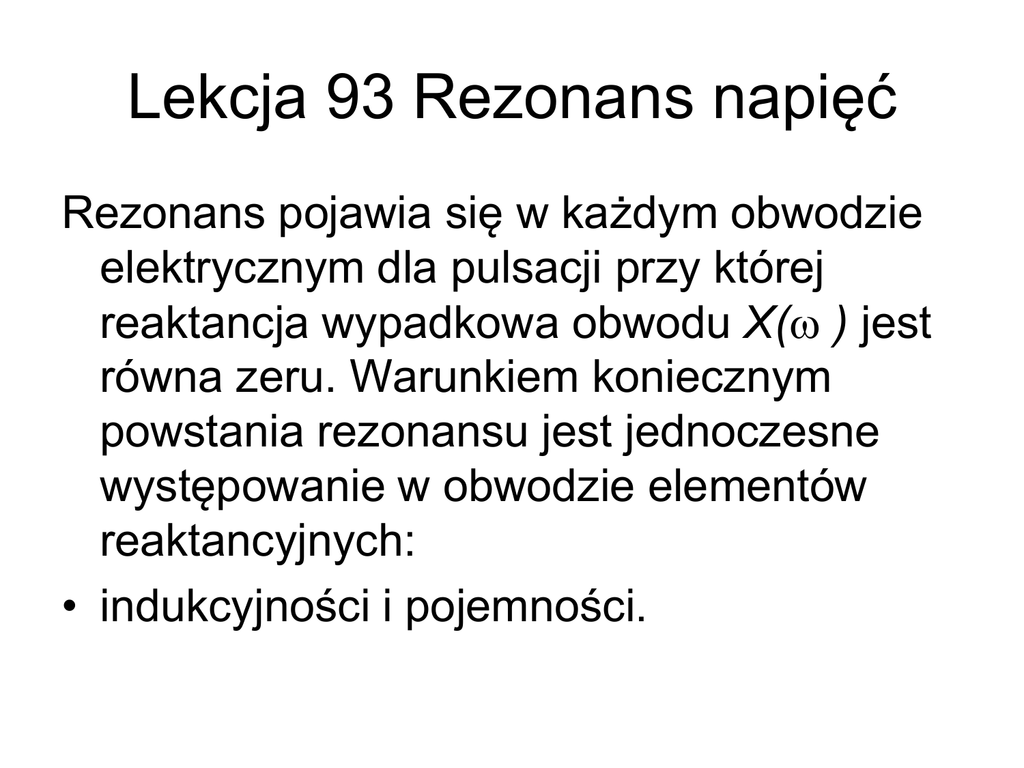 Lekcja 93 Rezonans napięć Rezonans pojawia się w każdym obwodzie elektrycznym dla pulsacji przy której reaktancja wypadkowa obwodu X( ) jest równa zeru. Warunkiem koniecznym powstania rezonansu jest jednoczesne występowanie w obwodzie elementów reaktancyjnych: • indukcyjności i pojemności. Definicja. Rezonans powstający w obwodzie, w którym elementy L i C (oraz dodatkowo R) są połączone szeregowo nazywamy rezonansem szeregowym lub rezonansem napięć. Szeregowy obwód rezonansowy X = XL + XC = 0 W tym przypadku występuje kompensacja reaktancji indukcyjnej XL z reaktancją pojemnościową XC i reaktancja całkowita jest równa zero Częstotliwości (lub pulsacje), przy których zachodzi równość X = XL + XC = 0 nazywamy częstotliwościami (pulsacjami) rezonansowymi. Przy częstotliwości rezonansowej napięcie i prąd na zaciskach obwodu rezonansowego są zgodne w fazie, zatem obwód przyjmuje charakter rzeczywisty. O jakości obwodu rezonansowego mówi współczynnik zwany dobrocią Q Dobrocią obwodu rezonansowego Q nazywamy liczbę proporcjonalną do stosunku energii gromadzonej w elementach reaktancyjnych (energii pola elektrycznego i energii pola magnetycznego) w rezonansie do energii zamienianej na ciepło w czasie okresu przebiegu T Dla dobrego obwodu współczynnik ten powinien przyjmować duże wartości np. kilkaset. W rezonansie napięć istnieje pulsacja 0, przy której X(0) = 0 . Jest nią pulsacja rezonansowa Przy tej pulsacji obwód znajduje się w stanie rezonansu a impedancja ma charakter rzeczywisty o najmniejszym możliwym module W rezonansie reaktancja indukcyjna obwodu równa się co do modułu reaktancji pojemnościowej. Wartość tej reaktancji oznaczamy wspólnym symbolem i nazywamy oporem charakterystycznym. O jakości obwodu rezonansowego decyduje dobroć Q. Dobroć obwodu szeregowego wynosi Badając przebiegi napięć na elementach dla pulsacji rezonansowej 0 otrzymamy Z ostatnich zależności widać, ze w rezonansie całe napięcie zasilające E odkłada się na oporze R, a napięcia na elementach reaktancyjnych działają wzdłuż jednej prostej w przeciwnych kierunkach i mają amplitudy Q razy większe od Em. Ponieważ amplitudy napięć na indukcyjności i pojemności są wielokrotnie większe od Em, to rezonans ten nosi nazwę rezonansu napięć.