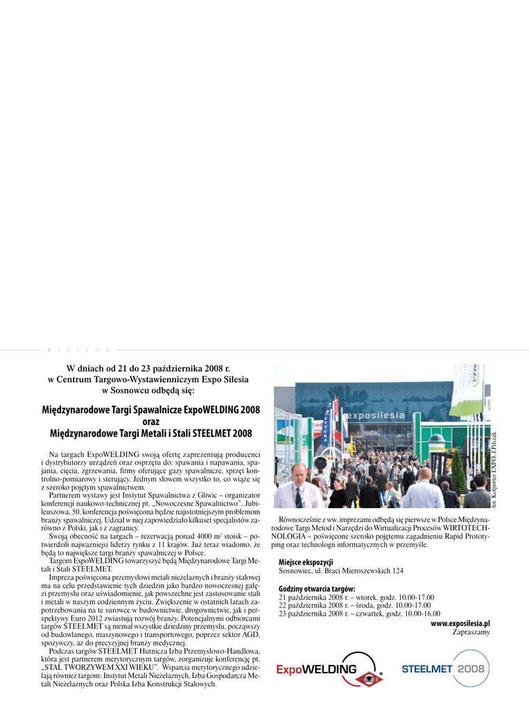 r e k l a m a W dniach od 21 do 23 października 2008 r. w Centrum Targowo-Wystawienniczym Expo Silesia w Sosnowcu odbędą się: Na targach ExpoWELDING swoją ofertę zaprezentują producenci i dystrybutorzy urządzeń oraz osprzętu do: spawania i napawania, spajania, cięcia, zgrzewania, firmy oferujące gazy spawalnicze, sprzęt kontrolno-pomiarowy i sterujący. Jednym słowem wszystko to, co wiąże się z szeroko pojętym spawalnictwem. Partnerem wystawy jest Instytut Spawalnictwa z Gliwic – organizator konferencji naukowo-technicznej pt. „Nowoczesne Spawalnictwo”. Jubileuszowa, 50. konferencja poświęcona będzie najistotniejszym problemom branży spawalniczej. Udział w niej zapowiedziało kilkuset specjalistów zarówno z Polski, jak i z zagranicy. Swoją obecność na targach – rezerwacją ponad 4000 m2 stoisk – potwierdzili najważniejsi liderzy rynku z 11 krajów. Już teraz wiadomo, że będą to największe targi branży spawalniczej w Polsce. Targom ExpoWELDING towarzyszyć będą Międzynarodowe Targi Metali i Stali STEELMET. Impreza poświęcona przemysłowi metali nieżelaznych i branży stalowej ma na celu przedstawienie tych dziedzin jako bardzo nowoczesnej gałęzi przemysłu oraz uświadomienie, jak powszechne jest zastosowanie stali i metali w naszym codziennym życiu. Zwiększenie w ostatnich latach zapotrzebowania na te surowce w budownictwie, drogownictwie, jak i perspektywy Euro 2012 zwiastują rozwój branży. Potencjalnymi odbiorcami targów STEELMET są niemal wszystkie dziedziny przemysłu, począwszy od budowlanego, maszynowego i transportowego, poprzez sektor AGD, spożywczy, aż do precyzyjnej branży medycznej. Podczas targów STEELMET Hutnicza Izba Przemysłowo-Handlowa, która jest partnerem merytorycznym targów, zorganizuje konferencję pt. „STAL TWORZYWEM XXI WIEKU”. Wsparcia merytorycznego udzielają również targom: Instytut Metali Nieżelaznych, Izba Gospodarcza Metali Nieżelaznych oraz Polska Izba Konstrukcji Stalowych. fot. Kolporter EXPO, J.Pilszak Międzynarodowe Targi Spawalnicze ExpoWELDING 2008 oraz Międzynarodowe Targi Metali i Stali STEELMET 2008 Równocześnie z ww. imprezami odbędą się pierwsze w Polsce Międzynarodowe Targi Metod i Narzędzi do Wirtualizacji Procesów WIRTOTECHNOLOGIA – poświęcone szeroko pojętemu zagadnieniu Rapid Prototyping oraz technologii informatycznych w przemyśle. Miejsce ekspozycji Sosnowiec, ul. Braci Mieroszewskich 124 Godziny otwarcia targów: 21 października 2008 r. – wtorek, godz. 10.00-17.00 22 października 2008 r. – środa, godz. 10.00-17.00 23 października 2008 r. – czwartek, godz. 10.00-16.00 www.exposilesia.pl Zapraszamy