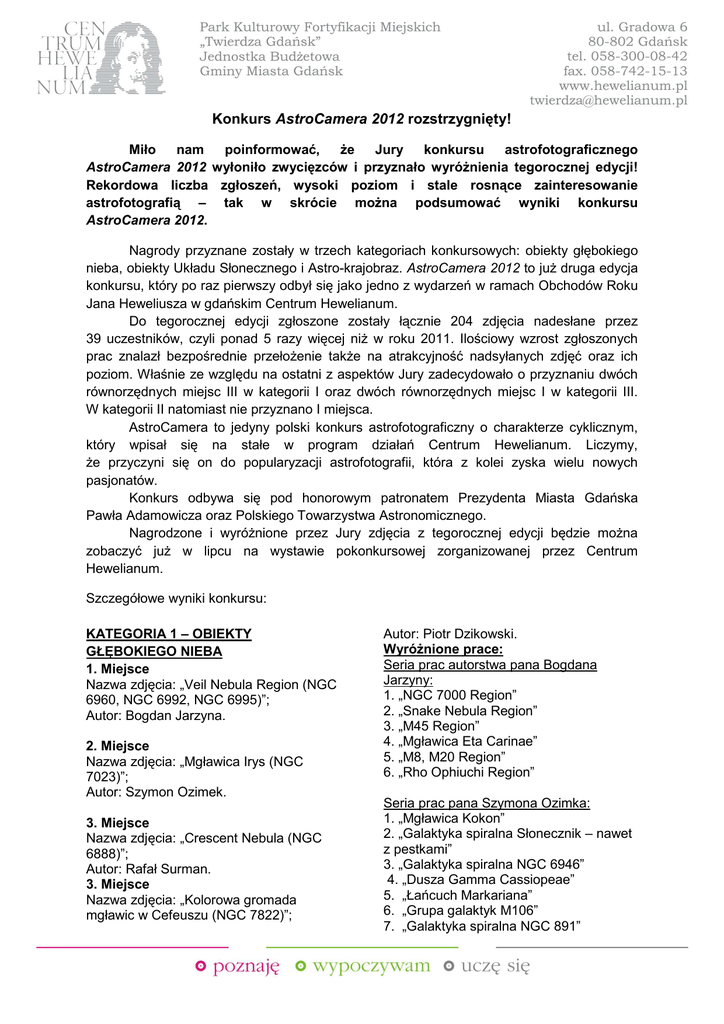 Konkurs AstroCamera 2012 rozstrzygnięty! Miło nam poinformować, że Jury konkursu astrofotograficznego AstroCamera 2012 wyłoniło zwycięzców i przyznało wyróżnienia tegorocznej edycji! Rekordowa liczba zgłoszeń, wysoki poziom i stale rosnące zainteresowanie astrofotografią – tak w skrócie można podsumować wyniki konkursu AstroCamera 2012. Nagrody przyznane zostały w trzech kategoriach konkursowych: obiekty głębokiego nieba, obiekty Układu Słonecznego i Astro-krajobraz. AstroCamera 2012 to już druga edycja konkursu, który po raz pierwszy odbył się jako jedno z wydarzeń w ramach Obchodów Roku Jana Heweliusza w gdańskim Centrum Hewelianum. Do tegorocznej edycji zgłoszone zostały łącznie 204 zdjęcia nadesłane przez 39 uczestników, czyli ponad 5 razy więcej niż w roku 2011. Ilościowy wzrost zgłoszonych prac znalazł bezpośrednie przełożenie także na atrakcyjność nadsyłanych zdjęć oraz ich poziom. Właśnie ze względu na ostatni z aspektów Jury zadecydowało o przyznaniu dwóch równorzędnych miejsc III w kategorii I oraz dwóch równorzędnych miejsc I w kategorii III. W kategorii II natomiast nie przyznano I miejsca. AstroCamera to jedyny polski konkurs astrofotograficzny o charakterze cyklicznym, który wpisał się na stałe w program działań Centrum Hewelianum. Liczymy, że przyczyni się on do popularyzacji astrofotografii, która z kolei zyska wielu nowych pasjonatów. Konkurs odbywa się pod honorowym patronatem Prezydenta Miasta Gdańska Pawła Adamowicza oraz Polskiego Towarzystwa Astronomicznego. Nagrodzone i wyróżnione przez Jury zdjęcia z tegorocznej edycji będzie można zobaczyć już w lipcu na wystawie pokonkursowej zorganizowanej przez Centrum Hewelianum. Szczegółowe wyniki konkursu: KATEGORIA 1 – OBIEKTY GŁĘBOKIEGO NIEBA 1. Miejsce Nazwa zdjęcia: „Veil Nebula Region (NGC 6960, NGC 6992, NGC 6995)”; Autor: Bogdan Jarzyna. 2. Miejsce Nazwa zdjęcia: „Mgławica Irys (NGC 7023)”; Autor: Szymon Ozimek. 3. Miejsce Nazwa zdjęcia: „Crescent Nebula (NGC 6888)”; Autor: Rafał Surman. 3. Miejsce Nazwa zdjęcia: „Kolorowa gromada mgławic w Cefeuszu (NGC 7822)”; Autor: Piotr Dzikowski. Wyróżnione prace: Seria prac autorstwa pana Bogdana Jarzyny: 1. „NGC 7000 Region” 2. „Snake Nebula Region” 3. „M45 Region” 4. „Mgławica Eta Carinae” 5. „M8, M20 Region” 6. „Rho Ophiuchi Region” Seria prac pana Szymona Ozimka: 1. „Mgławica Kokon” 2. „Galaktyka spiralna Słonecznik – nawet z pestkami” 3. „Galaktyka spiralna NGC 6946” 4. „Dusza Gamma Cassiopeae” 5. „Łańcuch Markariana” 6. „Grupa galaktyk M106” 7. „Galaktyka spiralna NGC 891” KATEGORIA 2 - OBIEKTY UKŁADU SŁONECZNEGO: 1. Miejsce – nie przyznano. 2. Miejsce Nazwa zdjęcia: „Opozycja Marsa 2012”; Autor: Bogdan Matyja. 3. Miejsce Nazwa zdjęcia: „Jowisz z księżycami”; Autor: Bogdan Matyja. Wyróżnione prace: Seria zdjęć pana Bogdana Matyi: 1. „Krater Archimedes” 2. „Krater Clavius” 3. „Krater Eratosthenes” 4. „Krater Kopernik” 5. „Mare Frigoris” 6. „Mons Aples” 7. „Krater Timocharis” 8. „Krater Tycho” 9. „Sinus Iridum” 10. „Sinus Iridum” 11. „Krater Ptolemeusz” Seria zdjęć pana Pawła Rojewskiego: 1. „Słoneczny Patrol” 2. „Słoneczny Patrol II” 3. „Słoneczny Patrol III” 4. „Uśmiech Słońca” 5. „Filament” KATEGORIA 3 - ASTRO-KRAJOBRAZ: 1. Miejsce Nazwa zdjęcia: ”Milky Way Roztoki” Autor: Dariusz Bobak 1. Miejsce Nazwa zdjęcia: ”Światło popielate” Autor: Dariusz Bobak 2. Miejsce Nazwa zdjęcia: „Bolkowizna” Autor: Szczepan Skibicki 3. Miejsce Nazwa zdjęcia: „Zorza” Autor: Jacek Bakutis Lucyna Rokitiańska, [email protected] tel. 662 068 173; (58) 300 08 42 wew.43 Wyróżnione prace: Seria zdjęć pana Dariusza Bobaka 1. „Tranzyt Giewontu na tle Księżyca” 2. „Księżyc na przełęczy” Seria zdjęć pana Wojciecha Dziadosza: 1. „Guardian of the stars” 2. „The time machine” 3. „Shooting star”