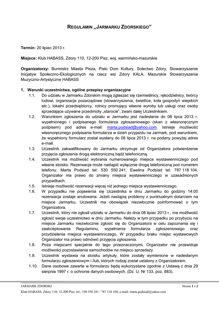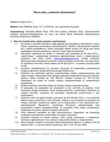 REGULAMIN „JARMARKU ZDORSKIEGO” Termin: 20 lipiec 2013 r. Miejsce: Klub HABASS, Zdory 110, 12-200 Pisz, woj. warmińsko-mazurskie Organizatorzy: Burmistrz Miasta Pisza, Piski Dom Kultury, Sołectwo Zdory, Stowarzyszenie Inicjatyw Społeczno-Ekologicznych na rzecz wsi Zdory KALA, Mazurskie Stowarzyszenie Muzyczno-Artystyczne HABASS 1. Warunki uczestnictwa, ogólne przepisy organizacyjne 1.1. Do udziału w Jarmarku Zdorskim mogą zgłaszać się rzemieślnicy, rękodzielnicy, twórcy ludowi, organizacje pozarządowe (stowarzyszenia, świetlice, koła gospodyń wiejskich etc.), lokalni przedsiębiorcy, rolnicy promujący własne wyroby lub usługi oraz osoby sprzedające używane przedmioty „starocie”, zwani dalej Uczestnikiem. 1.2. Warunkiem zgłoszenia do udziału w Jarmarku jest nadesłanie do 08 lipca 2013 r. wypełnionego i podpisanego formularza zgłoszeniowego (skan z własnoręcznym podpisem) pod adres e-mail: [email protected]. Istnieje możliwość własnoręcznego podpisania formularza w dzień przyjazdu na Jarmark, pod warunkiem, że wypełniony formularz został wysłany do 08 lipca 2013 r. na podany powyżej adres e-mail. 1.3. Uczestnik zakwalifikowany do Jarmarku otrzymuje od Organizatora potwierdzenie przyjęcia zgłoszenia drogą elektroniczną bądź telefoniczną. 1.4. Uczestnik ma możliwość wybrania numerowanego miejsca wystawienniczego pod własne stoisko. Rezerwacja może nastąpić wyłącznie drogą telefoniczną pod numerem telefonu: Marta Podsiad tel: 530 550 241, Ewelina Podsiad tel: 787 118 104. Organizator ma prawo do zmiany miejsca wystawienniczego w uzasadnionych przypadkach. 1.5. Istnieje możliwość rezerwacji więcej niż jednego miejsca wystawienniczego. 1.6. W przypadku nie pojawienia się Uczestnika w dniu Jarmarku do godziny 14:00 rezerwacja zostaje anulowana. Jeżeli nastąpią problemy z punktualnym dotarciem na miejsce Jarmarku, Uczestnik ma obowiązek niezwłocznie poinformować o tym Organizatora. 1.7. Uczestnik, który nie zgłosił udziału w Jarmarku do dnia 08 lipiec 2013 r., ma możliwość zgłosić swoje uczestnictwo w dniu Jarmarku. Należy w tym przypadku po przybyciu na miejsce Jarmarku niezwłocznie zgłosić się do Organizatora w celu zapoznania się i zaakceptowania Regulaminu, wypełnienia formularza zgłoszeniowego oraz przydzielenia miejsca wystawienniczego. W przypadku braku miejsc wystawowych Organizator ma prawo odmówić przyjęcia zgłoszenia. 1.8. Poza miejscami specjalnie do tego przeznaczonymi, Organizator nie przewiduje możliwości pozostawiania samochodów na miejscu sprzedaży. 1.9. Uczestnik wystawia na stoisku artykuły, które zostały wymienione w nadesłanym formularzu zgłoszeniowym i /lub, których rodzaj został ustalony z Organizatorem. 1.10. Dane osobowe zawarte w formularzu będą wykorzystane zgodnie z Ustawą z dnia 29 sierpnia 1997 r. o ochronie danych osobowych. (Dz. U. Nr 133, poz. 883). JARMARK ZDORSKI Klub HABASS; Zdory 110; 12-200 Pisz; tel.: 530 550 241 / 787 118 104; e-mail: [email protected] Strona 1 z 2 1.11. Organizator zastrzega sobie prawo odmowy przyjęcia zgłoszenia bez podania przyczyny. 1.12. Uczestnik jest zobowiązany do poinformowania organizatora o rezygnacji z uczestnictwa w Jarmarku do 7 dni przed datą odbycia się Jarmarku tj. 13 lipca 2013 r. 2. Organizacja stoisk i przepisy porządkowe 2.1. Uczestnik Jarmarku ma obowiązek prowadzić działalność stoiska w godzinach 14:00-19:00. Uczestnik ma obowiązek opuścić teren wystawienniczy Jarmarku do godziny 22:00. 2.2. Teren wystawienniczy będzie udostępniony od godziny 10:00 w dniu Jarmarku. 2.3. Organizator zapewnia Uczestnikowi Jarmarku miejsce do przygotowania stoiska. 2.4. Uczestnik Jarmarku zorganizuje swoje stoisko zgodnie z ustaloną lokalizacją, przestrzegając wyznaczonej dla tego stoiska przestrzeni wystawienniczej. 2.5. Wymagany jest estetyczny wygląd każdego stoiska. 2.6. Za utrzymanie porządku i czystości stoiska odpowiada Uczestnik. 2.7. Organizator ma prawo do wyłączenia ze sprzedaży stoiska/towaru niezgodnego z podanym w zgłoszeniu i charakterem Jarmarku. 2.8. Wynajęte stoisko przeznaczone jest wyłącznie dla Uczestnika Jarmarku. 2.9. Obowiązuje zakaz wystawiania i reklamy towaru poza wyznaczonym miejscem. 2.10. Osoby obsługujące stoiska, na których prowadzi się sprzedaż lub dystrybucję artykułów spożywczych, artykułów alkoholowych oraz innych produktów są zobowiązane do posiadania odpowiednich zezwoleń i uprawnień do prowadzenia tego typu działalności. 2.11. Uczestnicy Jarmarku zobowiązani są do przestrzegania obowiązujących przepisów na terenie jarmarku, wprowadzenia do obrotu handlowego towarów odpowiednio oznakowanych, posługiwania się narzędziami pomiarowymi legalizowanymi, przestrzegania terminów przydatności do spożycia i trwałości towarów spożywczych przeznaczonych do sprzedaży oraz prawidłowego użytkowania stoiska według regulaminu. 2.12. Organizator nie ponosi odpowiedzialności za obowiązki Uczestników Jarmarku określone w Regulaminie. 2.13. Organizator nie pokrywa kosztów związanych z uczestnictwem w Jarmarku. 2.14. Uczestnik ubezpiecza artykuły handlowe, reklamowe, urządzenia wystawowe we własnym zakresie. 2.15. Organizator nie odpowiada za uszkodzenia towarów i szkody spowodowane kradzieżą, wandalizmem, działaniem sił przyrody oraz innymi wypadkami losowymi. 3. Przepisy końcowe 3.1. W przypadku nie stosowania się do ustaleń Regulaminu Organizator może zdecydować o wykluczeniu uczestnika z Jarmarku. 3.2. Ewentualne uwagi Uczestników powinny być niezwłocznie zgłaszane w formie pisemnej lub ustnej Organizatorowi Jarmarku. 3.3. Przypadki nieuwzględnione w Regulaminie będą rozstrzygane na podstawie Kodeksu Cywilnego i innych właściwych przepisów obowiązującego prawa. 3.4. Wysłanie wypełnionego formularza zgłoszeniowego jest jednoznaczne z akceptacją niniejszego Regulaminu i jest warunkiem uczestnictwa w Jarmark
