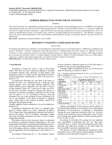 Roman HEJFT, Sławomir OBIDZIŃSKI Politechnika Białostocka, Wydział Budownictwa i Inżynierii Środowiska, Zakład Inżynierii Rolno-Spożywczej i Leśnej ul. Wiejska 45E, 15-351 Białystok, Poland e-mail: [email protected] FODDER BRIQUETTES WITH STRAW CONTENT Summary The article presents the relationships between unit power consumption of the briquetting process N i [kWh/ton of product] and briquette density as a function of the following parameters: moisture content of fodder mixture U , clearance coefficient of matrix P, length of matrix openings L, angle of entrance into opening E, gap between matrix and densification roll Ss, diameter of densification roll RR1, percentage straw content S, average length of straw particles Lt.. The influence of gap between the matrix and densification roll Ss, and diameter of densification roll RR1 on briquette density was discovered to be immaterial. Key words: briquetting, briquette quality, straw, fodder BRYKIETY PASZOWE Z UDZIAŁEM SŁOMY Streszczenie W artykule przedstawiono zależności energochłonności jednostkowej procesu brykietowania N i [kWh/tonę produktu] oraz gęstości brykietów w funkcji wilgotności mieszanki paszowej U, współczynnika prześwitu matrycy P, długości otworów w matrycy L, kąta wejścia do otworu E, szczeliny pomiędzy matrycą a rolką zagęszczającą Ss, średnicy rolki zagęszczającej RR1, procentowej zawartość słomy S, średniej długości cząstek słomy L t. Wpływ szczeliny pomiędzy matrycą a rolką zagęszczającą Ss, średnicy rolki zagęszczającej RR1, na gęstość brykietów okazał się nieistotny. Słowa kluczowe: brykietowanie, jakość brykietu, słoma, pasza of straw should be within the range of 10-18% that makes it possible to carry out the briquetting process. Example fodder formulations in [%], e.g. for bovine animals for fattening, are shown in table 1. 1. Introduction According to Dunaj [5], straw is ripe or dried plant stalks. This term has been commonly adopted to describe corn plants, legumes, flax, and rape. As these plants’ seed production waste, it is widely used in agricultural and horticultural production, construction, as well as the power industry [7, 8]. As reported by Denisiuk [4], raw fibre is the basic ingredient of straw. It is characterized by a high dry mass content (approx. 85%) and high sorption capacities. The oldest method of straw utilization was, and still is, using it as litter material. Since 1977, a decrease in straw use as litter has been recorded, caused by, among other factors, a reduction in livestock, including a reduction by 30% in the case of cattle [7, 8, 17]. According to Krzywy [18] and Kusińska [19], one of the methods of straw utilization is its use as soil fertilizer in the form of manure or chopped straw, which leads to the creation of humus, which is its biological transformation form. Another method of straw utilization is its use in fodder production [17]. According to Flachowski [6], straw is a valuable ingredient of volume fodder (e.g. corn), consisting of approx. 75% of high-value food ingredients (cellulose and hemicellulose) and approx. 25% of worthless ingredients (lignin and other incrusting substances and ash, as well as nearly indigestible protein). The dietary value of straw increases when it is subjected to leaching or ammonia treatment (depending on the used technology) both before and during the briquetting process, in the course of which shredding of particles causes relaxation of the lignin-cellulose complex, and thus easier access to food ingredients for microorganisms in the rumen [6, 11, 13]. According to Flachowski [6, 11, 13], moisture content Roman HEJFT, Sławomir OBIDZIŃSKI Tab. 1. Example fodder formulations in [%], e.g. for bovine animals for fattening [11, 13] Tab. 1. Przykładowe receptury pasz w [%] np. dla bydła [11, 13] Mixture ingredient Straw Dried green fodder Dried beet chips Beet pulp Corn grain (50% of wheat, 50% of barley) Post-extraction meal Urea Mineral mixture Ingredient content [%] Fodder I Fodder II Fodder III Fodder IV 30 40 40 50 - 10 - - 10 - 10 - 10 20 10 - 51.5 41.5 36 35.5 5 5 - - 1 2.5 1 2.5 1.5 2.5 2 2.5 Energy consumption of the process and the quality of the final product depend on the technical and technological parameters of the processes of pelleting or briquetting. Among the most important parameters there are: moisture content of the material, process temperature, type of material, working area, length, diameter, matrix opening geometry [9, 12, 20, 21, 23]. According to Zawiślak [23], among the raw materials most susceptible to pelleting there are: low fibre postextraction corn, as well as most post-extraction meals. Raw materials with high fibre contents, on the other hand, are less susceptible to pressure agglomeration. The process of straw briquetting, the parameters influencing the course of this process and the quality of obtained briquettes are also presented in papers [1, 2, 22]. 25 „Journal of Research and Applications in Agricultural Engineering” 2016, Vol. 61(1) A compromising solution is to mix a material with elevated moisture content with a dry material, which leads to a reduction of the average moisture content. The elevated moisture content of one of the materials will also activate the mechanism of non-pressure pelleting – combining dusty particles of dry material through liquid bridges into agglomerates that are several times larger. 2. Production of fodder briquettes Production of briquetted fodder is carried out according to the diagram presented in fig. 1. Pressure agglomeration – pelleting, briquetting The high dynamic loads of pelleting and briquetting working systems result in their relatively high energy consumption and fast wear, at high production costs. Research studies performed by the authors et al. make it possible to promote low-throughput universal devices pelleting and briquetting plant materials that may produce ecological solid fu
