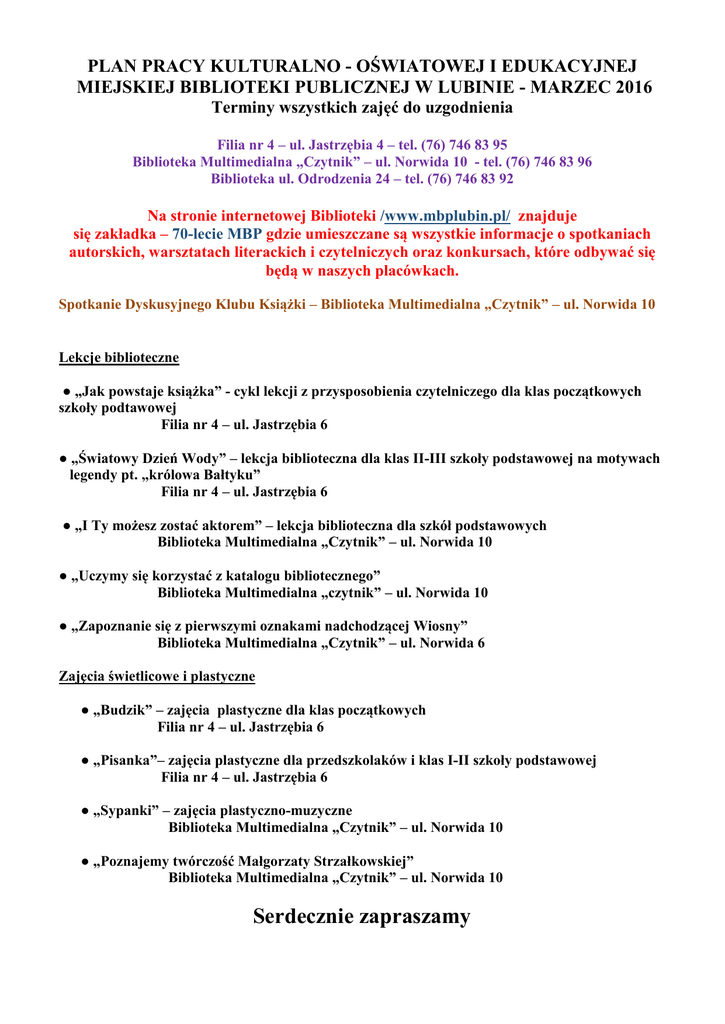 PLAN PRACY KULTURALNO - OŚWIATOWEJ I EDUKACYJNEJ MIEJSKIEJ BIBLIOTEKI PUBLICZNEJ W LUBINIE - MARZEC 2016 Terminy wszystkich zajęć do uzgodnienia Filia nr 4 – ul. Jastrzębia 4 – tel. (76) 746 83 95 Biblioteka Multimedialna „Czytnik” – ul. Norwida 10 - tel. (76) 746 83 96 Biblioteka ul. Odrodzenia 24 – tel. (76) 746 83 92 Na stronie internetowej Biblioteki /www.mbplubin.pl/ znajduje się zakładka – 70-lecie MBP gdzie umieszczane są wszystkie informacje o spotkaniach autorskich, warsztatach literackich i czytelniczych oraz konkursach, które odbywać się będą w naszych placówkach. Spotkanie Dyskusyjnego Klubu Książki – Biblioteka Multimedialna „Czytnik” – ul. Norwida 10 Lekcje biblioteczne ● „Jak powstaje książka” - cykl lekcji z przysposobienia czytelniczego dla klas początkowych szkoły podtawowej Filia nr 4 – ul. Jastrzębia 6 ● „Światowy Dzień Wody” – lekcja biblioteczna dla klas II-III szkoły podstawowej na motywach legendy pt. „królowa Bałtyku” Filia nr 4 – ul. Jastrzębia 6 ● „I Ty możesz zostać aktorem” – lekcja biblioteczna dla szkół podstawowych Biblioteka Multimedialna „Czytnik” – ul. Norwida 10 ● „Uczymy się korzystać z katalogu bibliotecznego” Biblioteka Multimedialna „czytnik” – ul. Norwida 10 ● „Zapoznanie się z pierwszymi oznakami nadchodzącej Wiosny” Biblioteka Multimedialna „Czytnik” – ul. Norwida 6 Zajęcia świetlicowe i plastyczne ● „Budzik” – zajęcia plastyczne dla klas początkowych Filia nr 4 – ul. Jastrzębia 6 ● „Pisanka”– zajęcia plastyczne dla przedszkolaków i klas I-II szkoły podstawowej Filia nr 4 – ul. Jastrzębia 6 ● „Sypanki” – zajęcia plastyczno-muzyczne Biblioteka Multimedialna „Czytnik” – ul. Norwida 10 ● „Poznajemy twórczość Małgorzaty Strzałkowskiej” Biblioteka Multimedialna „Czytnik” – ul. Norwida 10 Serdecznie zapraszamy