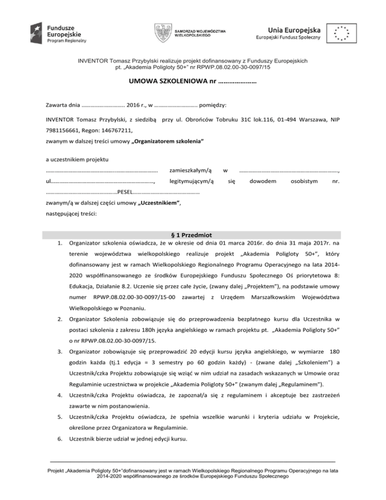 INVENTOR Tomasz Przybylski realizuje projekt dofinansowany z Funduszy Europejskich pt. „Akademia Poligloty 50+” nr RPWP.08.02.00-30-0097/15 UMOWA SZKOLENIOWA nr ………………… Zawarta dnia ……………………….. 2016 r., w ……………………….. pomiędzy: INVENTOR Tomasz Przybylski, z siedzibą przy ul. Obrońców Tobruku 31C lok.116, 01-494 Warszawa, NIP 7981156661, Regon: 146767211, zwanym w dalszej treści umowy „Organizatorem szkolenia” a uczestnikiem projektu ………………………………………..………………………. zamieszkałym/ą ul……………………………………………………………, legitymującym/ą w ……………………………..…………………………., się dowodem osobistym nr. …………………………………………PESEL……………………………………… zwanym/ą w dalszej części umowy „Uczestnikiem”, następującej treści: § 1 Przedmiot 1. Organizator szkolenia oświadcza, że w okresie od dnia 01 marca 2016r. do dnia 31 maja 2017r. na terenie województwa wielkopolskiego realizuje projekt „Akademia Poligloty 50+”, który dofinansowany jest w ramach Wielkopolskiego Regionalnego Programu Operacyjnego na lata 20142020 współfinansowanego ze środków Europejskiego Funduszu Społecznego Oś priorytetowa 8: Edukacja, Działanie 8.2. Uczenie się przez całe życie, (zwany dalej „Projektem”), na podstawie umowy numer RPWP.08.02.00-30-0097/15-00 zawartej z Urzędem Marszałkowskim Województwa Wielkopolskiego w Poznaniu. 2. Organizator Szkolenia zobowiązuje się do przeprowadzenia bezpłatnego kursu dla Uczestnika w postaci szkolenia z zakresu 180h języka angielskiego w ramach projektu pt. „Akademia Poligloty 50+” o nr RPWP.08.02.00-30-0097/15. 3. Organizator zobowiązuje się przeprowadzić 20 edycji kursu języka angielskiego, w wymiarze 180 godzin każda (tj.1 edycja = 3 semestry po 60 godzin każdy) - (zwane dalej „Szkoleniem”) a Uczestnik/czka Projektu zobowiązuje się wziąć w nim udział na zasadach wskazanych w Umowie oraz Regulaminie uczestnictwa w projekcie „Akademia Poligloty 50+” (zwanym dalej „Regulaminem”). 4. Uczestnik/czka Projektu oświadcza, że zapoznał/a się z regulaminem i akceptuje bez zastrzeżeń zawarte w nim postanowienia. 5. Uczestnik/czka Projektu oświadcza, że spełnia wszelkie warunki i kryteria udziału w Projekcie, określone przez Organizatora w Regulaminie. 6. Uczestnik bierze udział w jednej edycji kursu. ___________________________________________________________________________________________________ Projekt „Akademia Poligloty 50+”dofinansowany jest w ramach Wielkopolskiego Regionalnego Programu Operacyjnego na lata 2014-2020 współfinansowanego ze środków Europejskiego Funduszu Społecznego § 2 Zobowiązania Uczestnika 1. Uczestnik zobowiązuje się do ukończenia kursu oraz do przystąpienia do egzaminu końcowego TGLS. 2. Kurs uznaje się za ukończony na podstawie uczestnictwa w min. 80% zajęć (tj. 144 h) według obowiązującego harmonogramu zajęć. 3. Uczestnik zobowiązany jest do potwierdzania każdorazowo obecności na zajęciach własnoręcznym podpisem na liście obecności. 4. Za nieobecność na zajęciach rozumie się każde nie pojawienie się na zajęciach lub opuszczenie istotnej części zajęć. 5. Organizator Szkolenia może usprawiedliwić nieobecność w uzasadnionych przypadkach. 6. Uczestnik oświadcza, że nie będzie uczestniczył w zajęciach i w egzaminie pod wpływem alkoholu lub innych środków odurzających. 7. Uczestnik wyraża zgodę na ewaluację efektów przeprowadzonych szkoleń w okresie do 3 lat od momentu ukończenia przez uczestnika szkolenia. 8. Uczestnik wyraża zgodę na rejestrowanie wizerunku 1 podczas szkoleń organizowanych przez Organizatora Szkolenia oraz wykorzystywanie tego wizerunku poprzez umieszczanie zdjęć np. na stronie internetowej firmy oraz w celu informacji i promocji w trakcie realizacji projektu. § 3 Zobowiązania Organizatora Szkolenia 1. Organizator Szkolenia kierując się swoją wiedzą i doświadczeniem oświadcza, że przygotowany harmonogram szkolenia oraz ujęte w nim tematy są wystarczające do należytego przeprowadzenia szkolenia. 2. Organizator Szkolenia zapewni Uczestnikowi materiały szkoleniowe (podręcznik, ćwiczenia, płyta CD). 3. Po ukończeniu szkolenia Organizator Szkolenia wyda Uczestnikowi zaświadczenie ukończenia kursu. 4. Organizator szkolenia zapewni Uczestnikowi udział w egzaminie sprawdzającym nabytą wiedzę i certyfikat określający poziom biegłości językowej Uczestnika zgodny z Europejskim Systemem Opisu Kształcenia Językowego (TGLS). 5. Organizator Szkolenia nie ponosi odpowiedzialności za rezultat przeprowadzonych szkoleń. 6. Organizator Szkolenia zastrzega sobie możliwość zmiany harmonogramu szkolenia. Organizator Szkolenia informuje Uczestnika o zmianach na bieżąco za pomocą poczty elektronicznej, telefonicznie, listownie lub na stronie internetowej Projektu dostępnej pod adresem www.akademiapoligloty50plus.pl. 1 Podstawa prawna Ustawa o ochronie danych osobowych (tekst jedn.: Dz. U. z 2002 nr 101, poz. 926 ze zm.); Ustawa o prawie autorskim i prawach pokrewnych (tekst jedn.: Dz. U. z 2006 nr 90, poz. 631 ze zm. ___________________________________________________________________________________________________ Projekt „Akademia Poligloty 50+”dofinansowany jest w ramach Wielkopolskiego Regionalnego Programu Operacyjnego na lata 2014-2020 współfinansowanego ze środków Europejskiego Funduszu Społecznego § 4 Kary umowne 1. W przypadku większej niż określona w § 2 ust. 2 liczby nieobecności lub złamania innych istotnych zapisów niniejszej umowy Uczestnik zobowiązuje się do pokrycia kosztów związanych z jego uczestnictwem w projekcie tj. kwoty 3 355,29 PLN, a także do zwrotu kosztów otrzymanych materiałów szkoleniowych lub do zwrotu samych materiałó